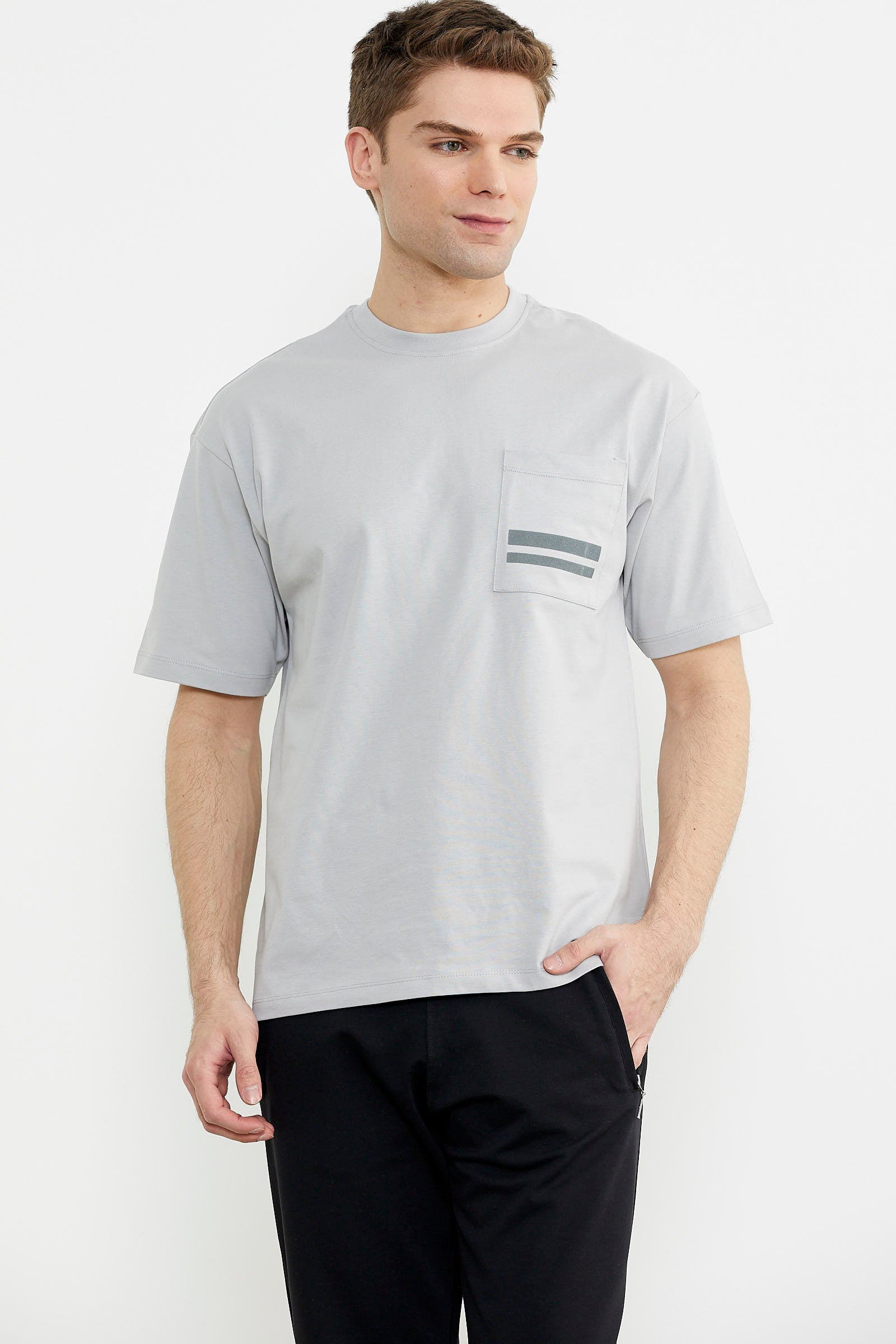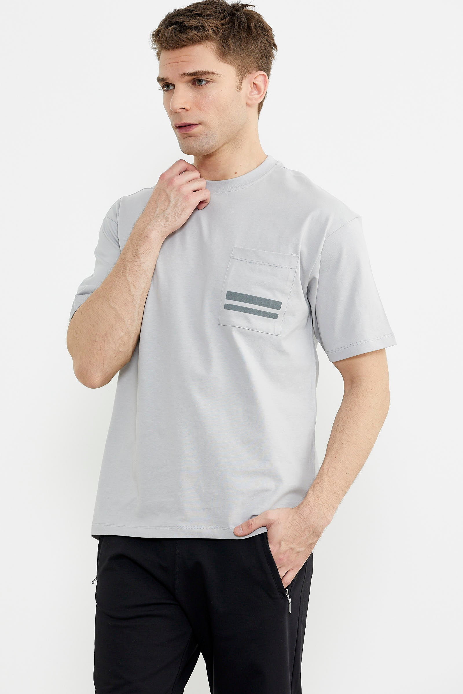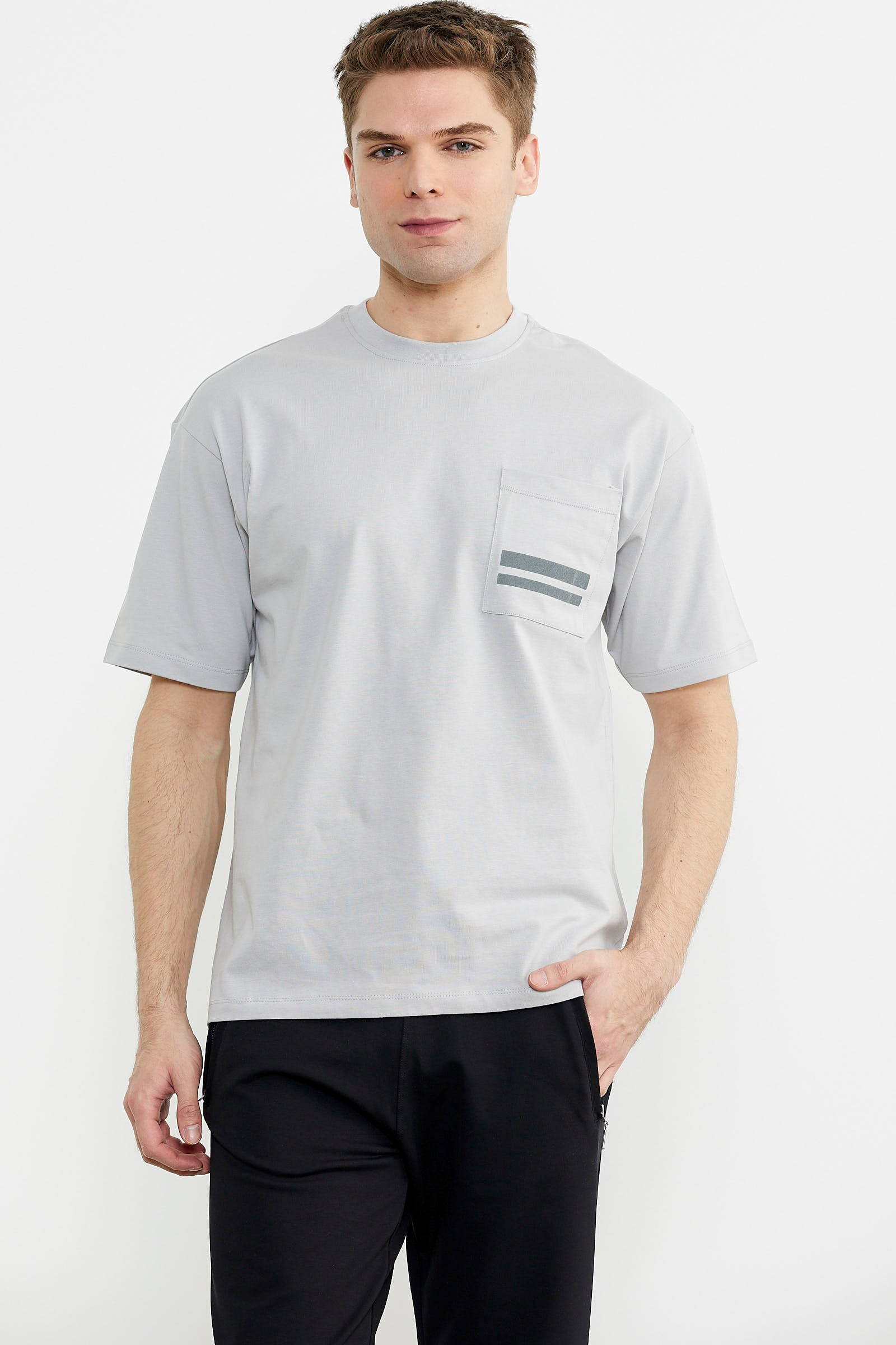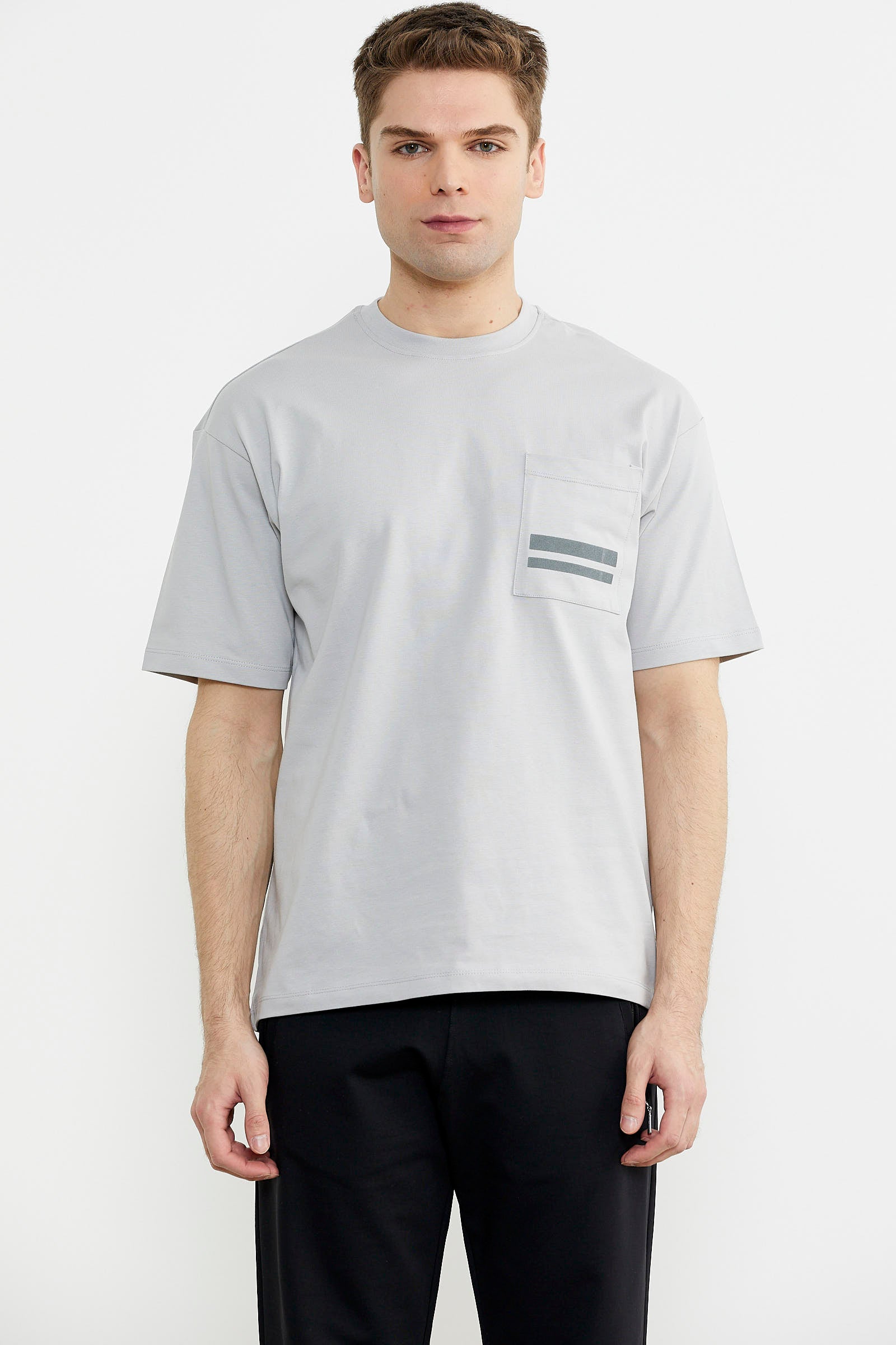 Pamuk kumaştan üretilen tişört, oversize kalıptır. Minimal baskılı göğüs cebi kullanılmıştır.