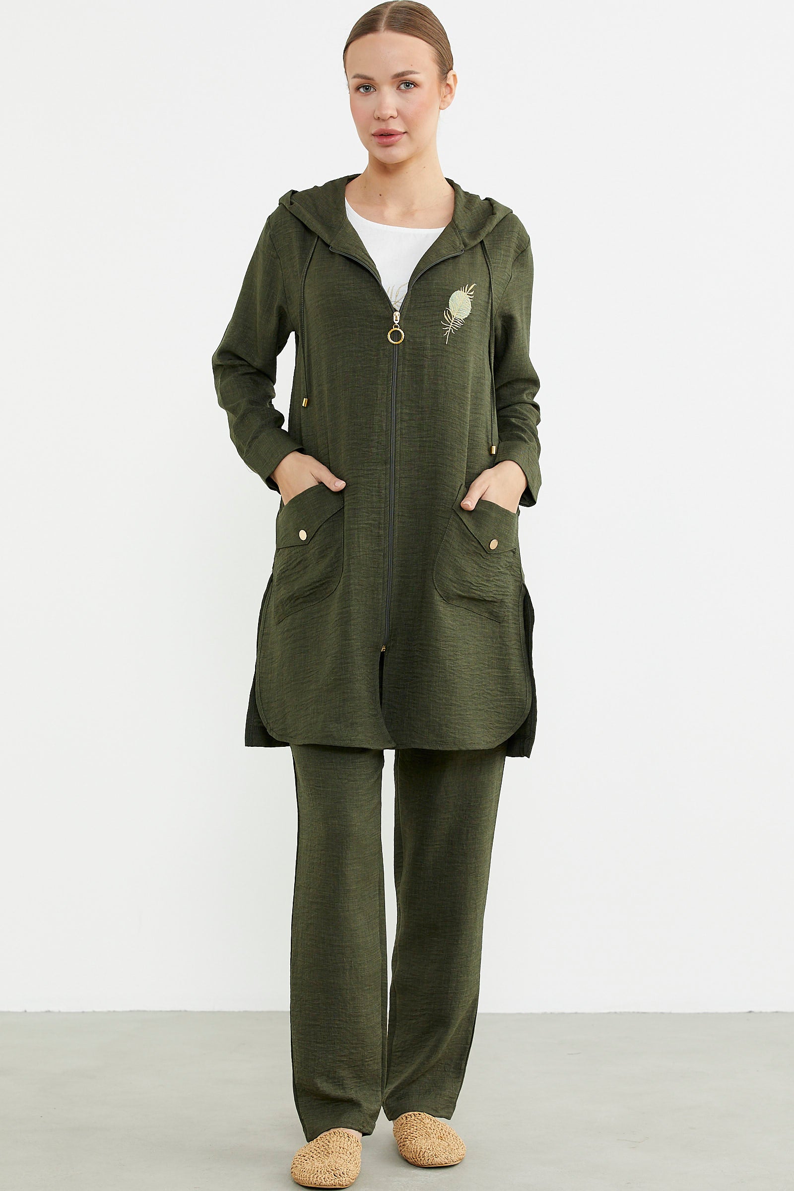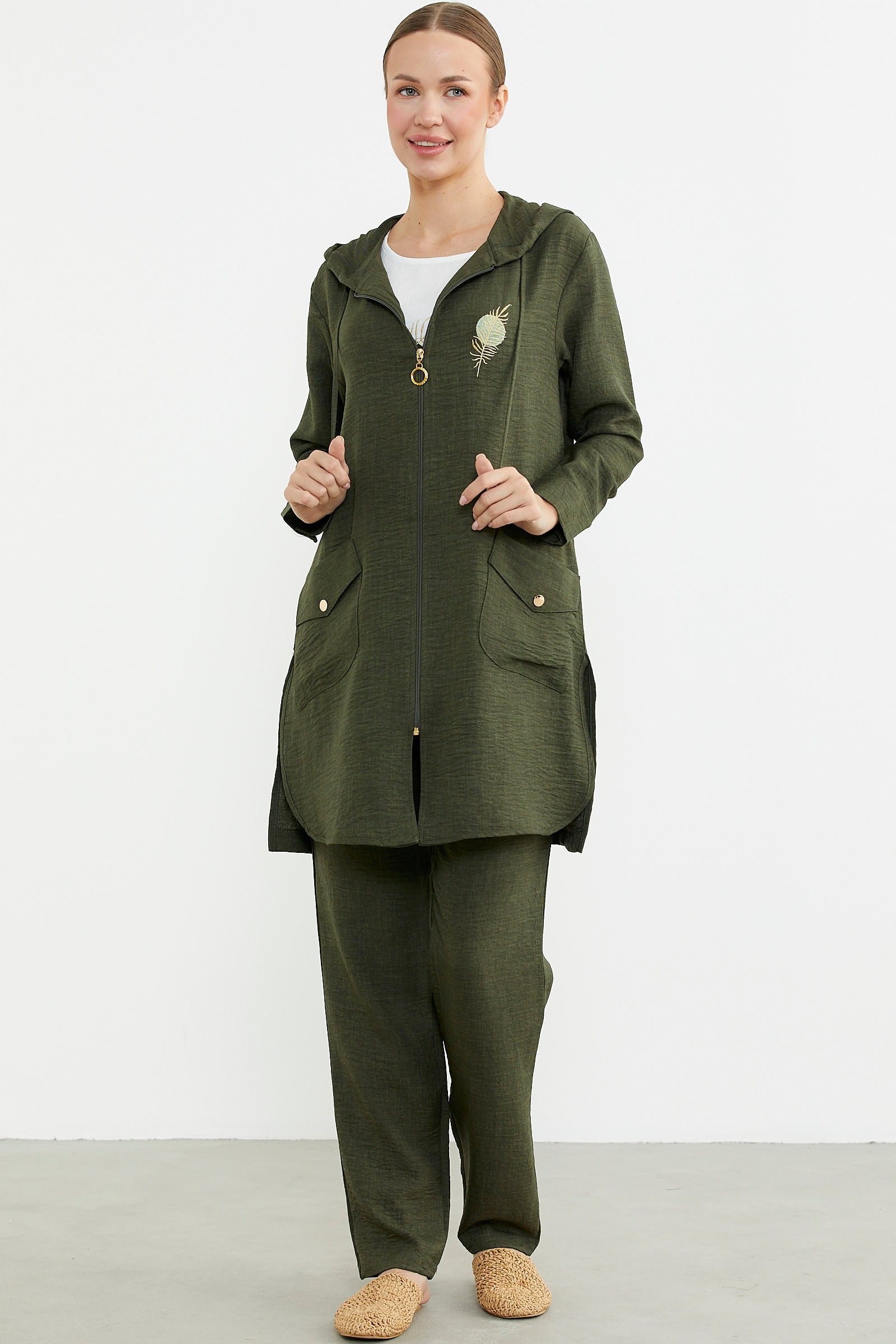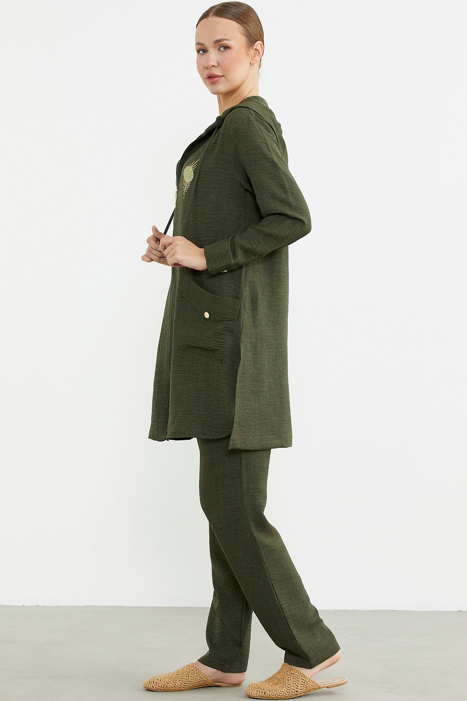 Büyük Beden Keten Görünümlü Üçlü Takım - Haki