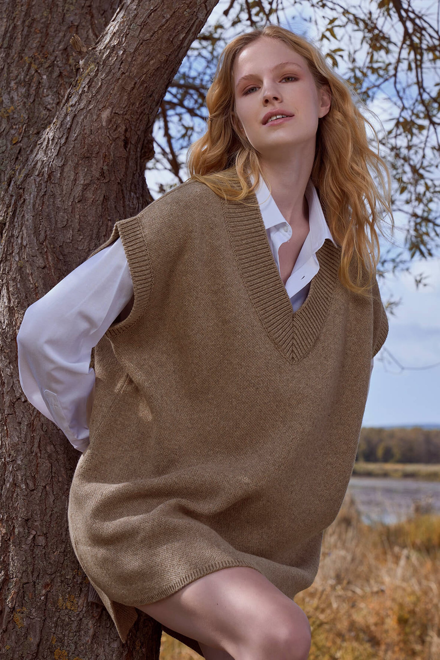 V Yaka Uzun Triko Süveter - Sütlü Kahve
