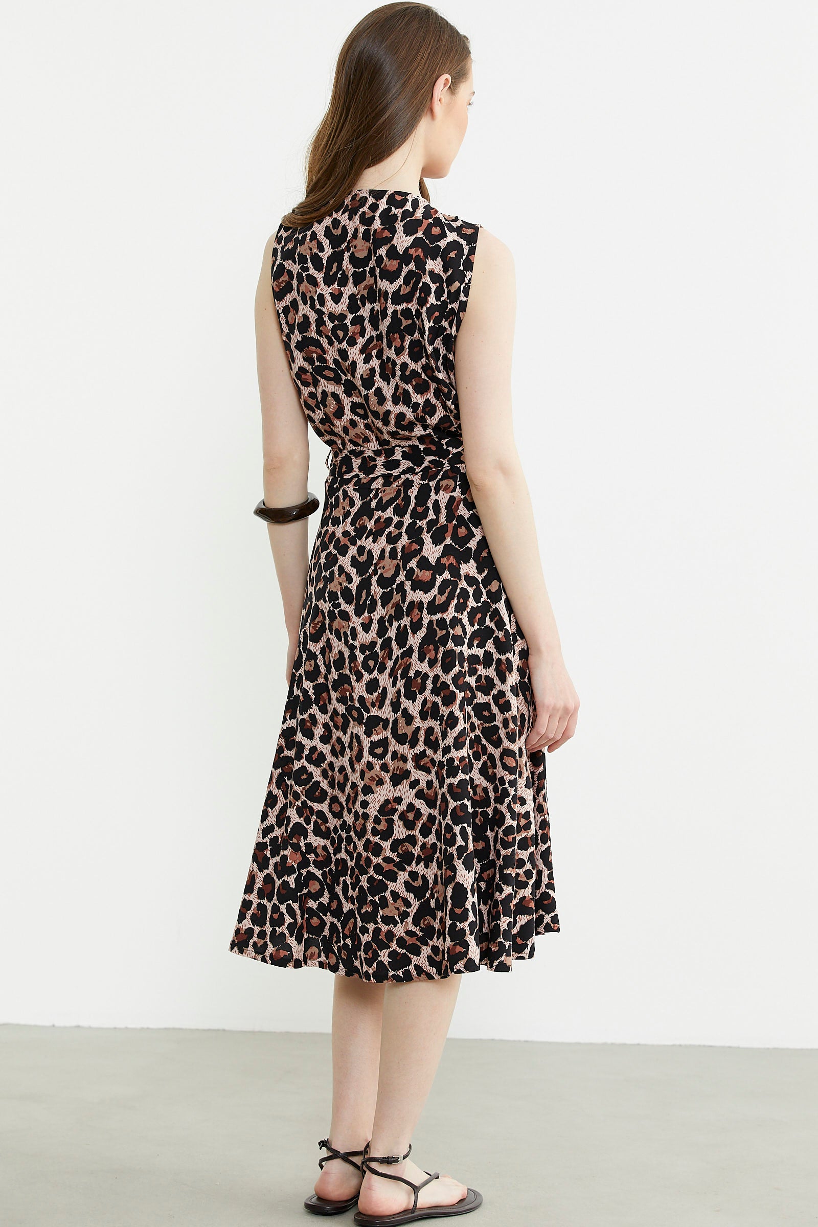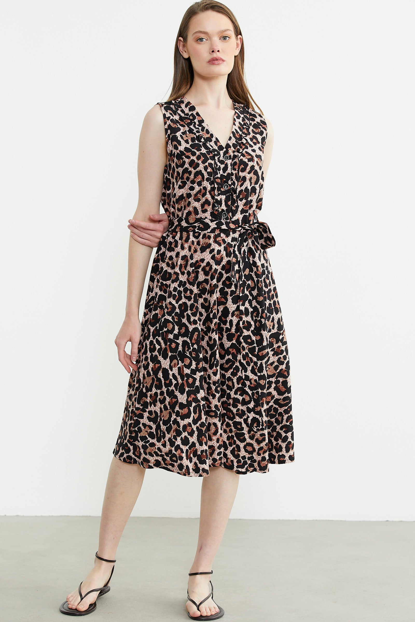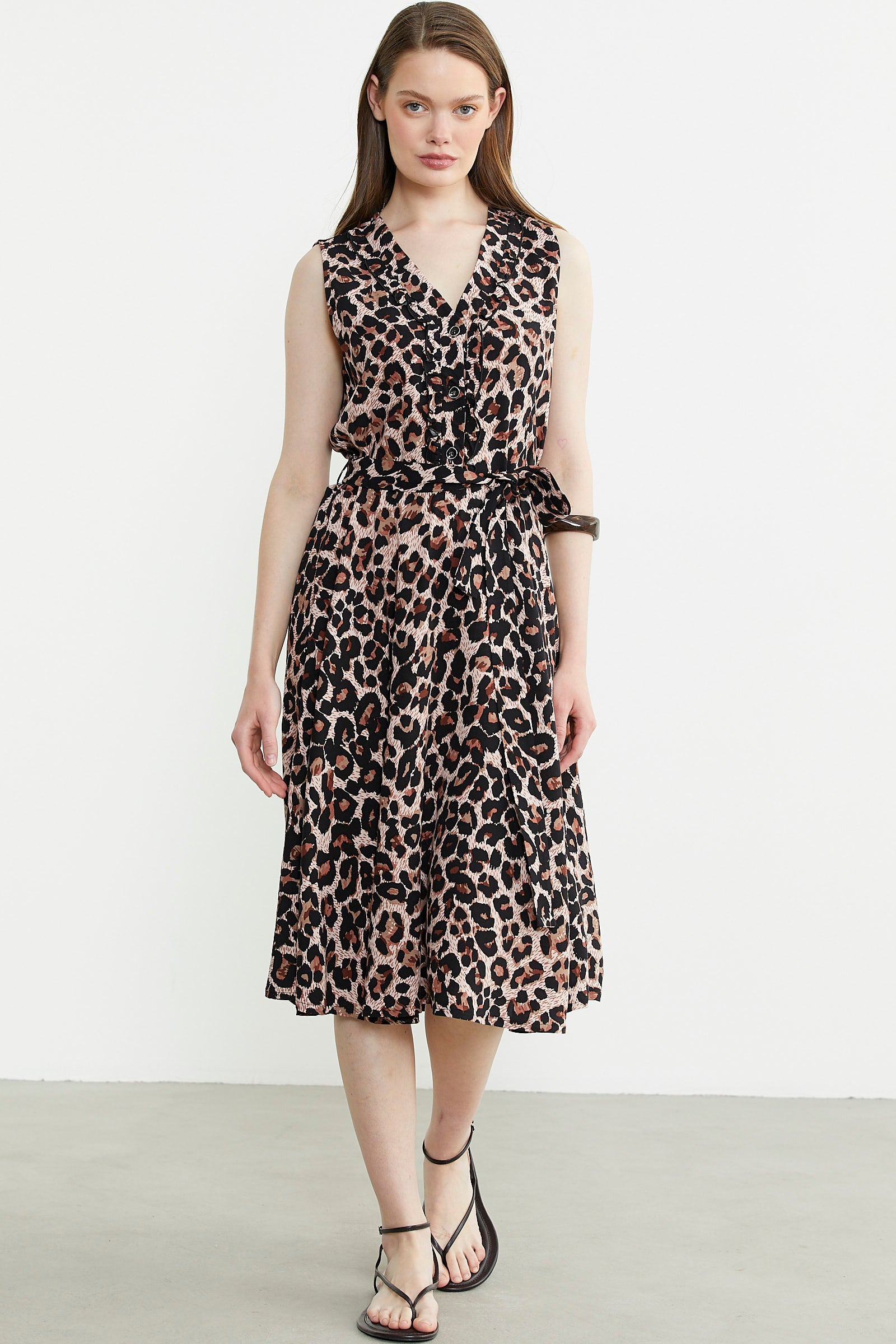 Leopar desenli kumaştan yapılmış midi boy elbise, gündüz şıklığından gece davetlerine kadar her ortamda şık görünmenizi sağlar.