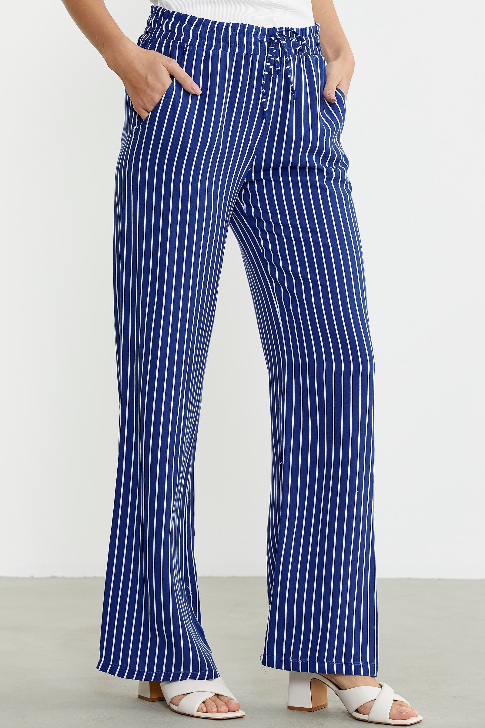 İnce viskoz çizgili dokuma kumaştan pantolon. Lastikli, ince büzgü bağlı, bol kesimli ve geniş paçalıdır.