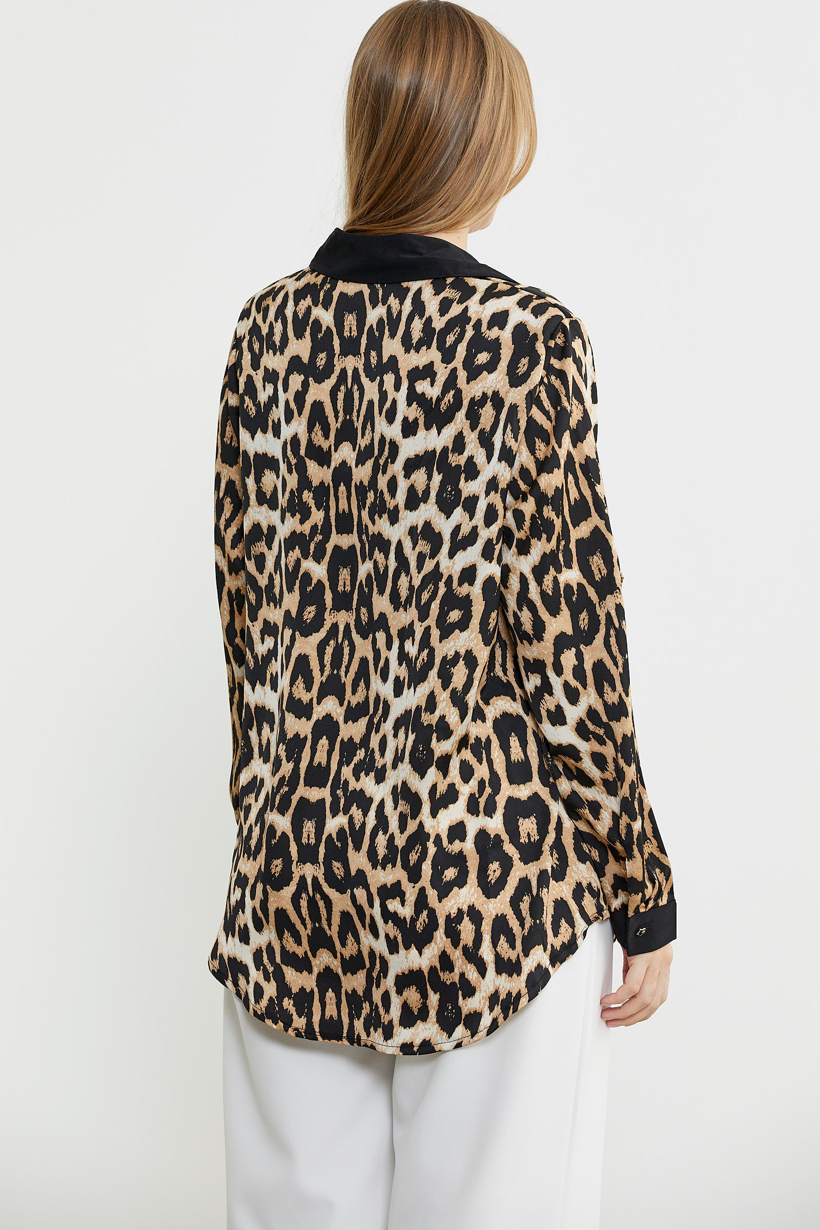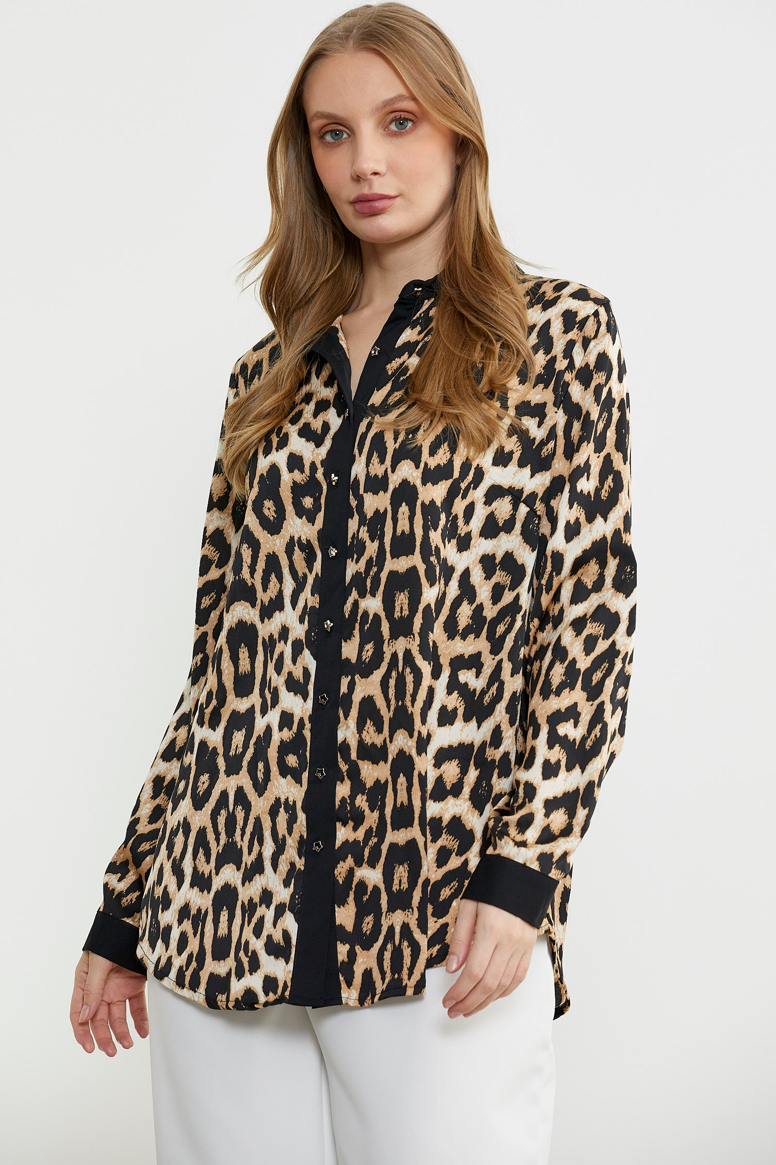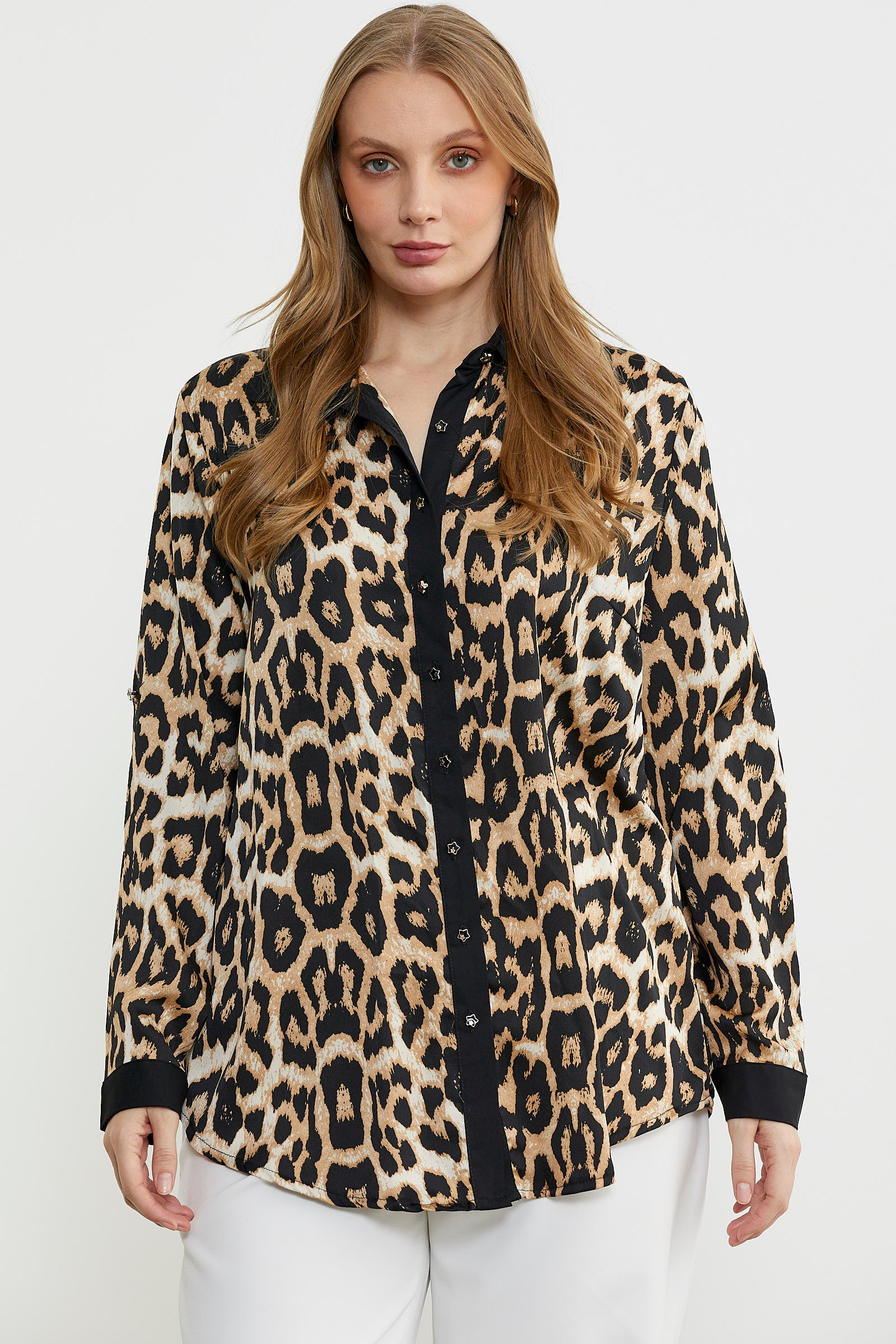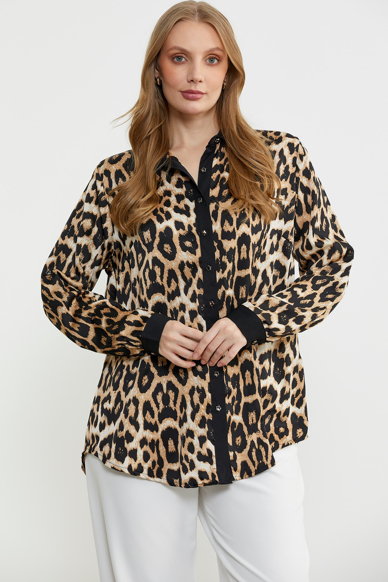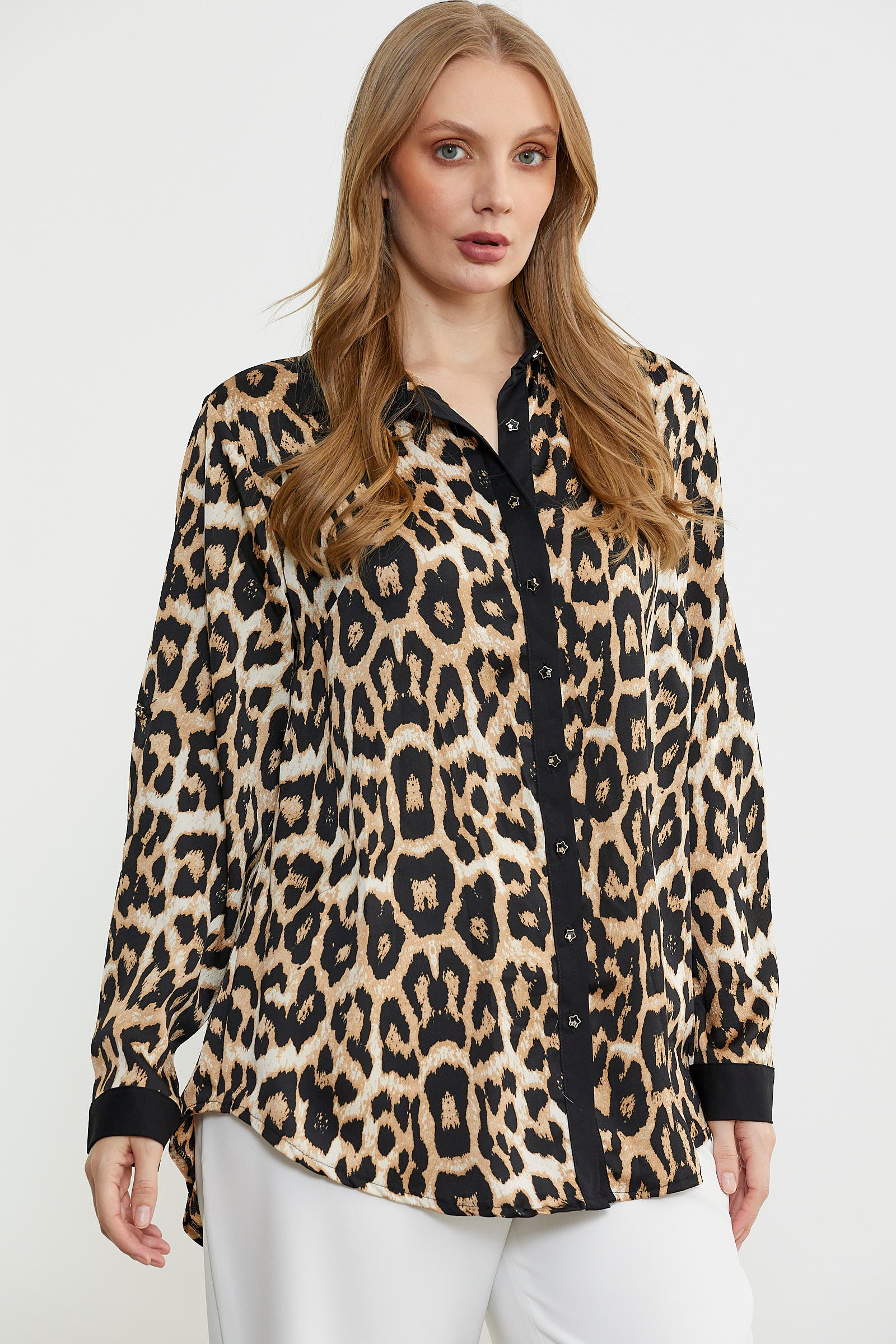 Büyük beden olarak tasarlanan leopar desenli gömlek. Yaka, pat ve manşetlerde düz renk kumaş kullanılarak tamamlanmıştır.