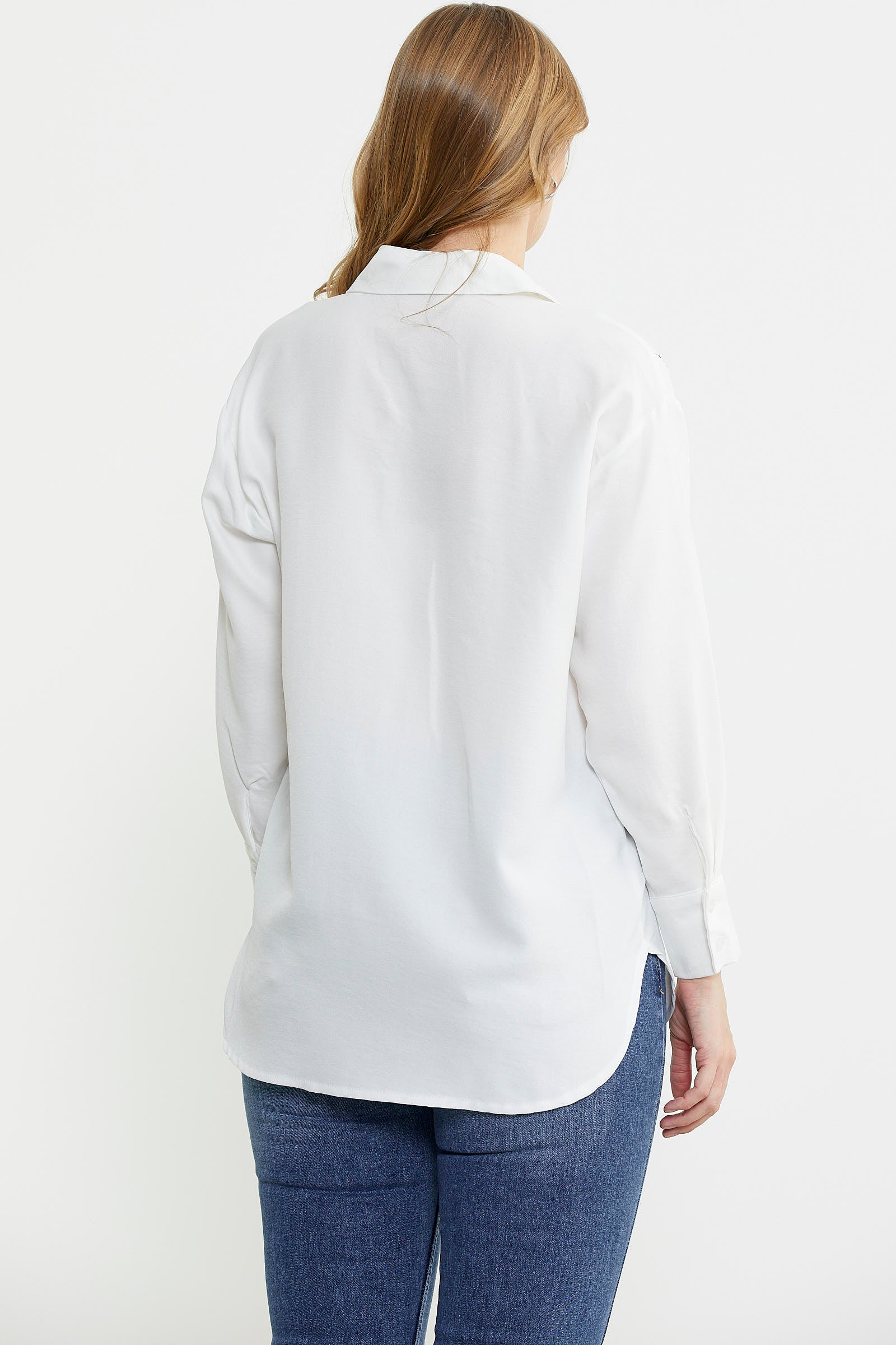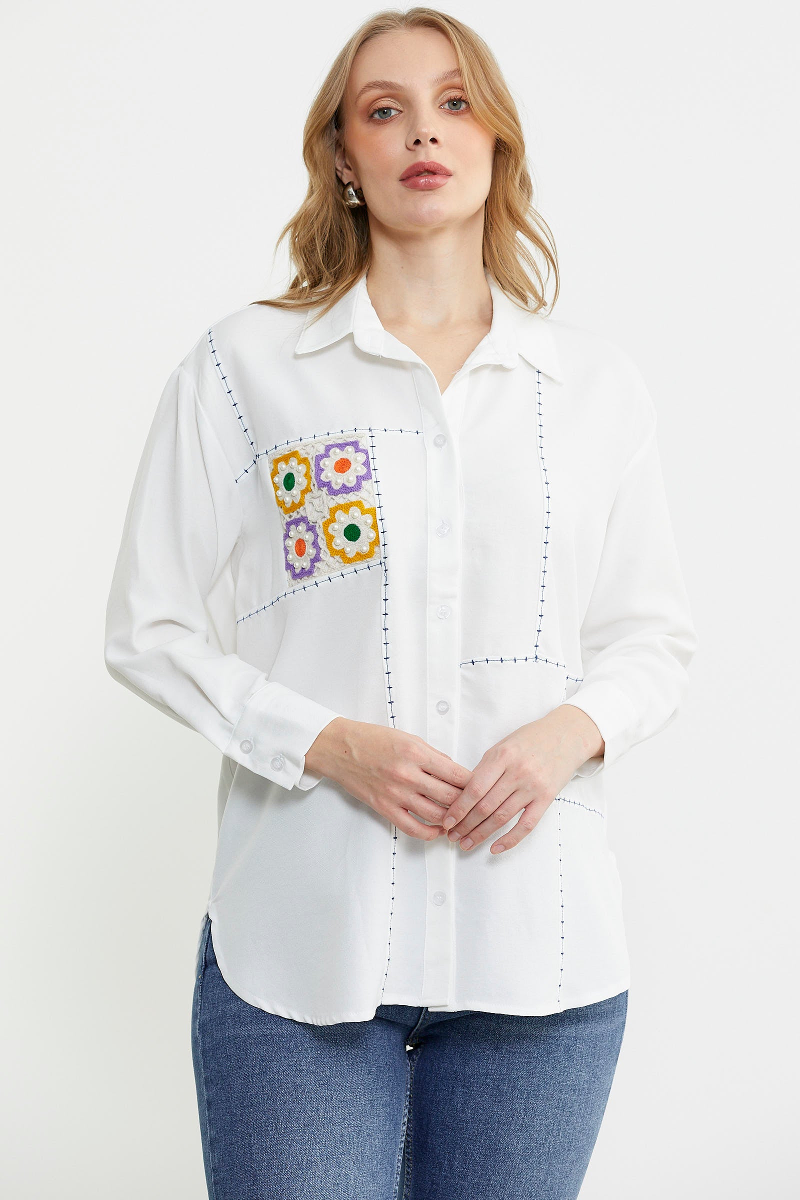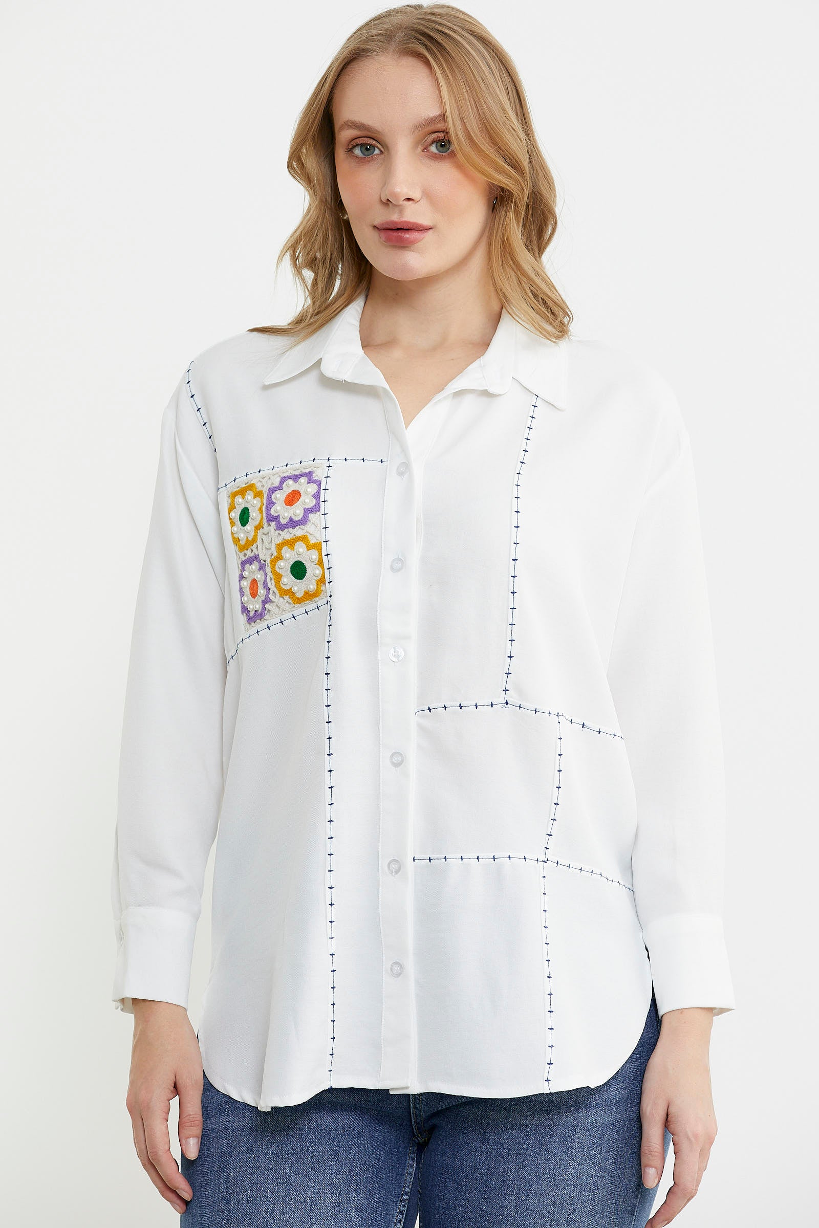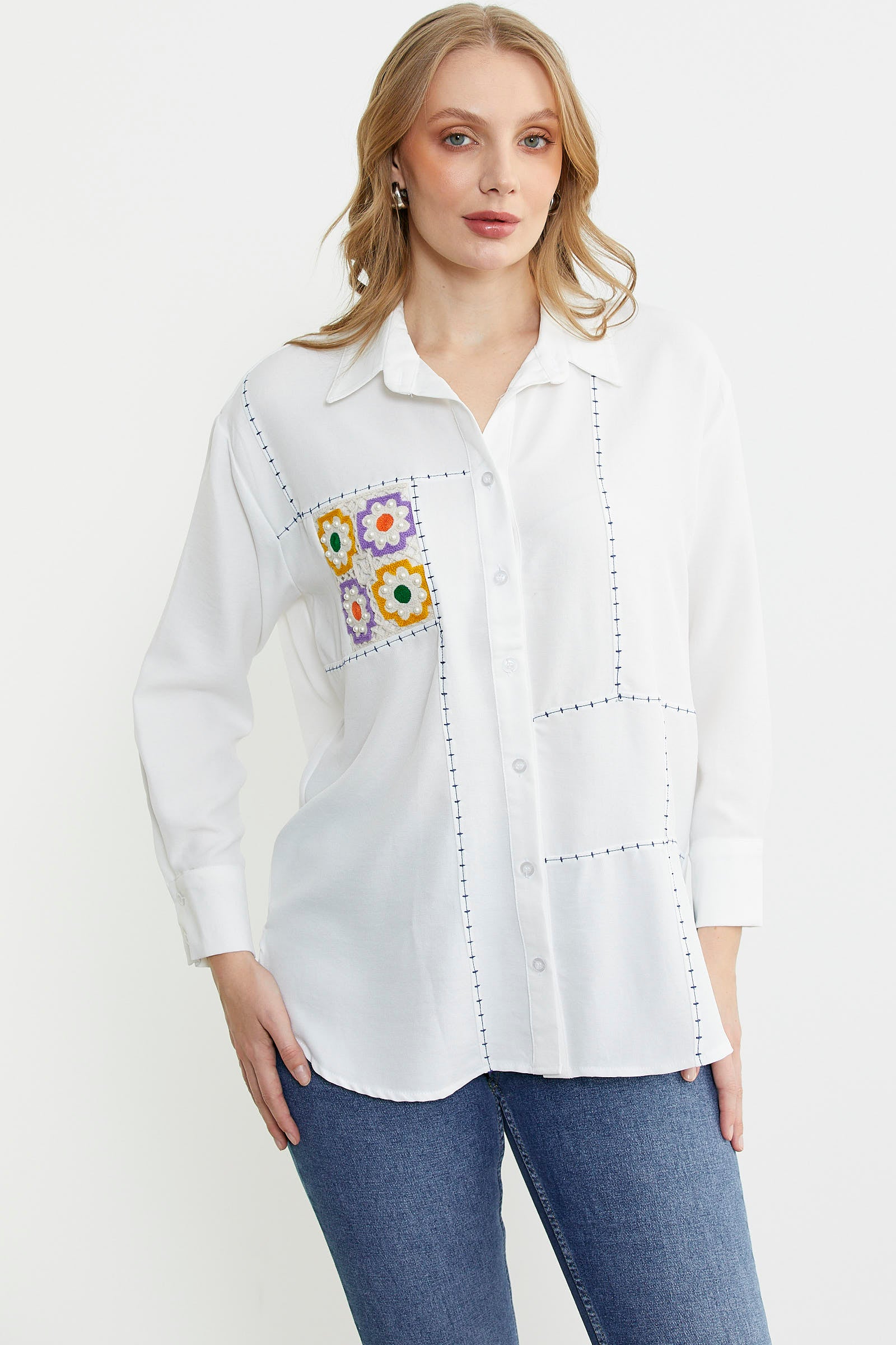 Pamuk içeren gömlek modelinin, ön cepde nostaljik renkli dantel motif kullanılmıştır. Ön bedende kullanılan patcwork detayı ile dinamik görünüm oluşturulmuştur.