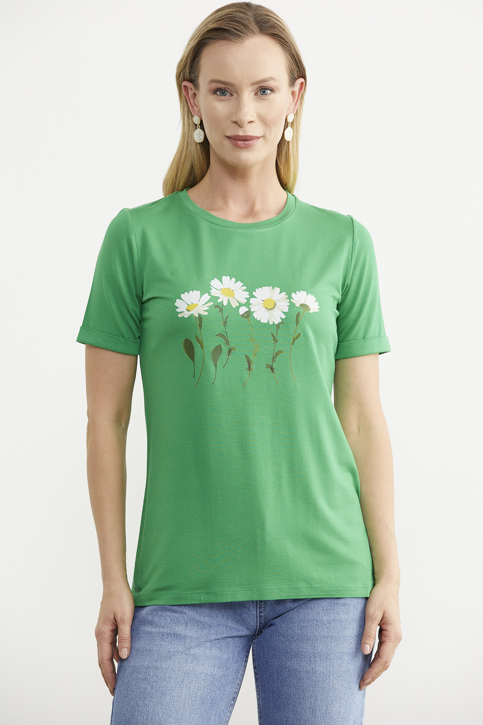 Yaz mevsiminin doğasıyla uyumlu papatya baskılı basic tişört, gardıroplarınızın kurtarıcı parçası olacaktır.
