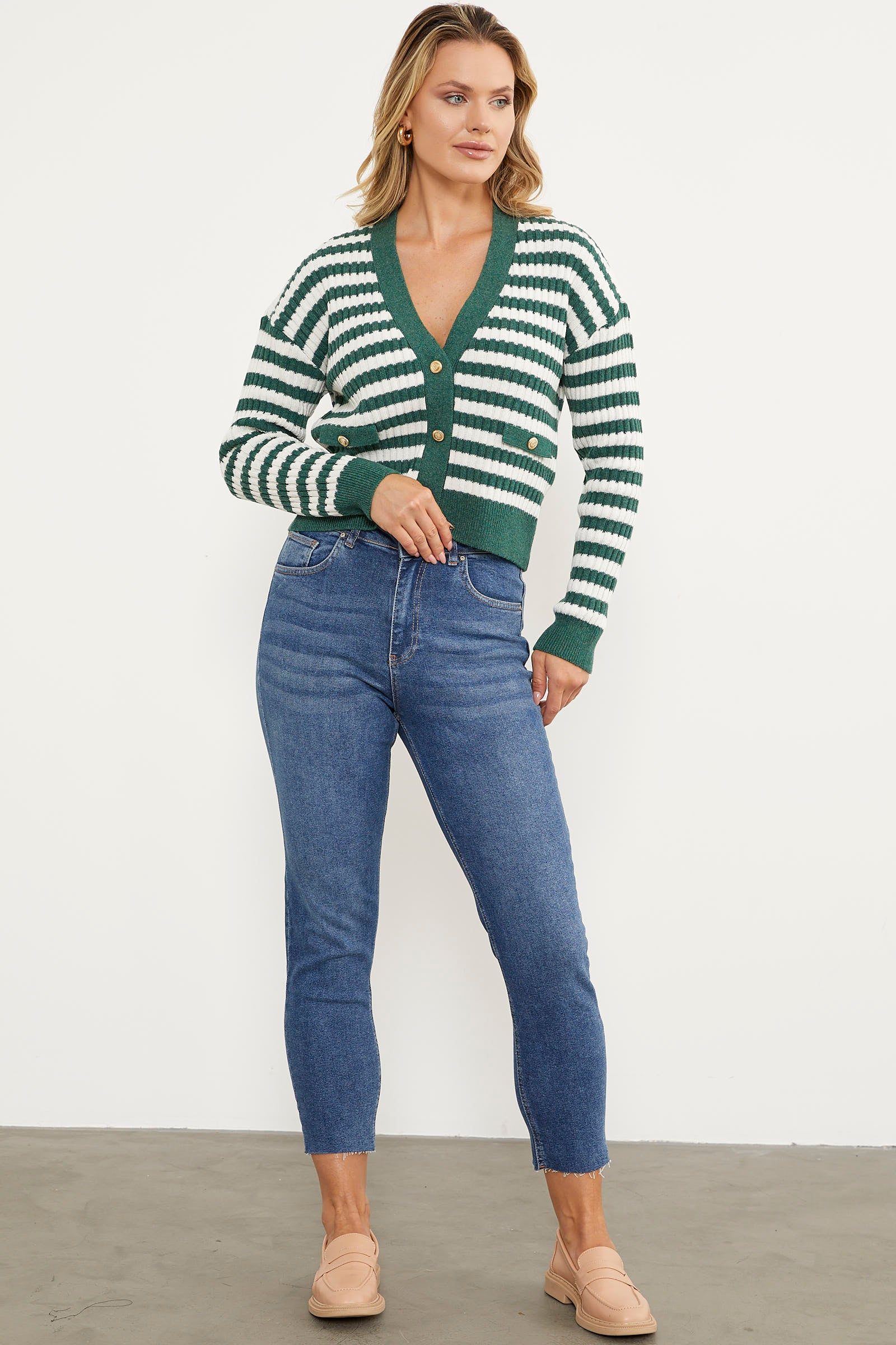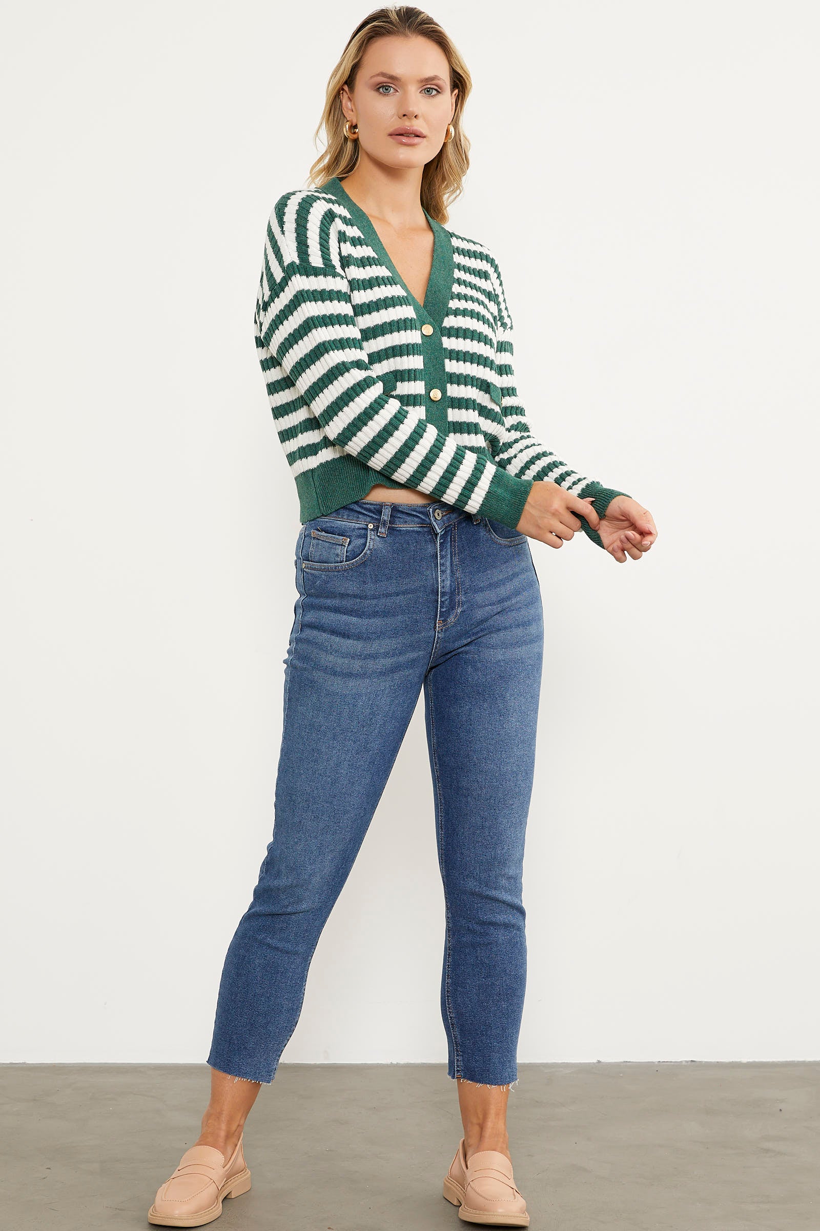 This striped, knitted cardigan with pocket and front button detail, off-shoulder design, and decorative pocket detail will be a frequently used piece of modern times with its eye-catching colors and soft texture. It makes you feel warm with its wool-based texture.