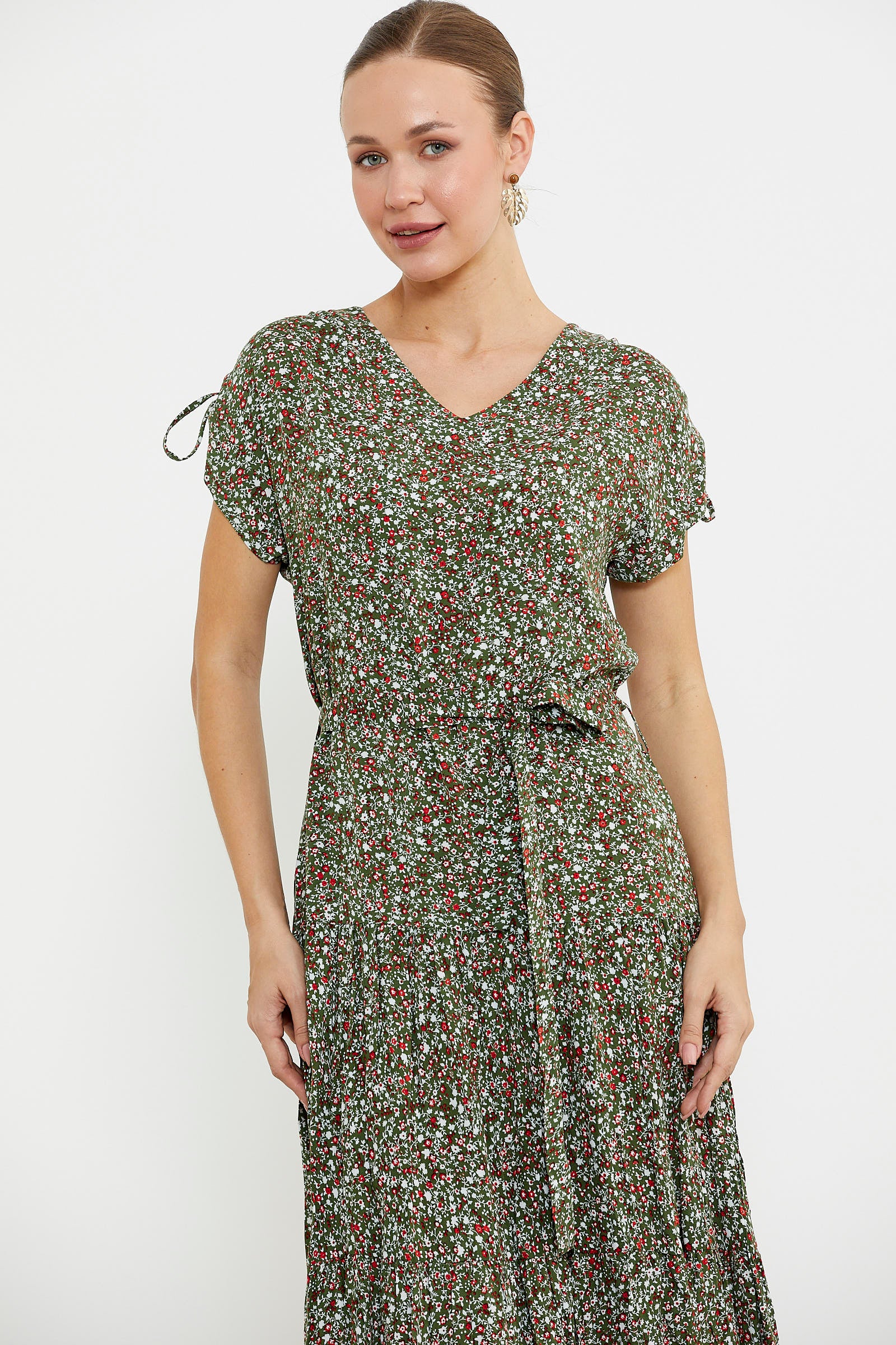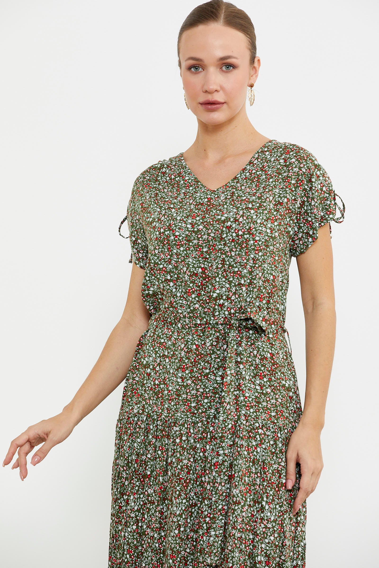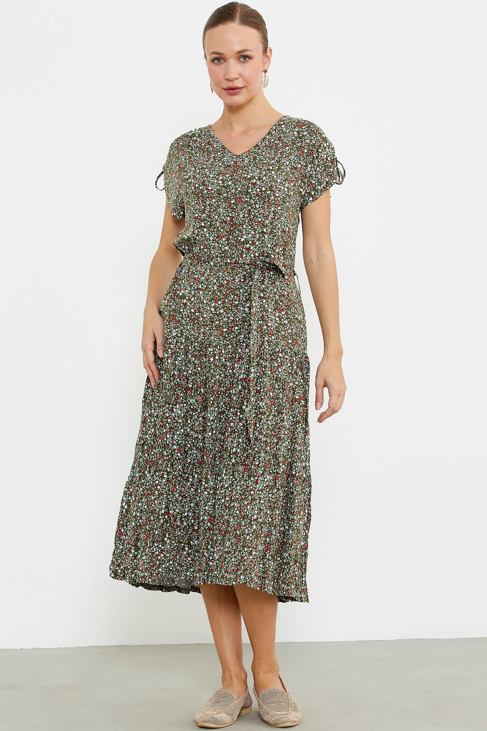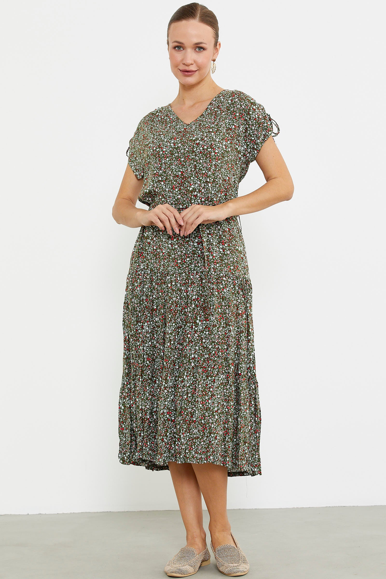Çiçek Desenli Rahat Kalıp Elbise - Yeşil
