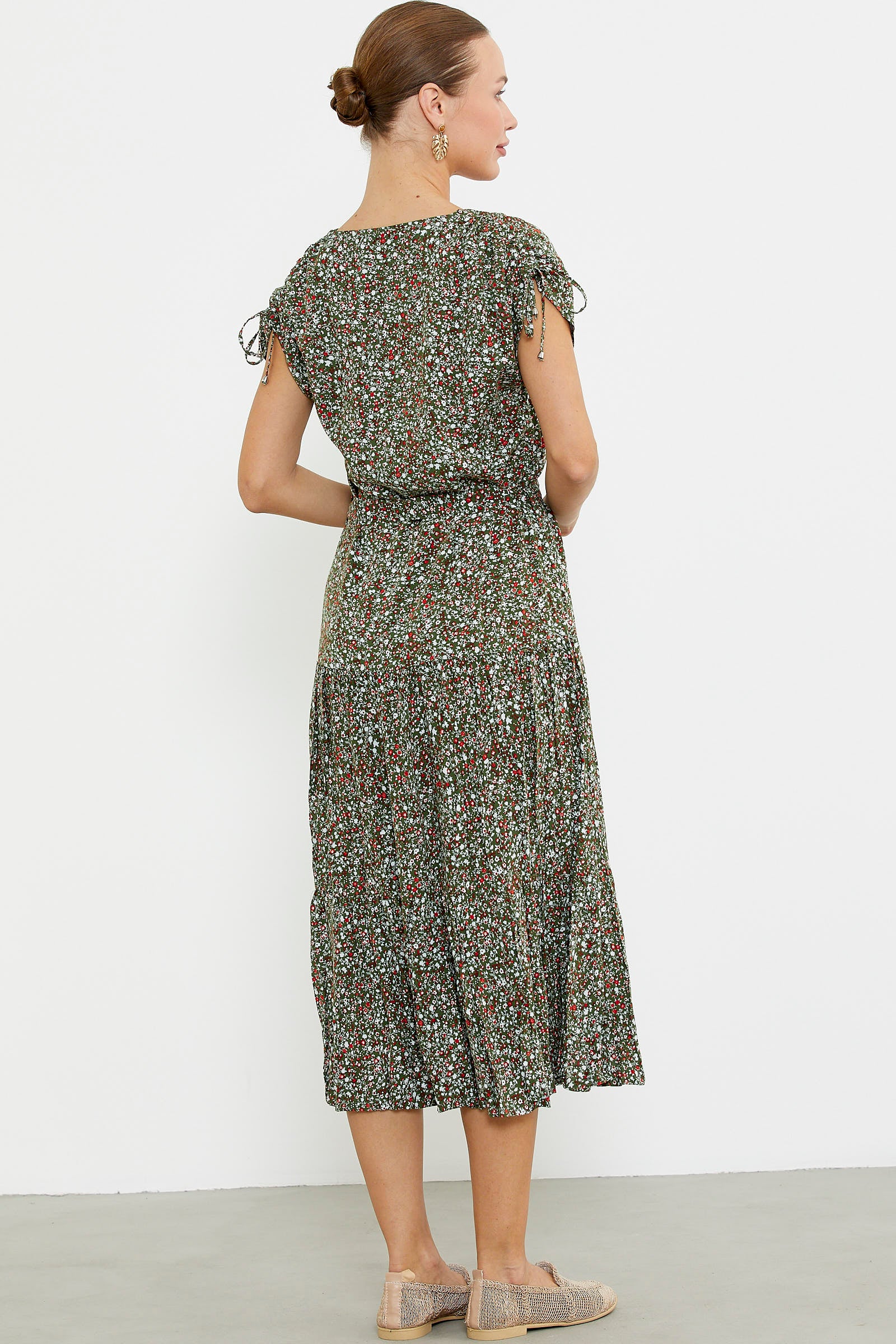 Omuzları ayarlanabilir. V yaka, çiçekli elbise. Midi boy, rahat kalıp ve beli kuşaklıdır.