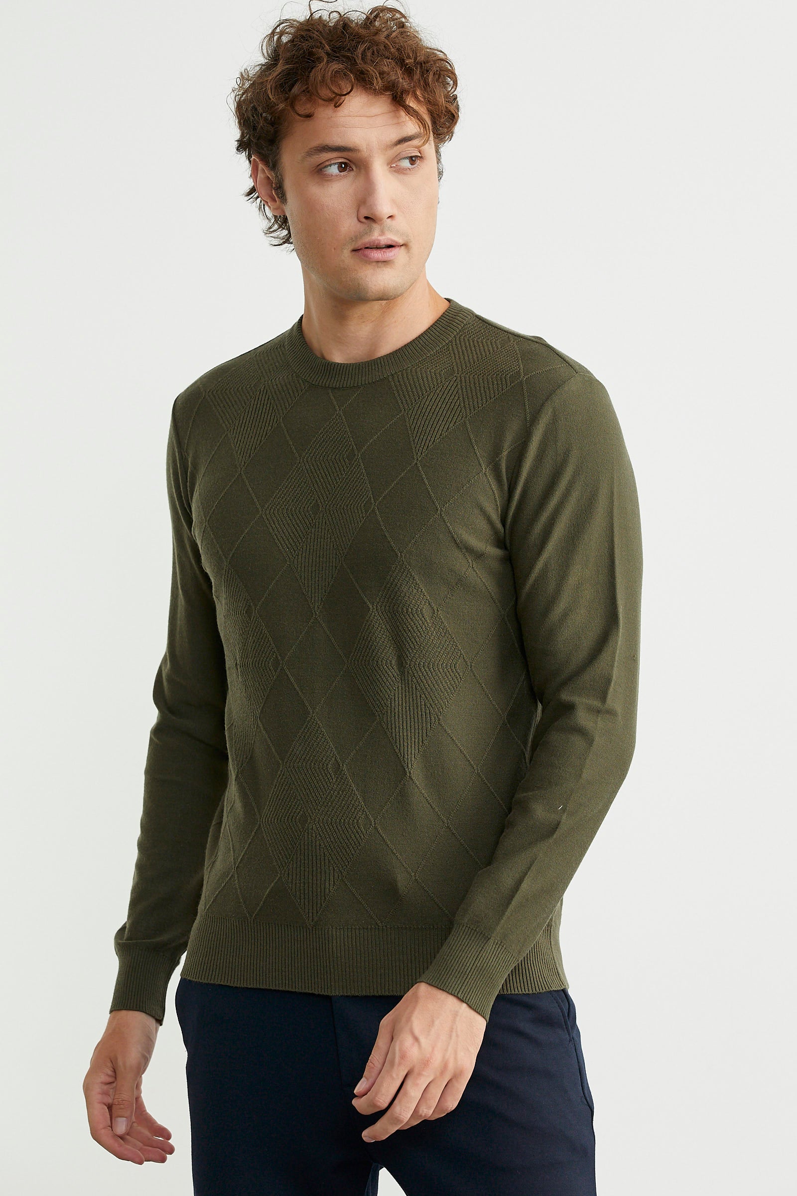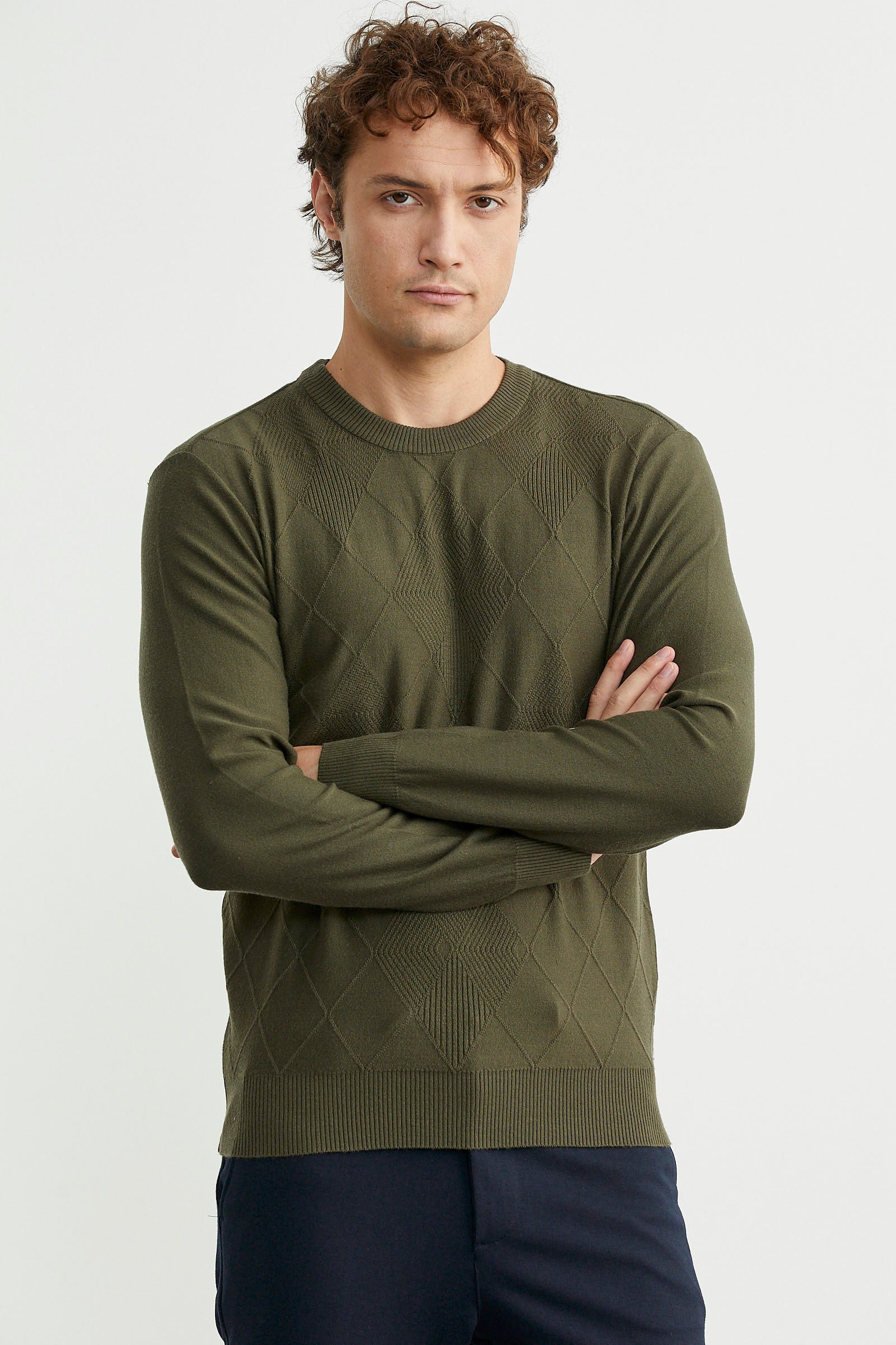 Yuvarlak yaka baklava desenli triko kazak, yumuşak dokuludur. Kol manşetleri ve etek ucu düzdür.