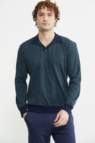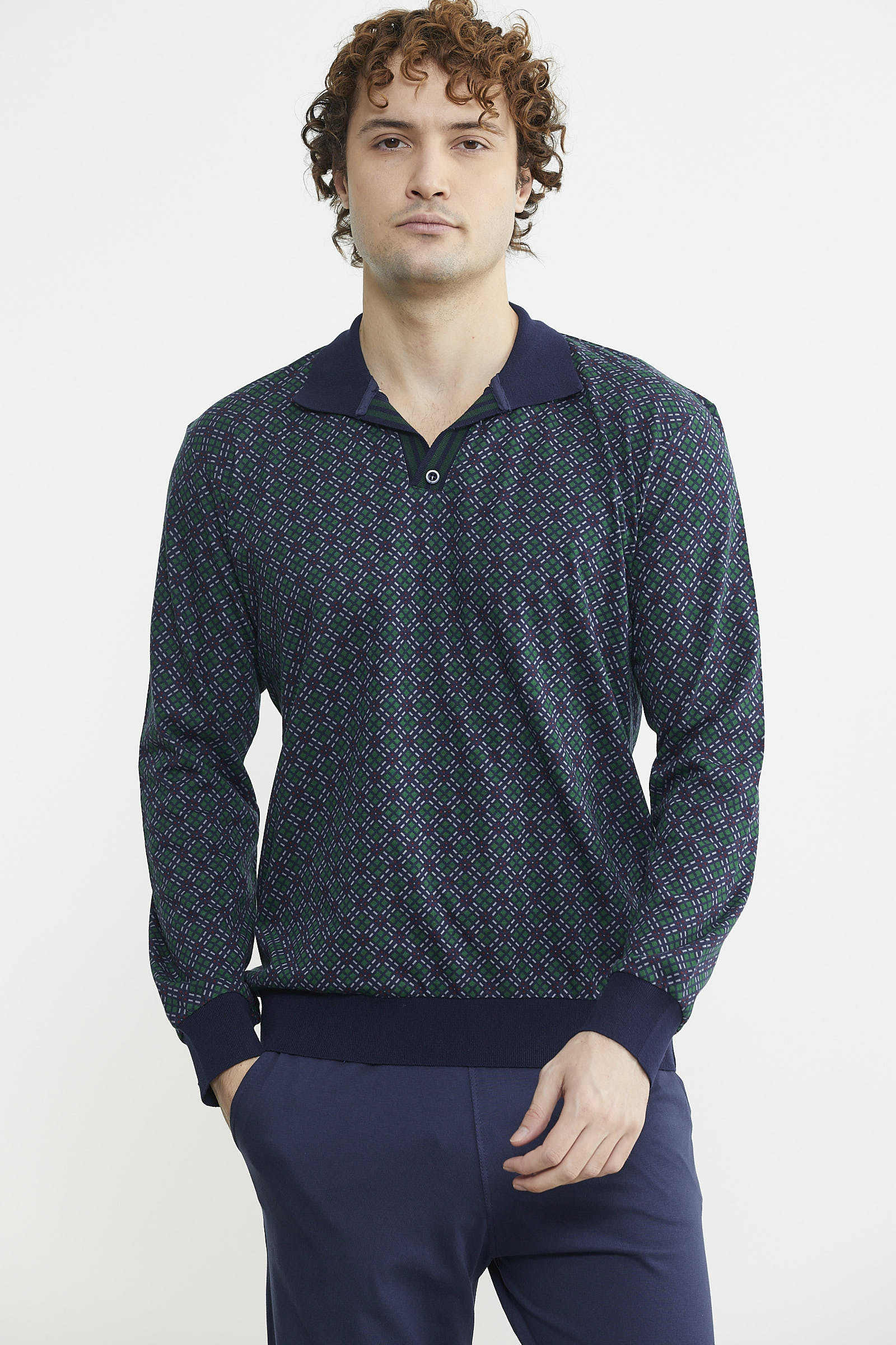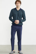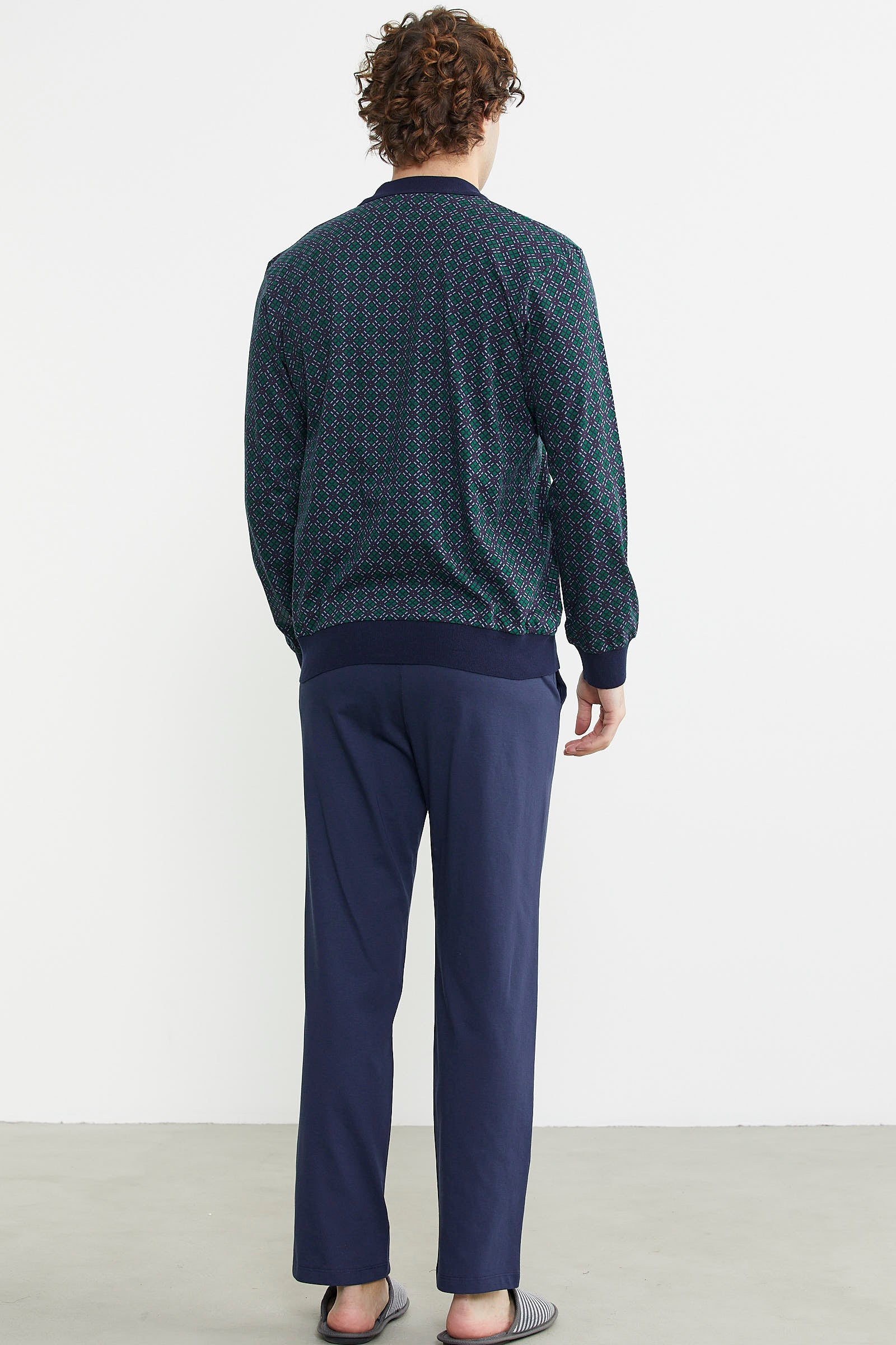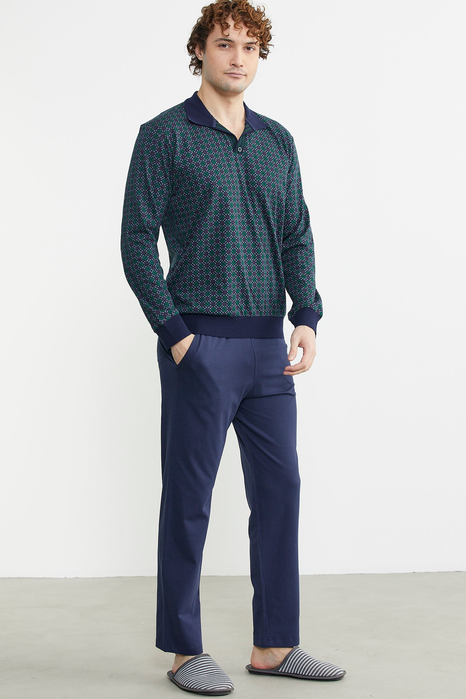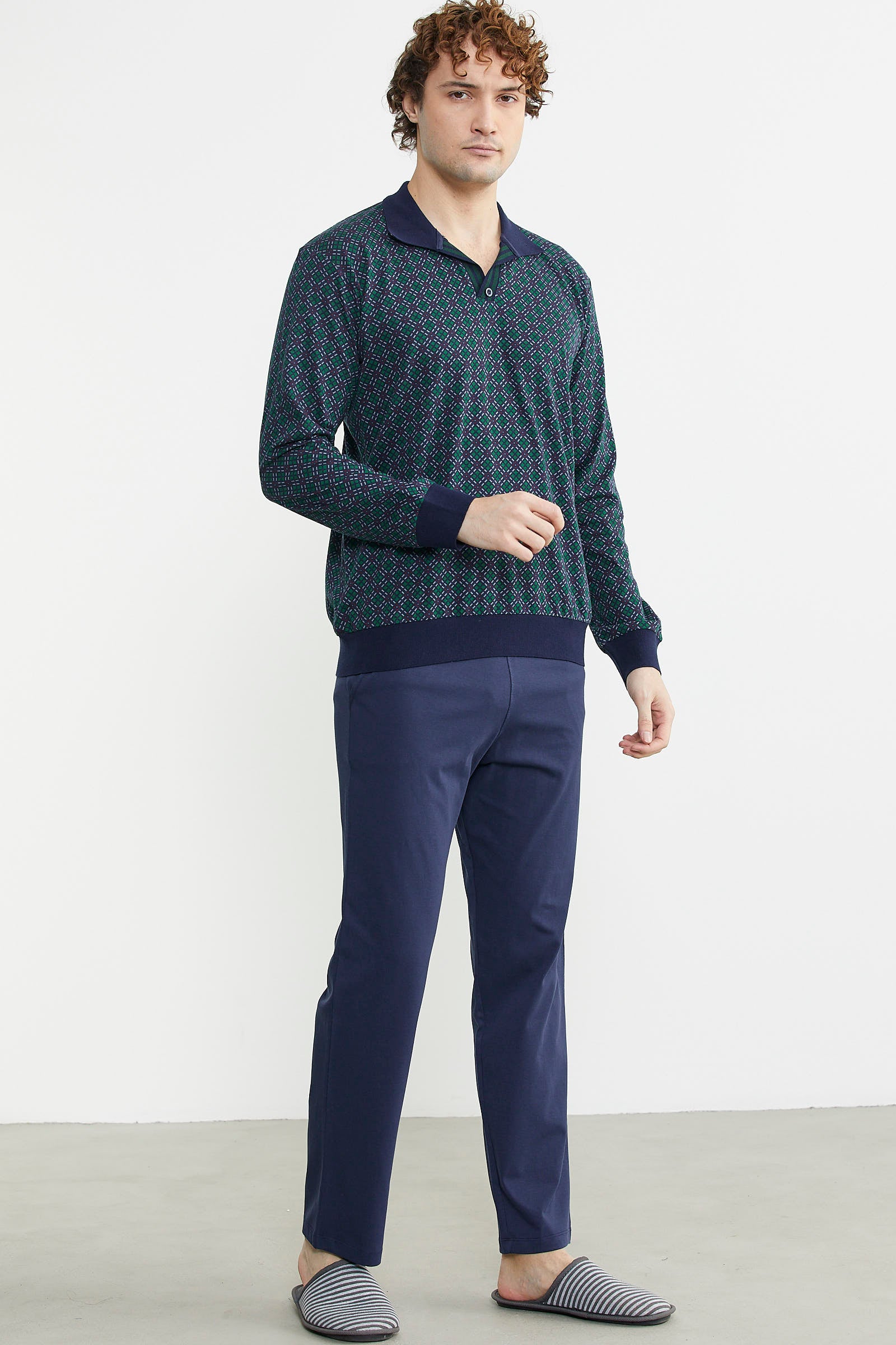 Örme detaylı polo yaka pijama takımın üst bedeninde desenli, alt bedeninde düz kumaş kullanılmıştır. Konforlu kullanım sağlar.