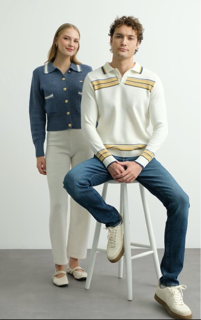 Uzun kollu lastikli manşet detayına sahip triko kazak. Polo yaka. renk kombinli. Desenli.
