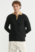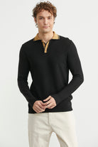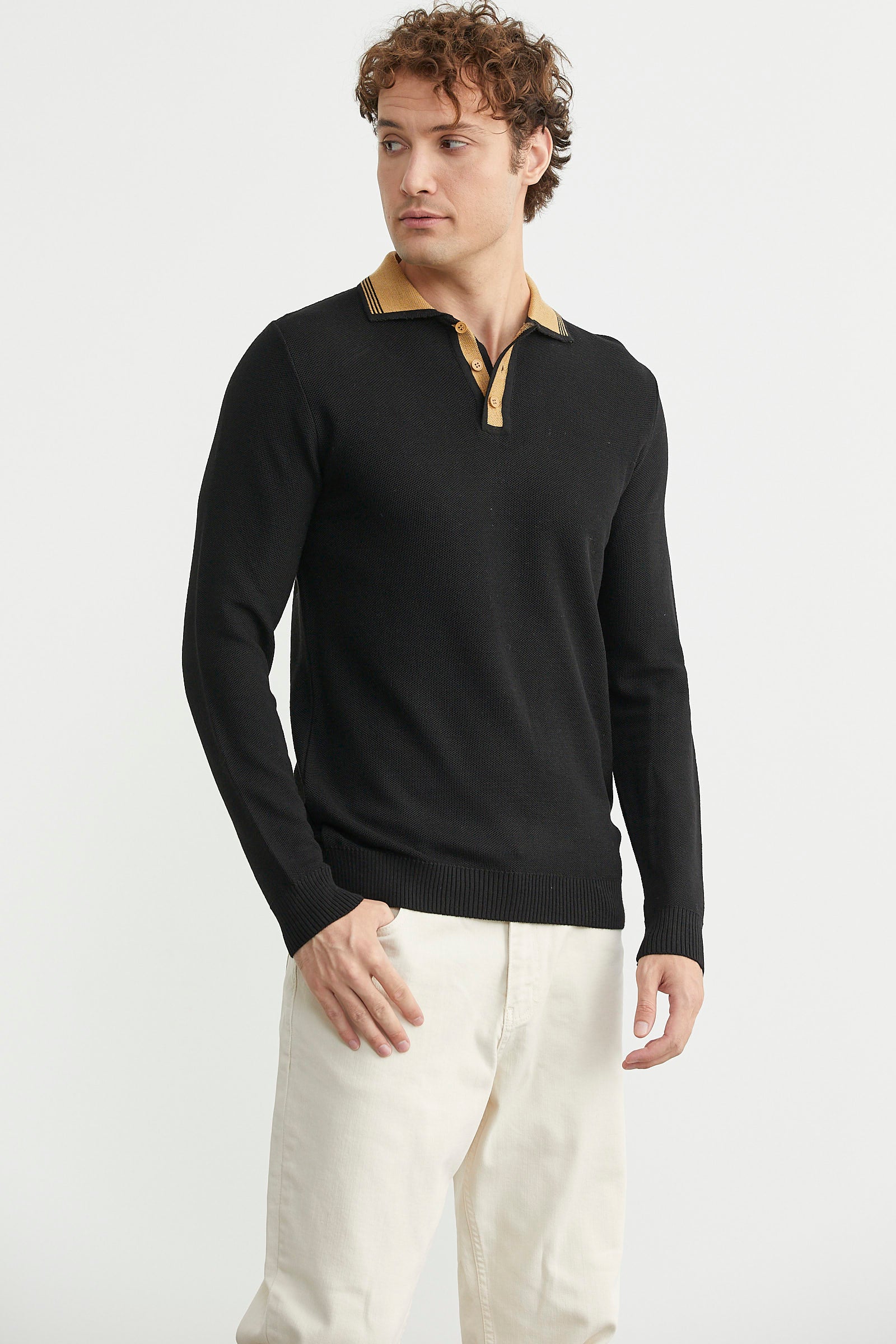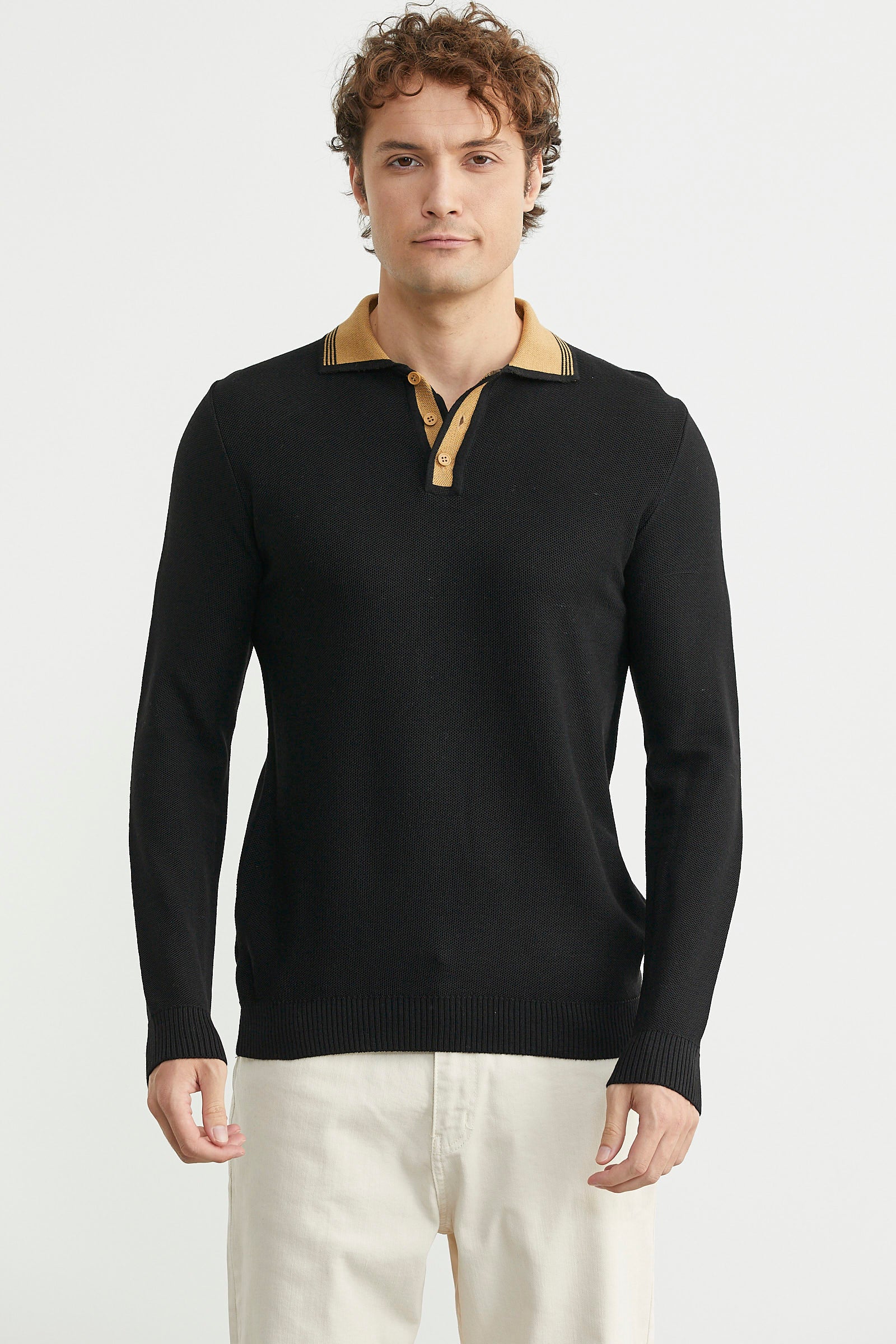 Polo Yaka Yünlü Triko Kazak - Siyah