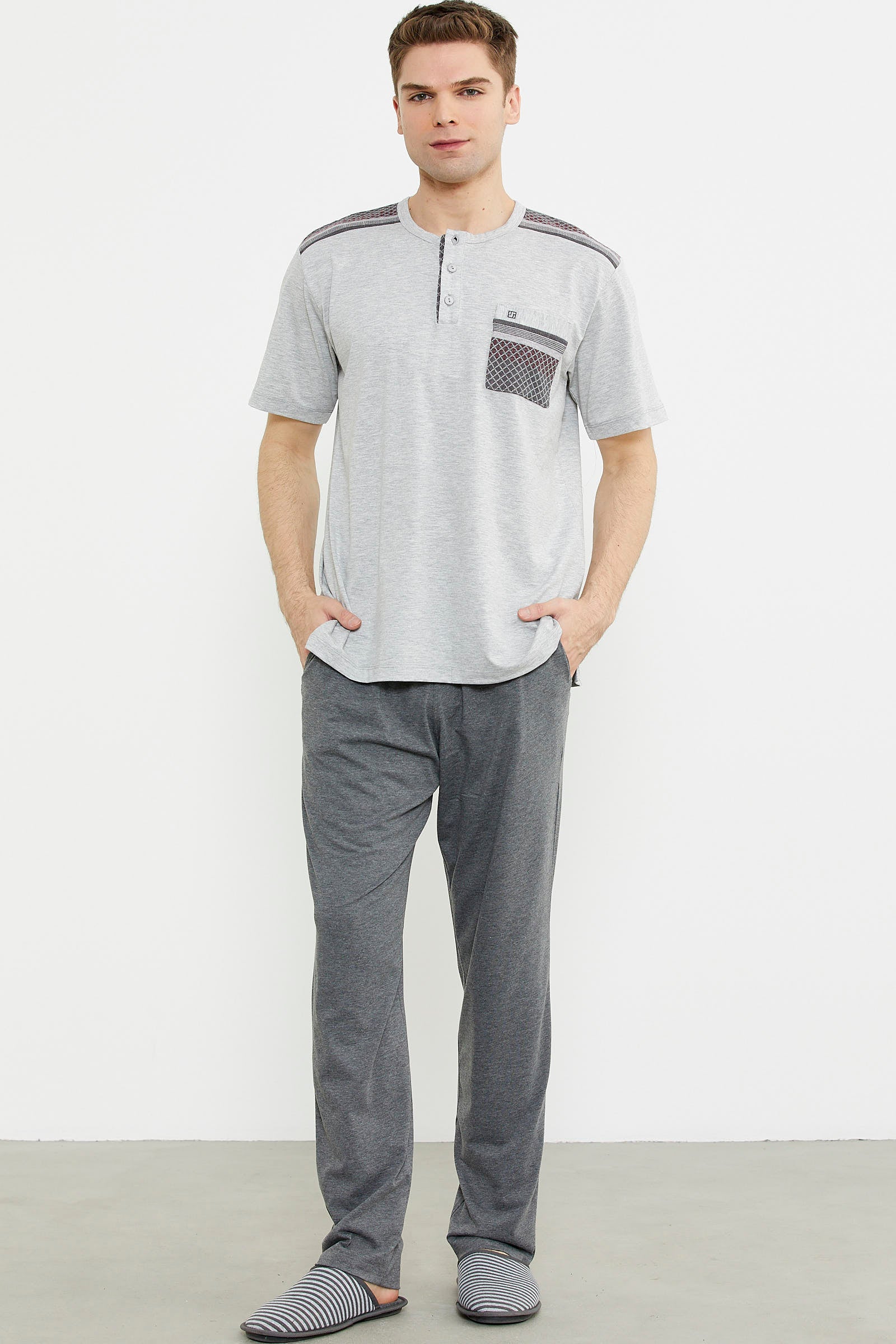 Pamuk içerikli kumaştan üretilmiş olan pijama takım, uyku konforu için çok özel bir tercih.Desen kombinli, düğmeli sıfır yaka ve göğüs cebi detaylıdır. Standart kalıptır.