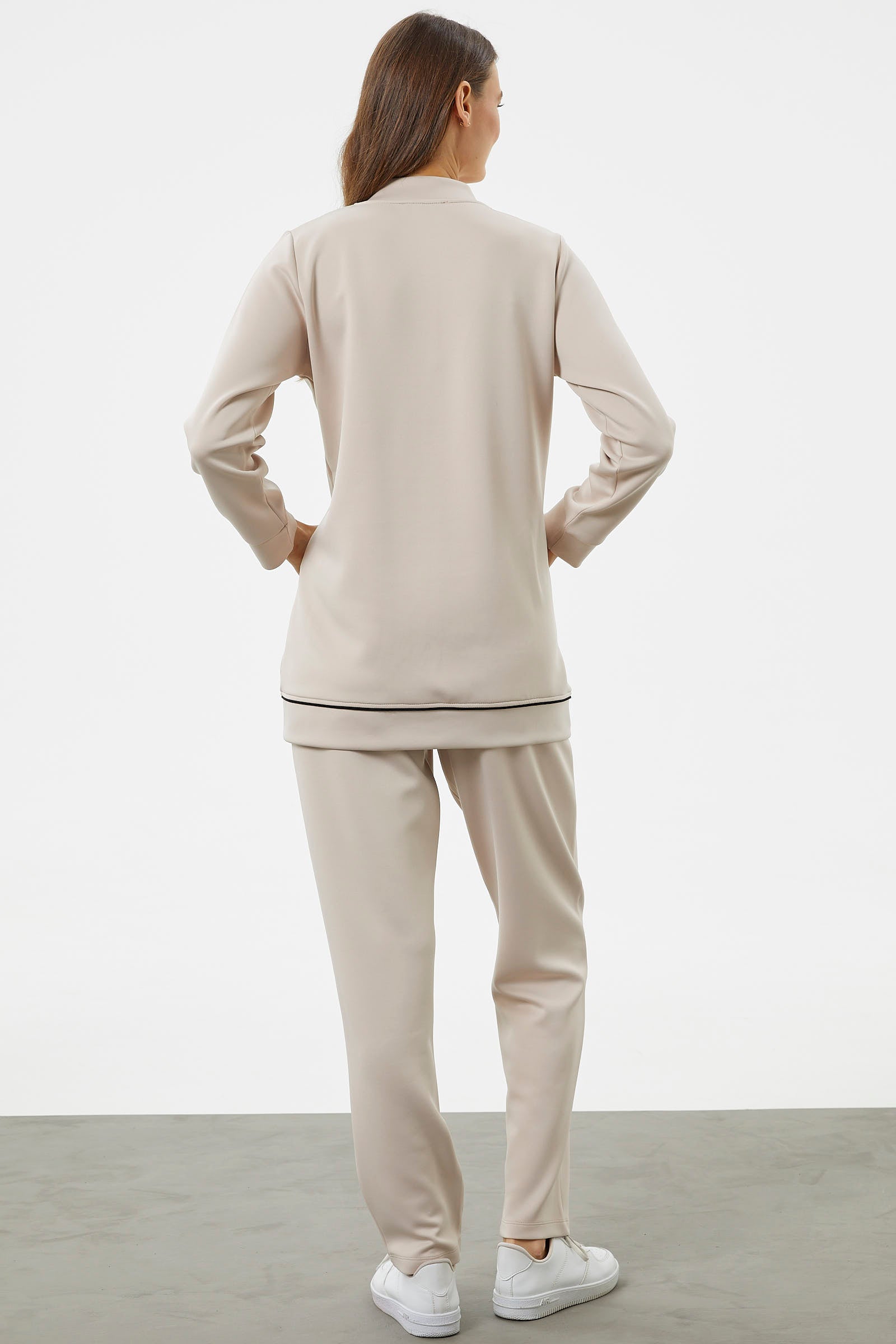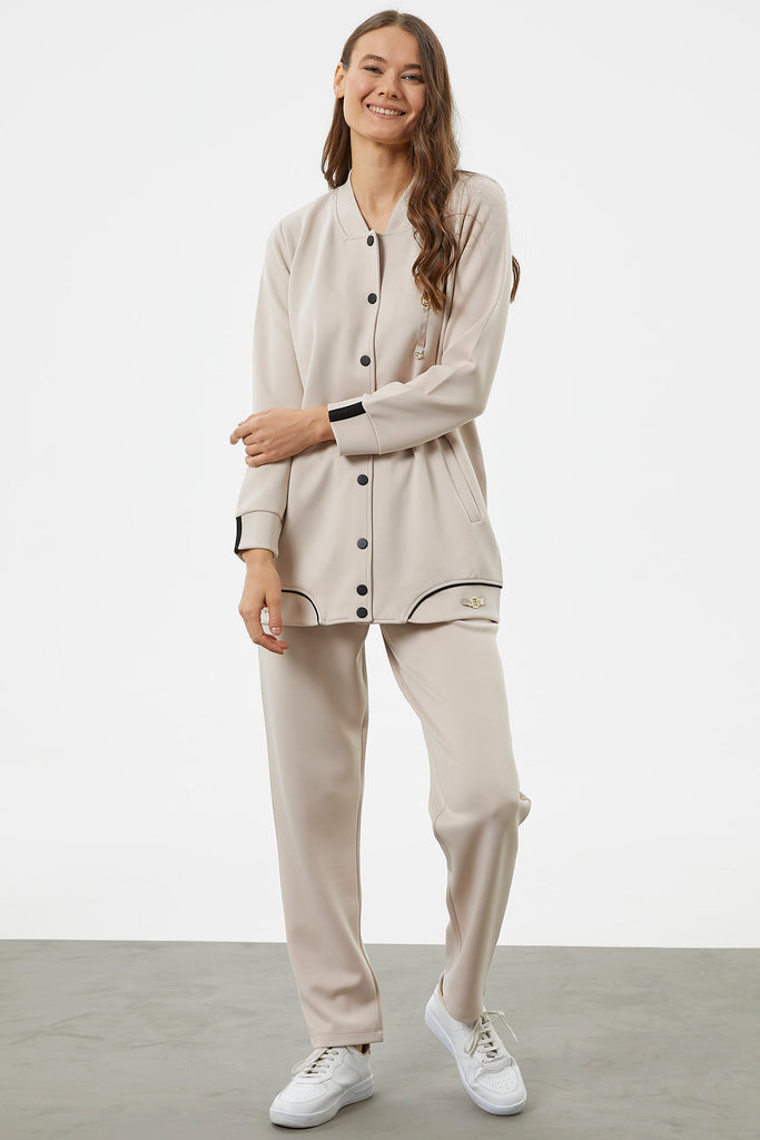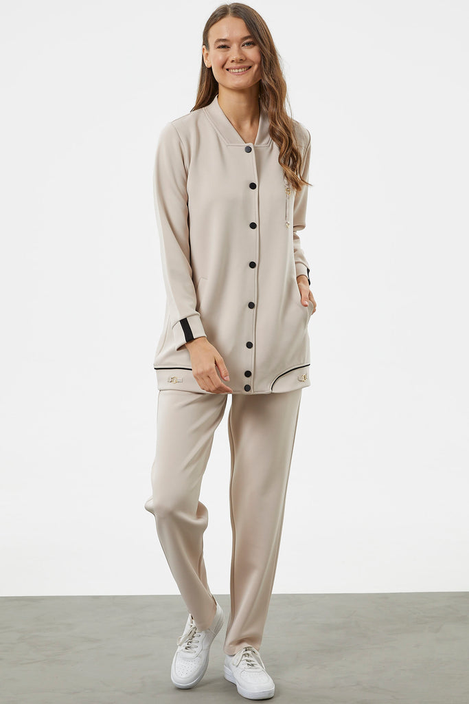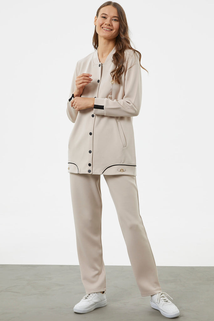 Büyük beden olarak tasarlanmış renk detaylı tunik ve alttan oluşan ikili eşofman takımı düğme ve cep detaylarıyla kullanım kolaylığı sağlarken zarif bir görünüm yaratıyor.
