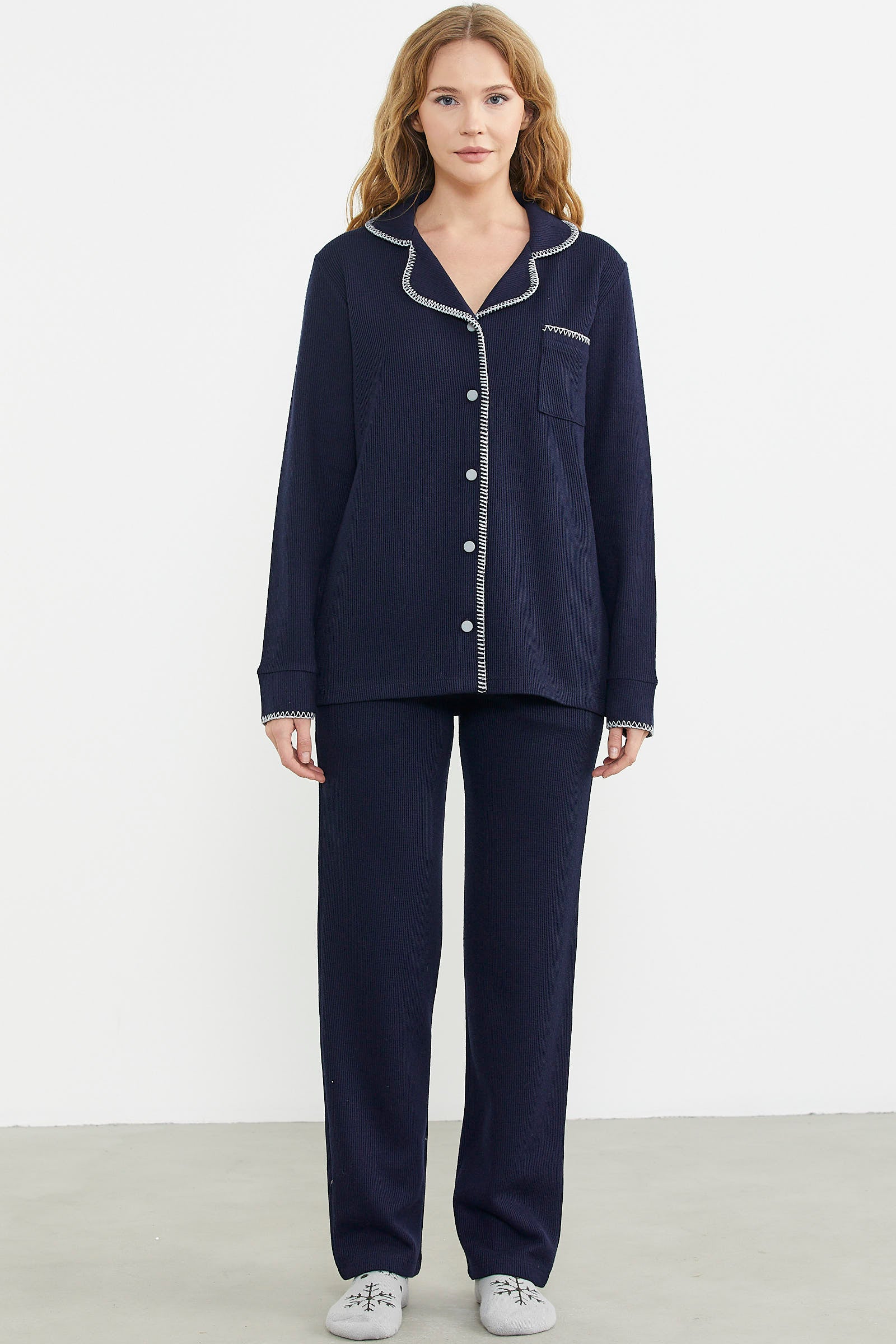 Kalın ve tok kumaştan üretilmiş düğme kapamalı pijama takım, kış günlerinde sıcak ve konforlu yapısıyla içinizi ısıtacak. Rahat kalıptır.