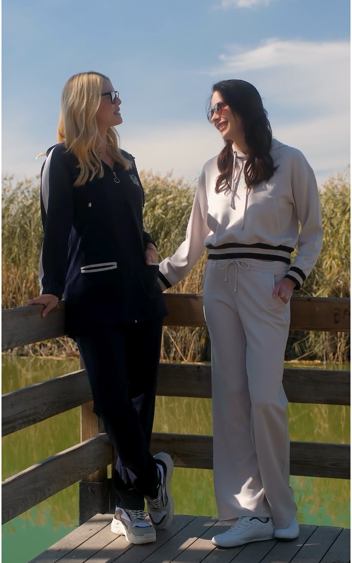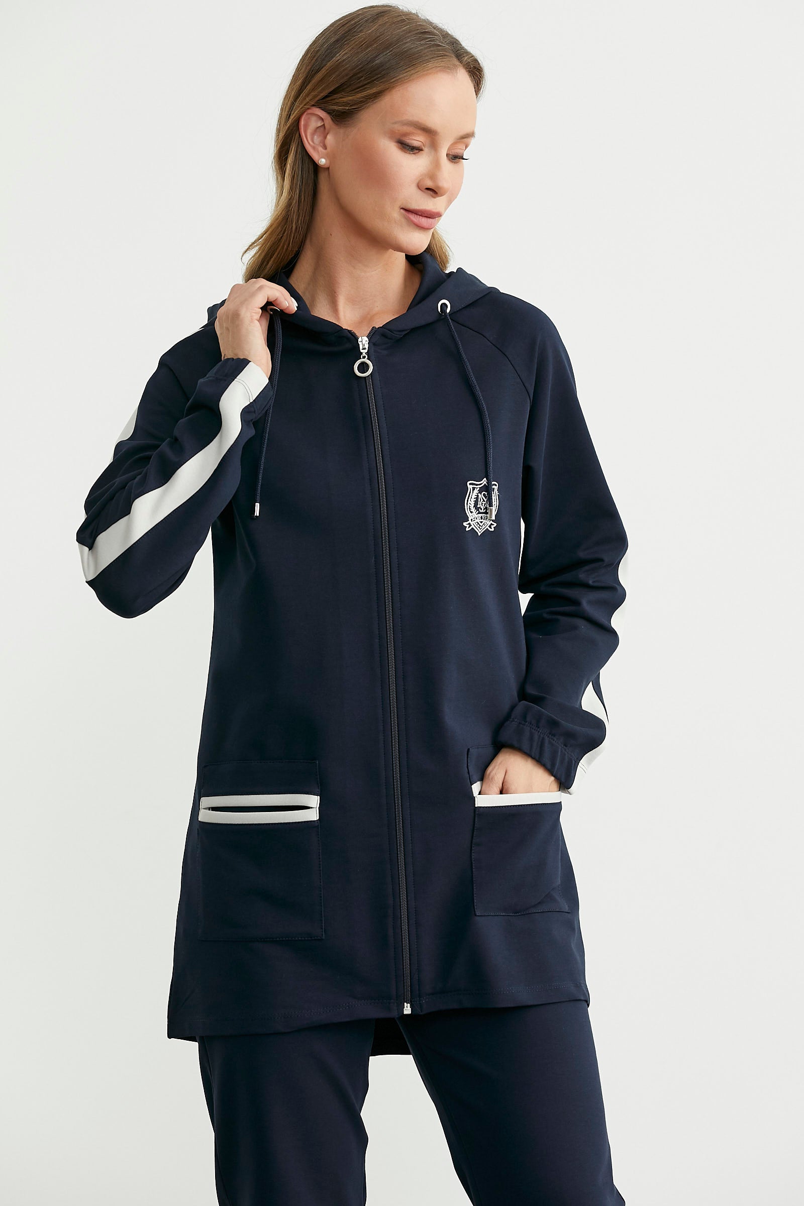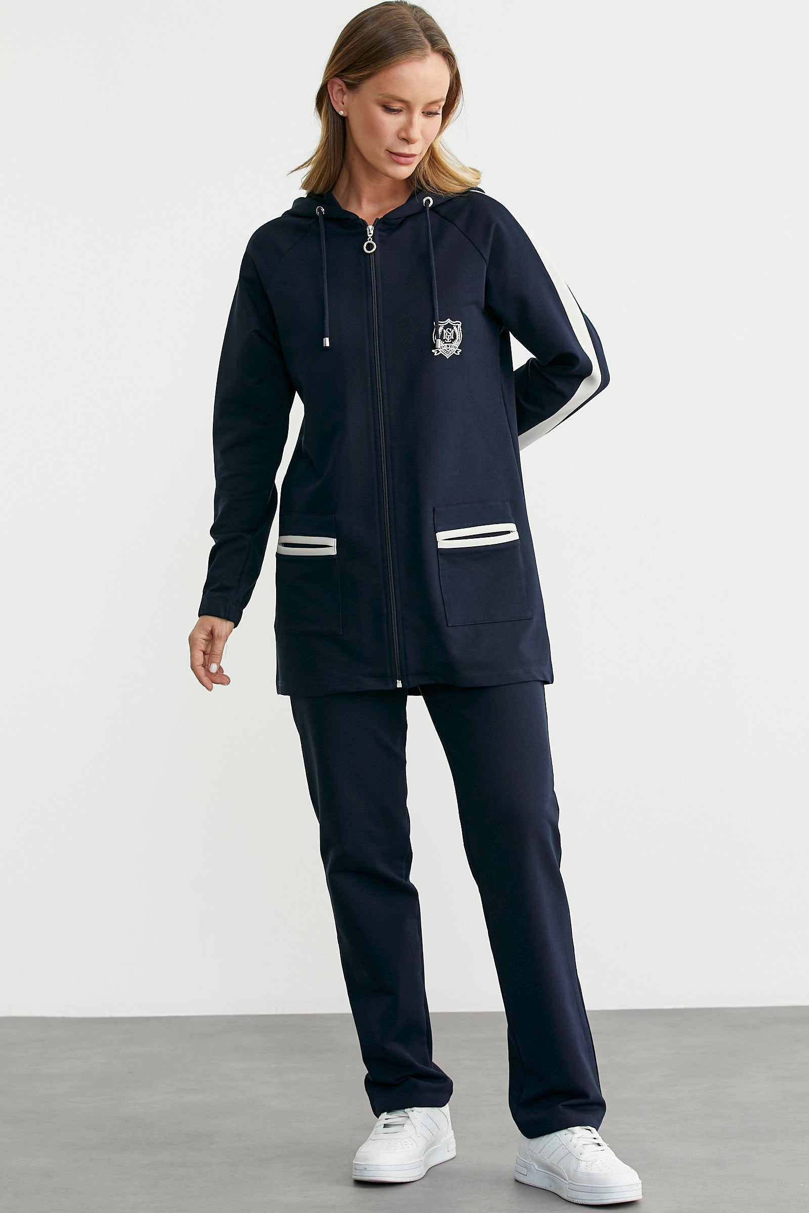 Kapüşonlu, fermuar kapamalı, tunik boy üst. Boru paça, rahat kalıp beli lastikli alt. İkili takımdır.