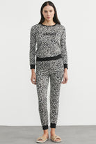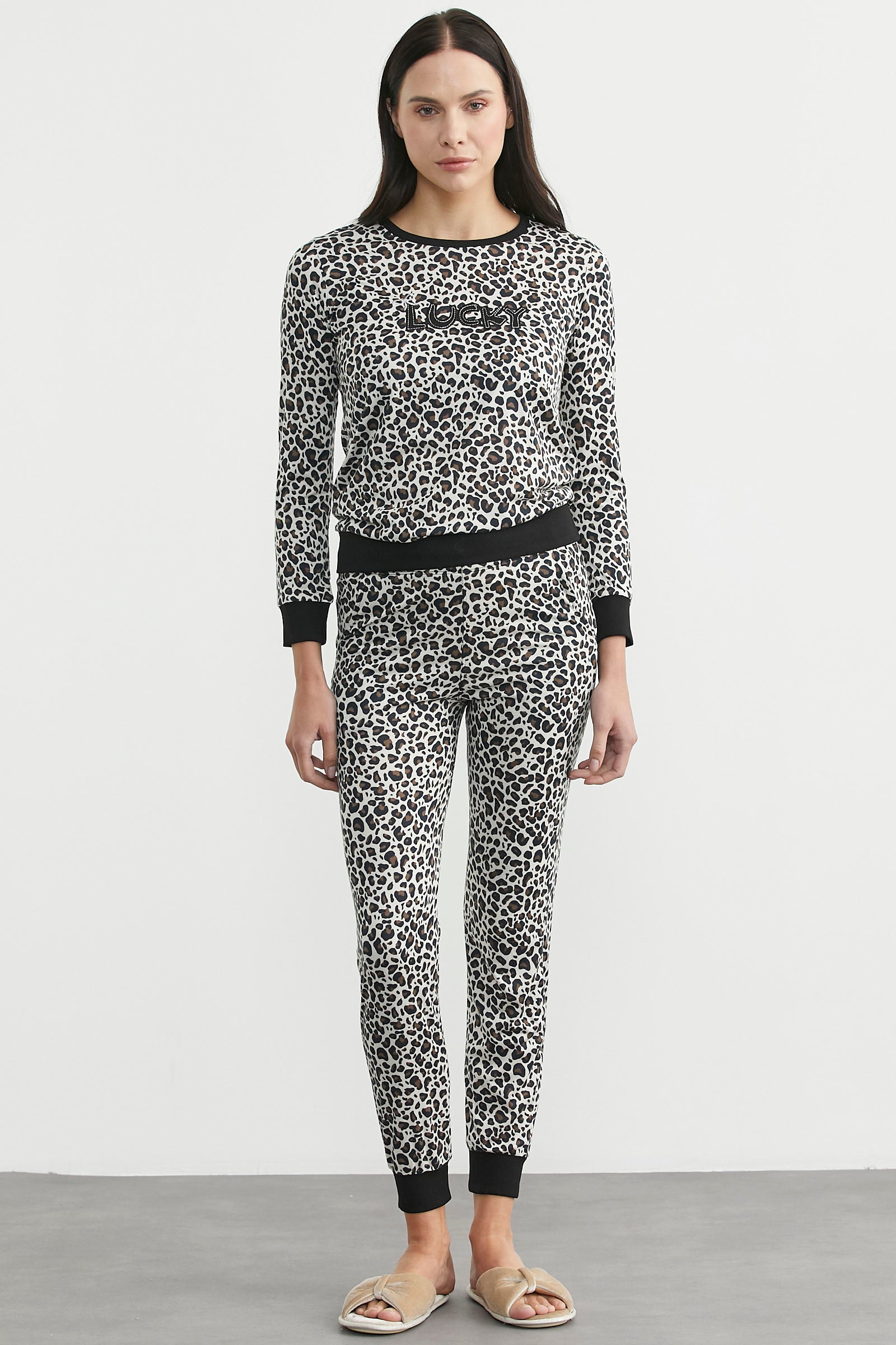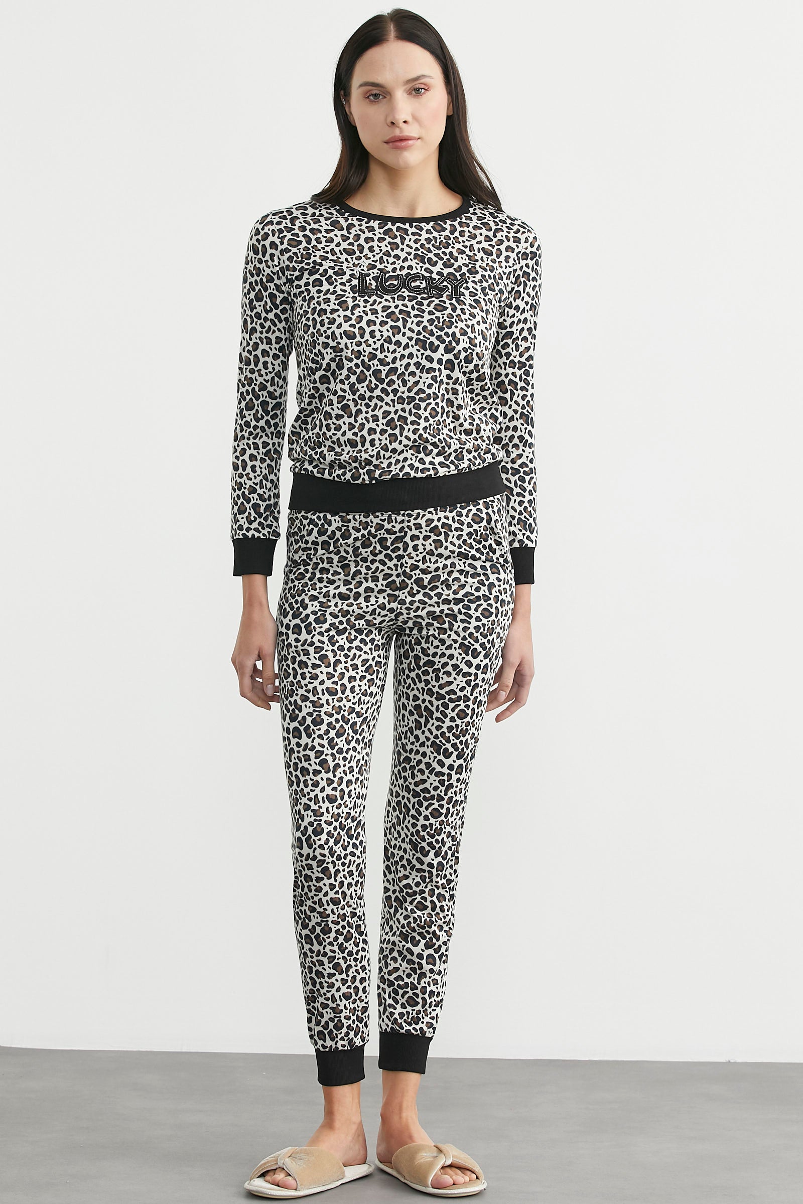Nakış detaylı, dar kalıp leopar desenli pijama takım. Yumoş kumaştan üretilmiştir.