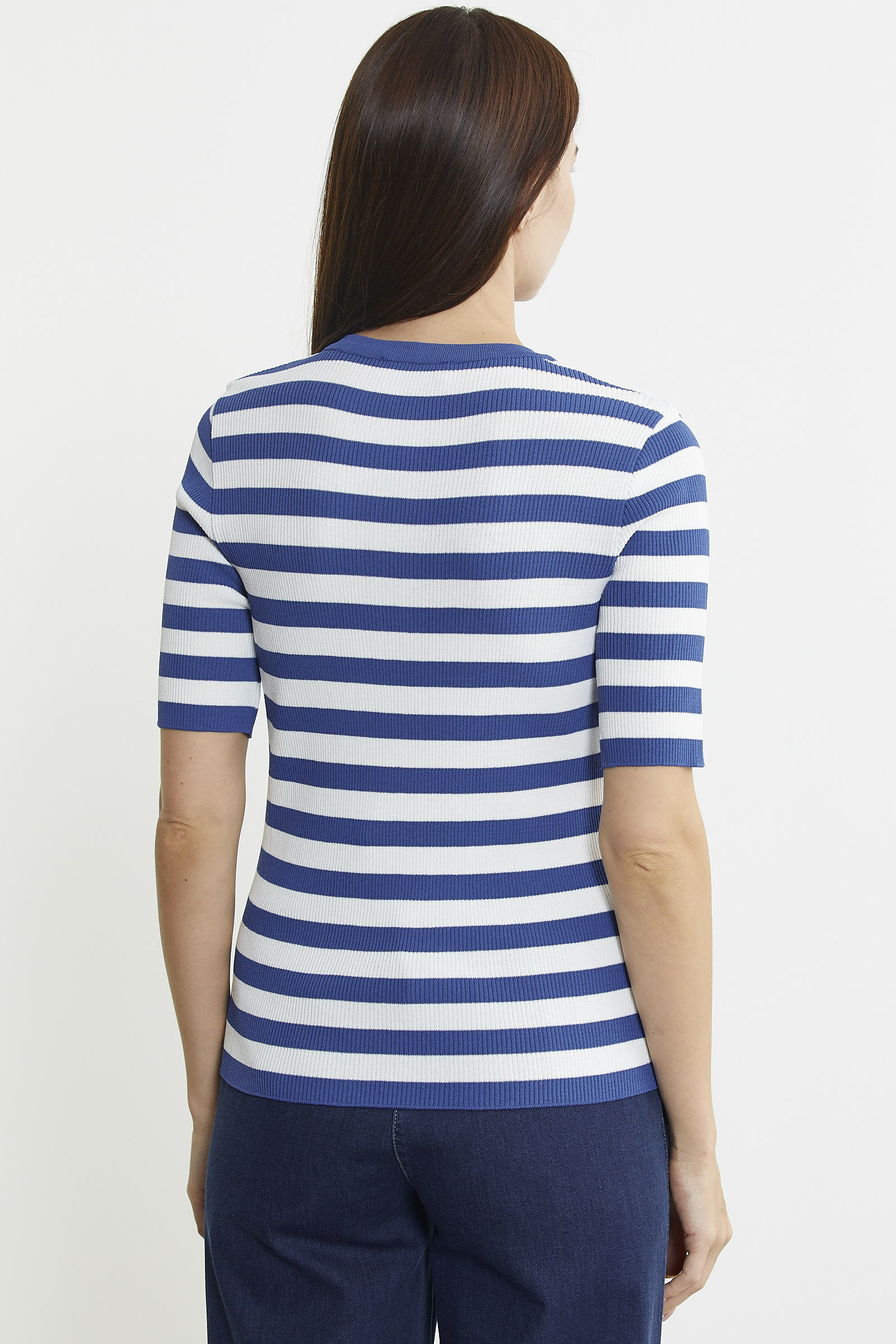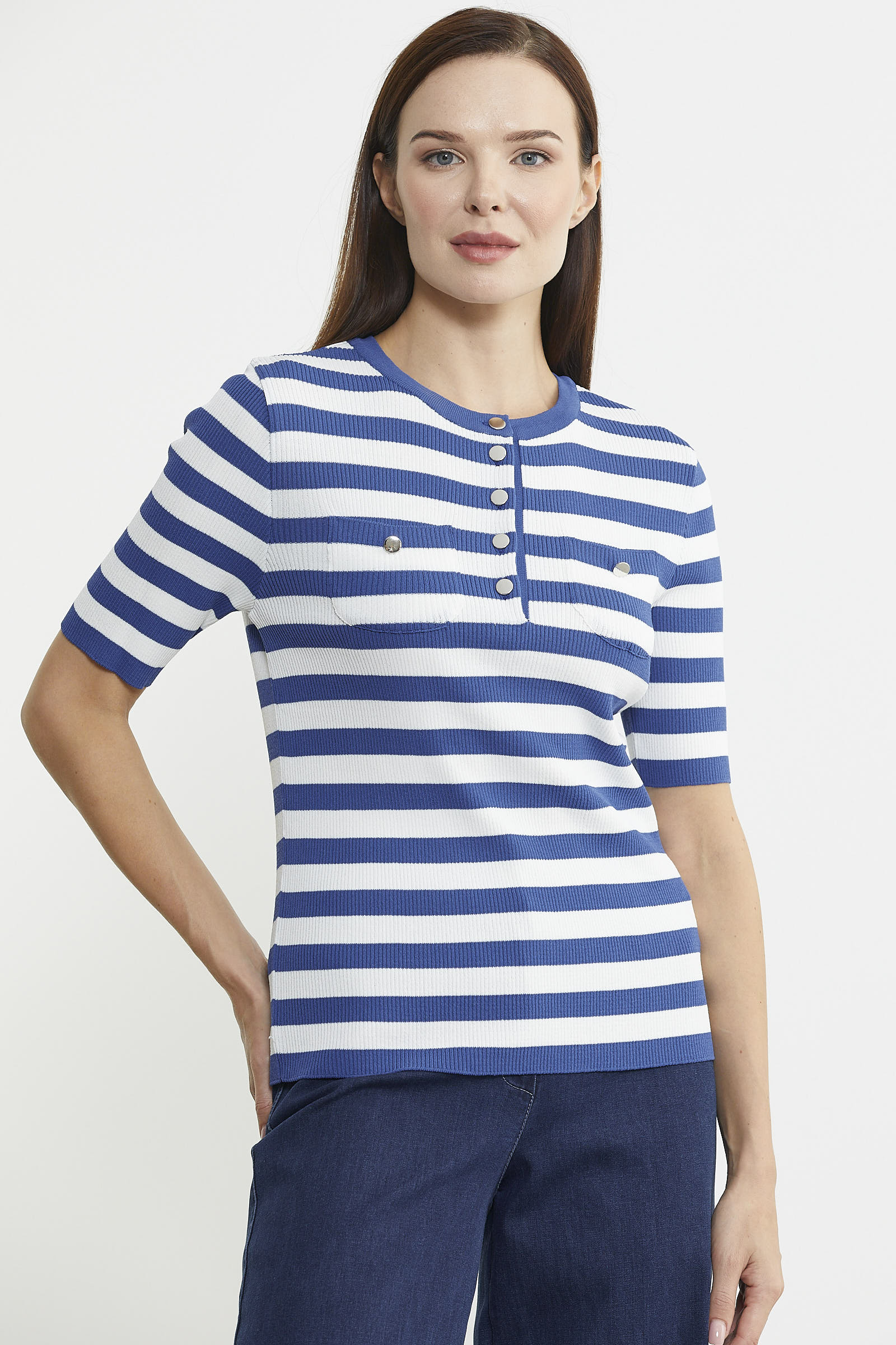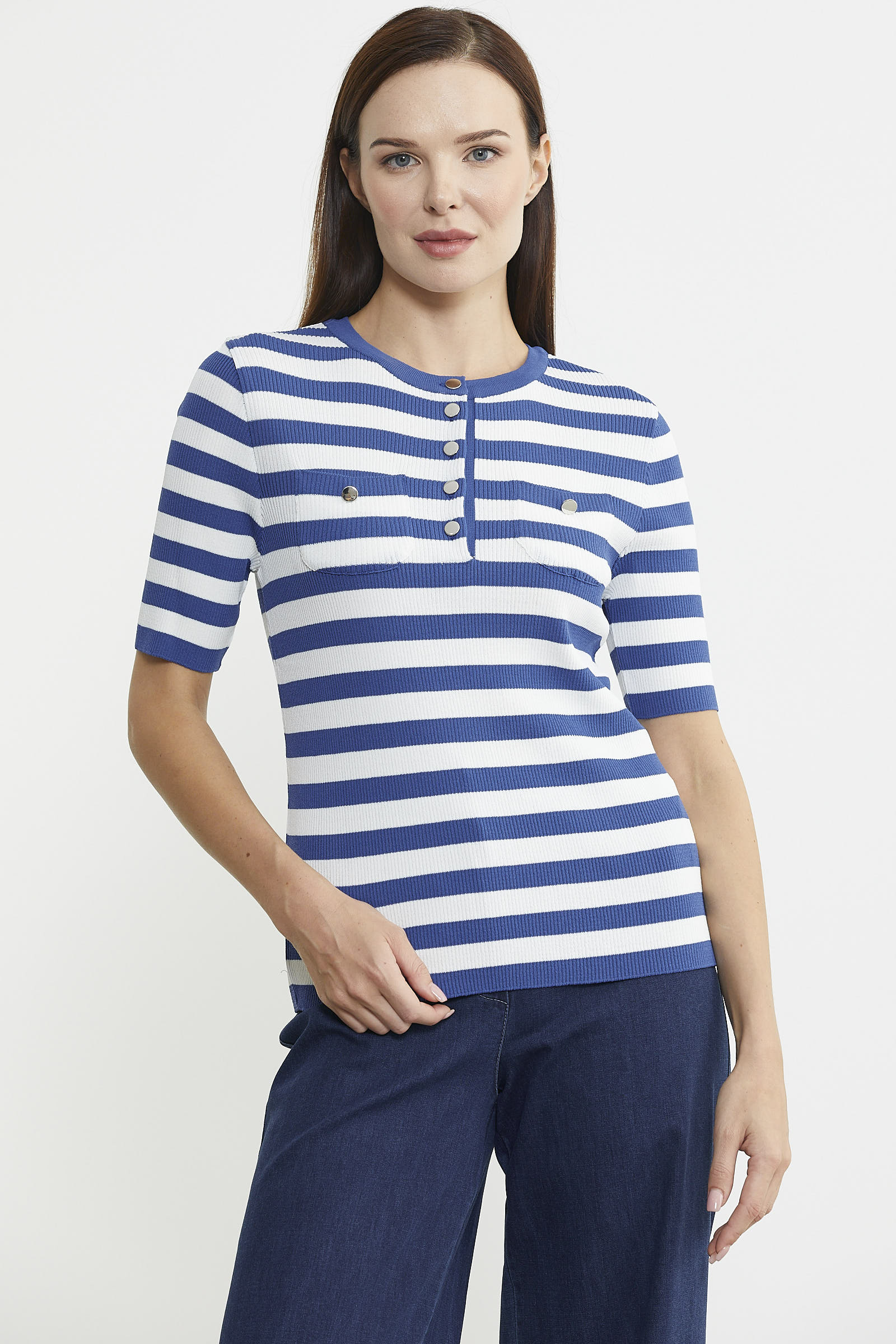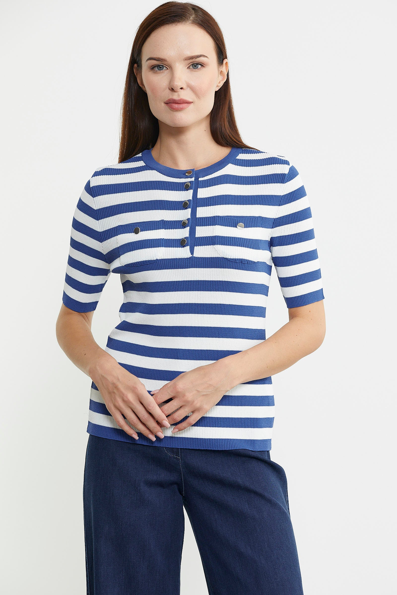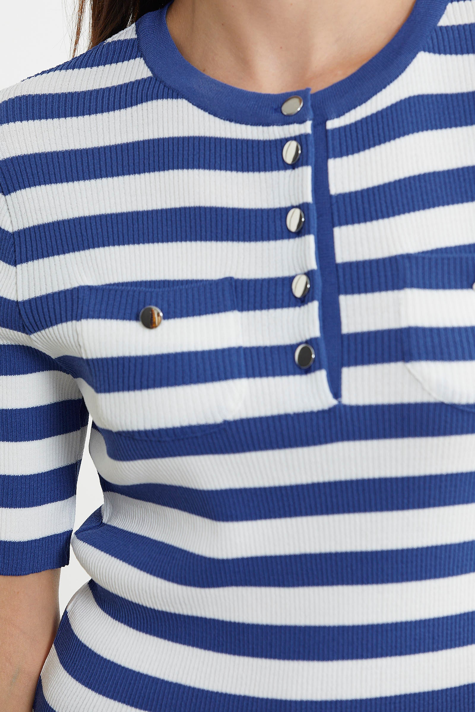 Düğme Detaylı Çizgili Triko Kazak - Mavi