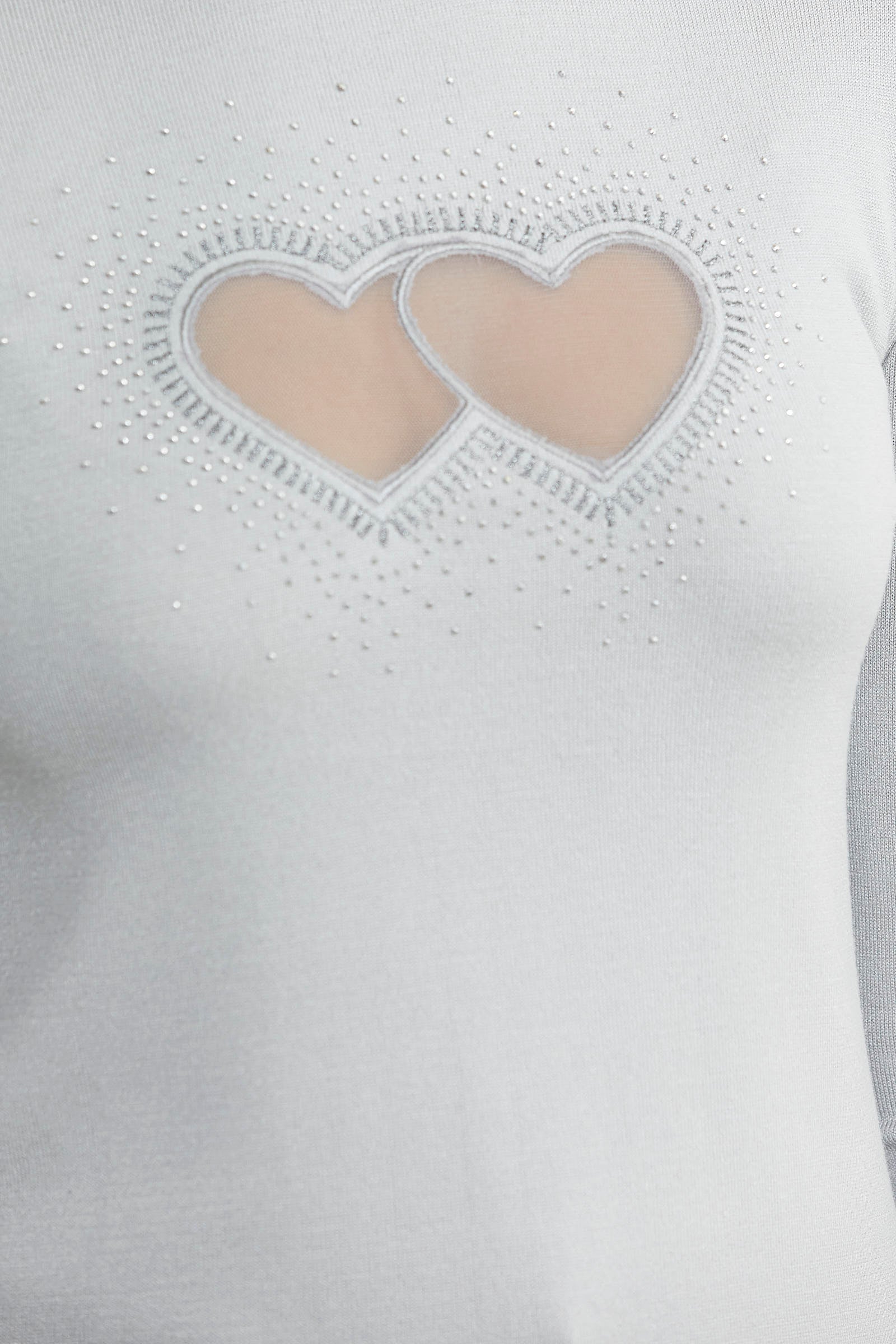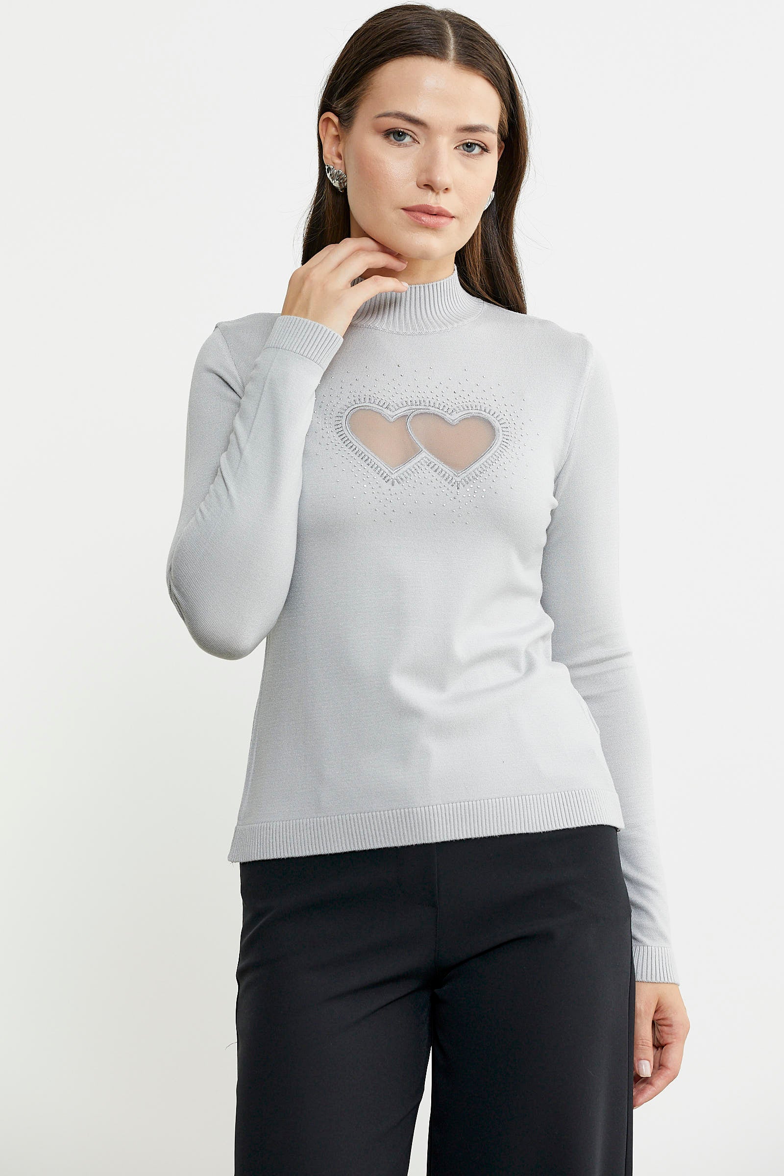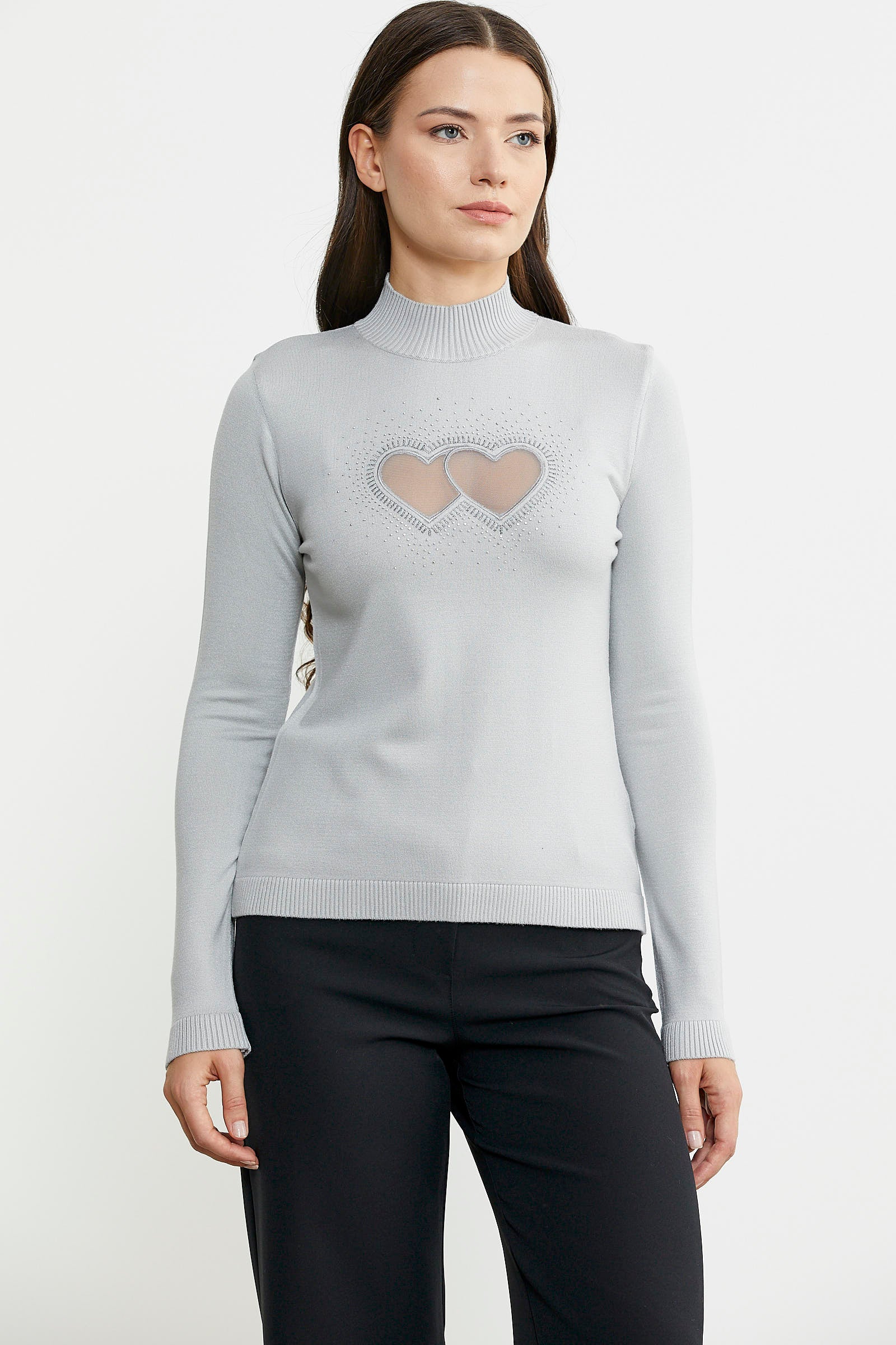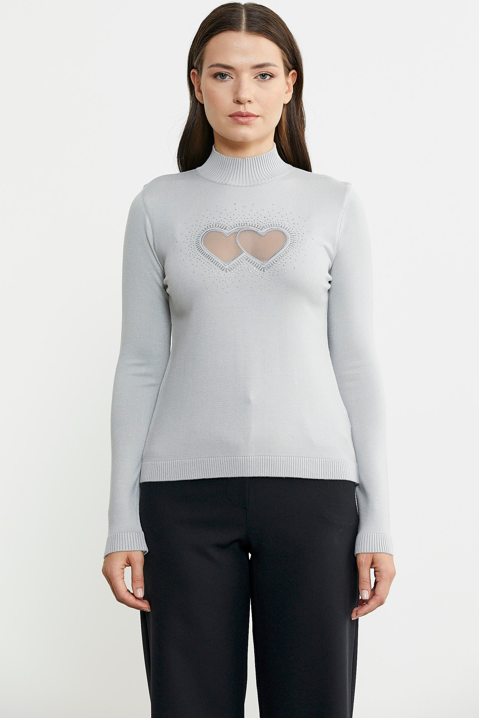 Dik yaka, bedeni saran, basic triko kazak.Lazer kesilmiş tül kalp detayı taşlarla birleştirilmiştir.