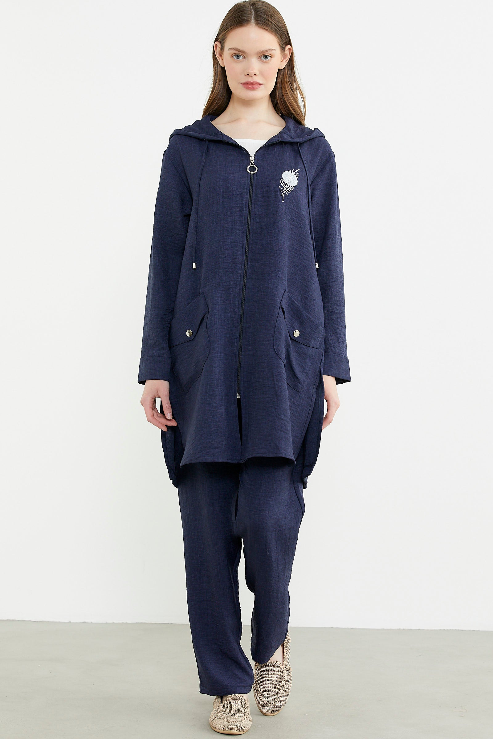Her tarza uyum sağlayabilecek ve kombin kolaylığıyla dolapların vazgeçilmezi olmaya aday bu üçlü takım rahat kalıp tasarlanmıştır. Keten görünümlü özel kumaştan üretilmiştir.