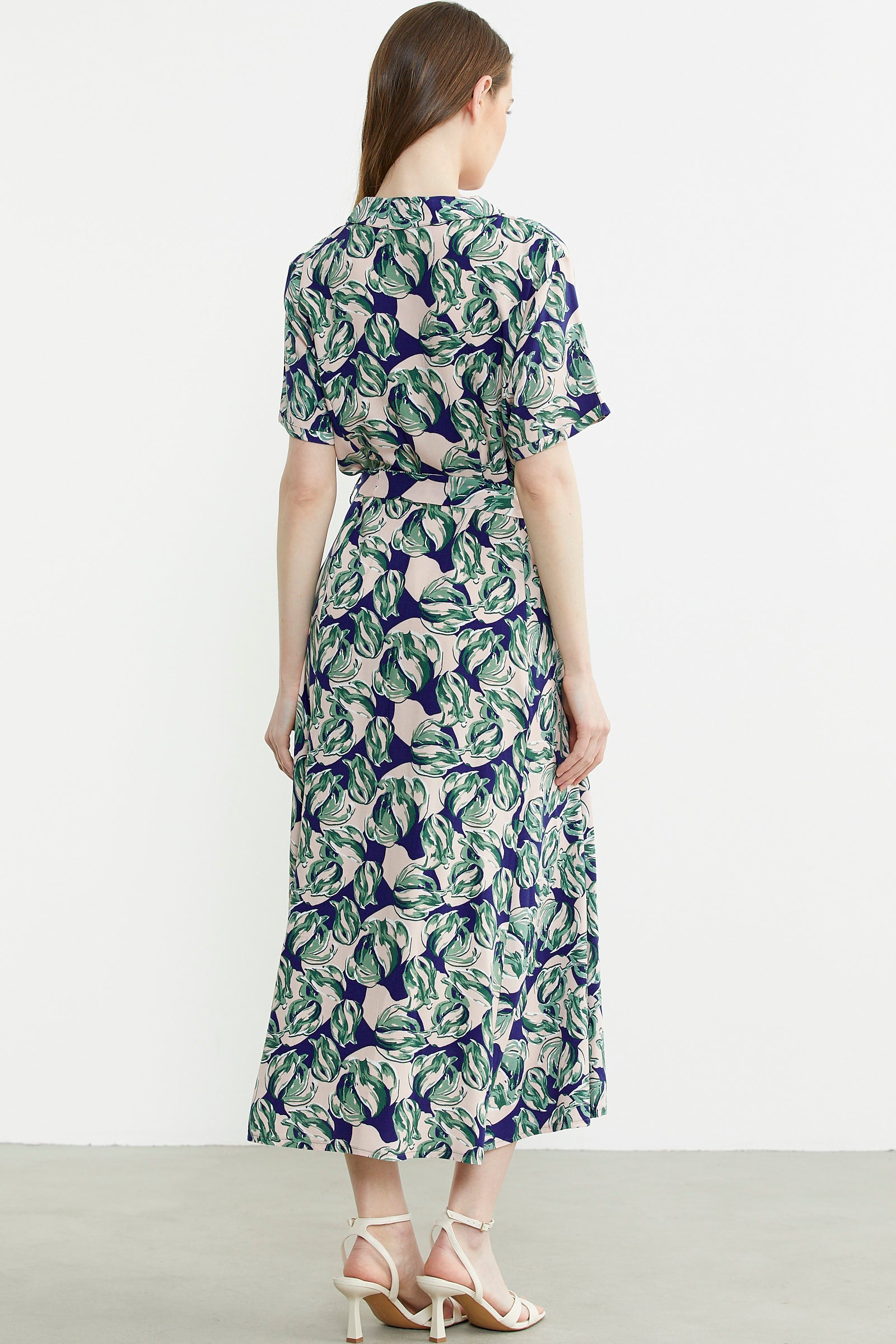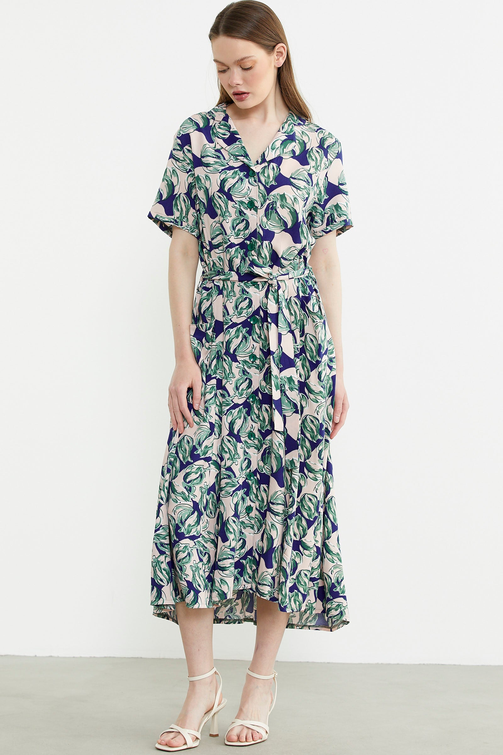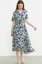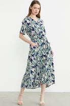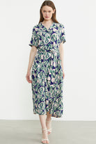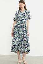 Karışık Desenli Kuşaklı Gömlek Elbise - Yeşil