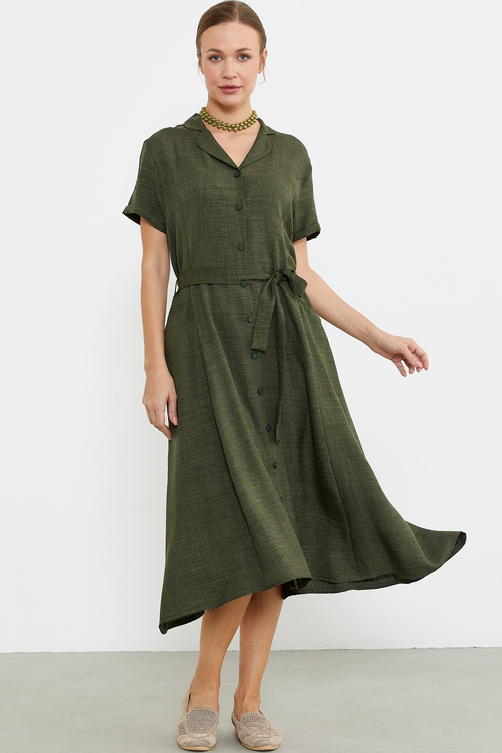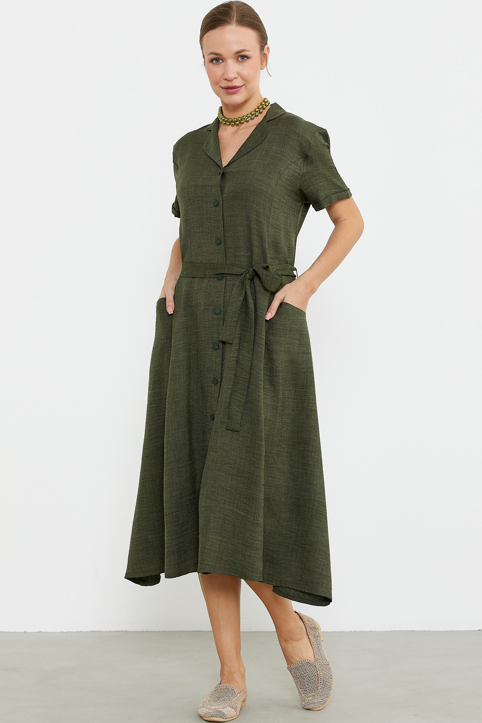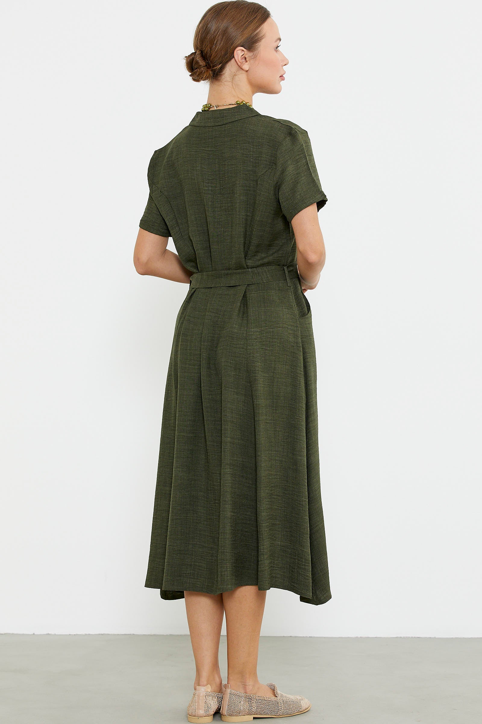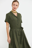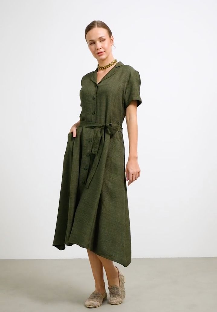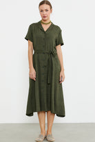 Keten Görünümlü Cepli Gömlek Elbise - Haki