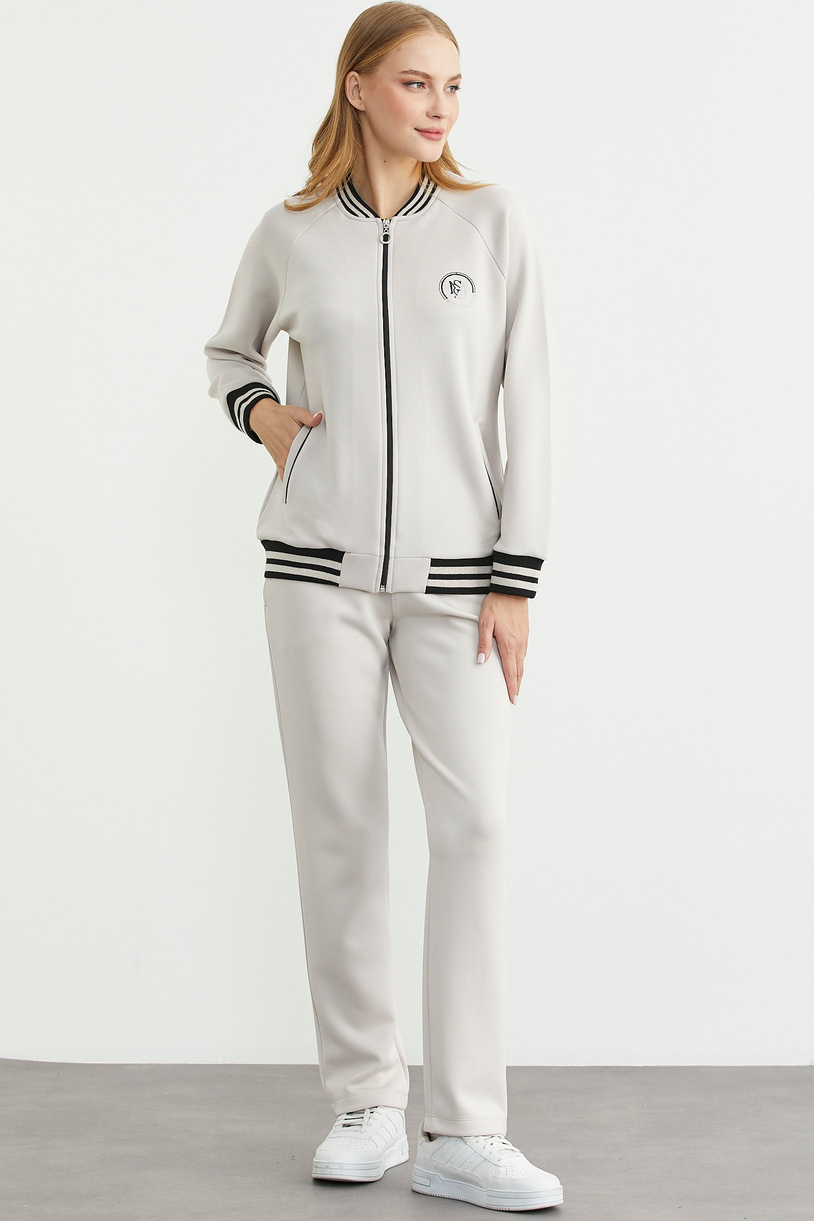 Scuba kumaştan üretilmiş oversize eşofman takım. Fermuar kapamalı. Manşet ve etek ucu örme detaylı.