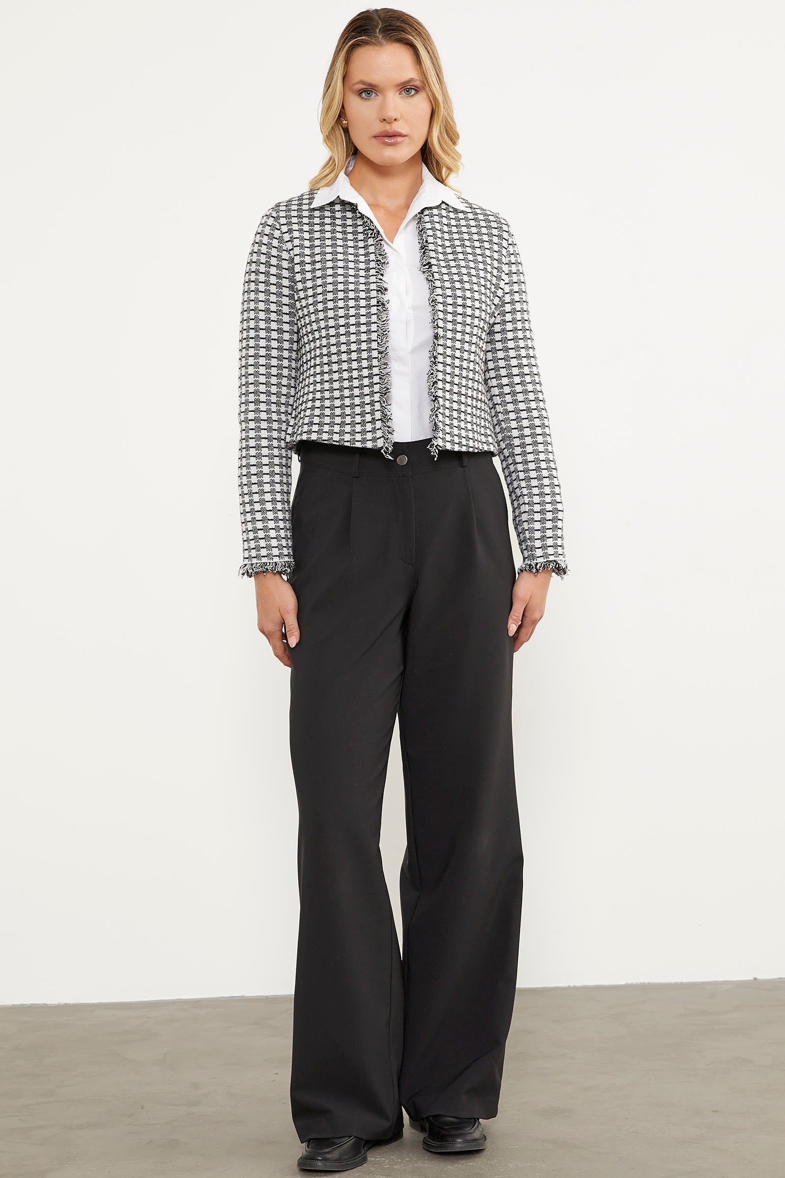 Hem sıcak tutacak, hem yumuşacık hem de ekose desenleri ile size pozitif enerji sunacak yün içerikli, sıfır yaka, uzun kollu triko ceket sizin vazgeçilmeziniz olacaktır. Kol ağızlarında, yakasında ve ön kısmında bulunan minimal püskül detayları ile dikkatleri üzerinize çekeceksiniz.