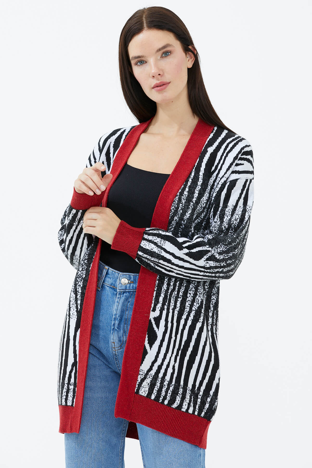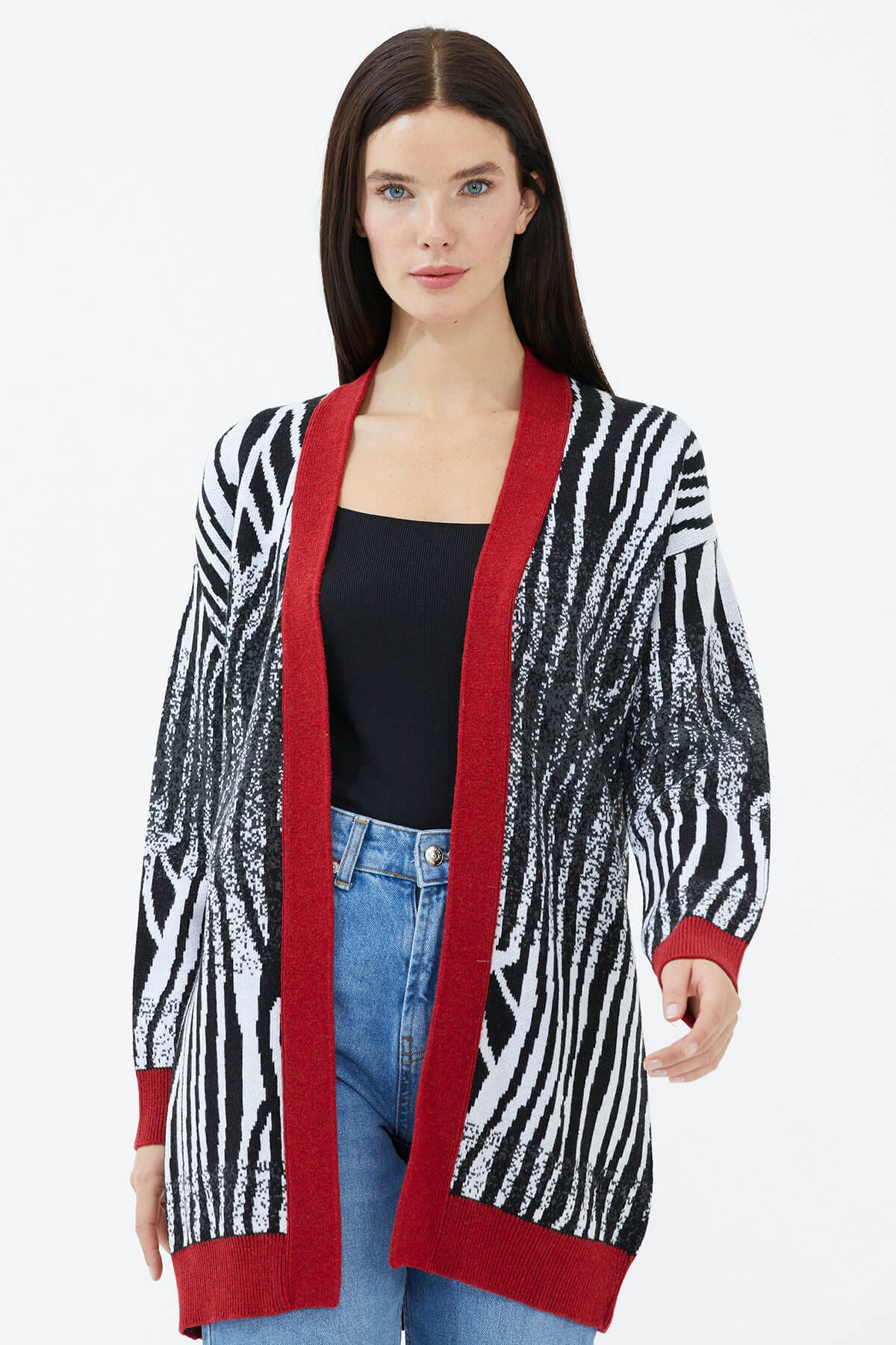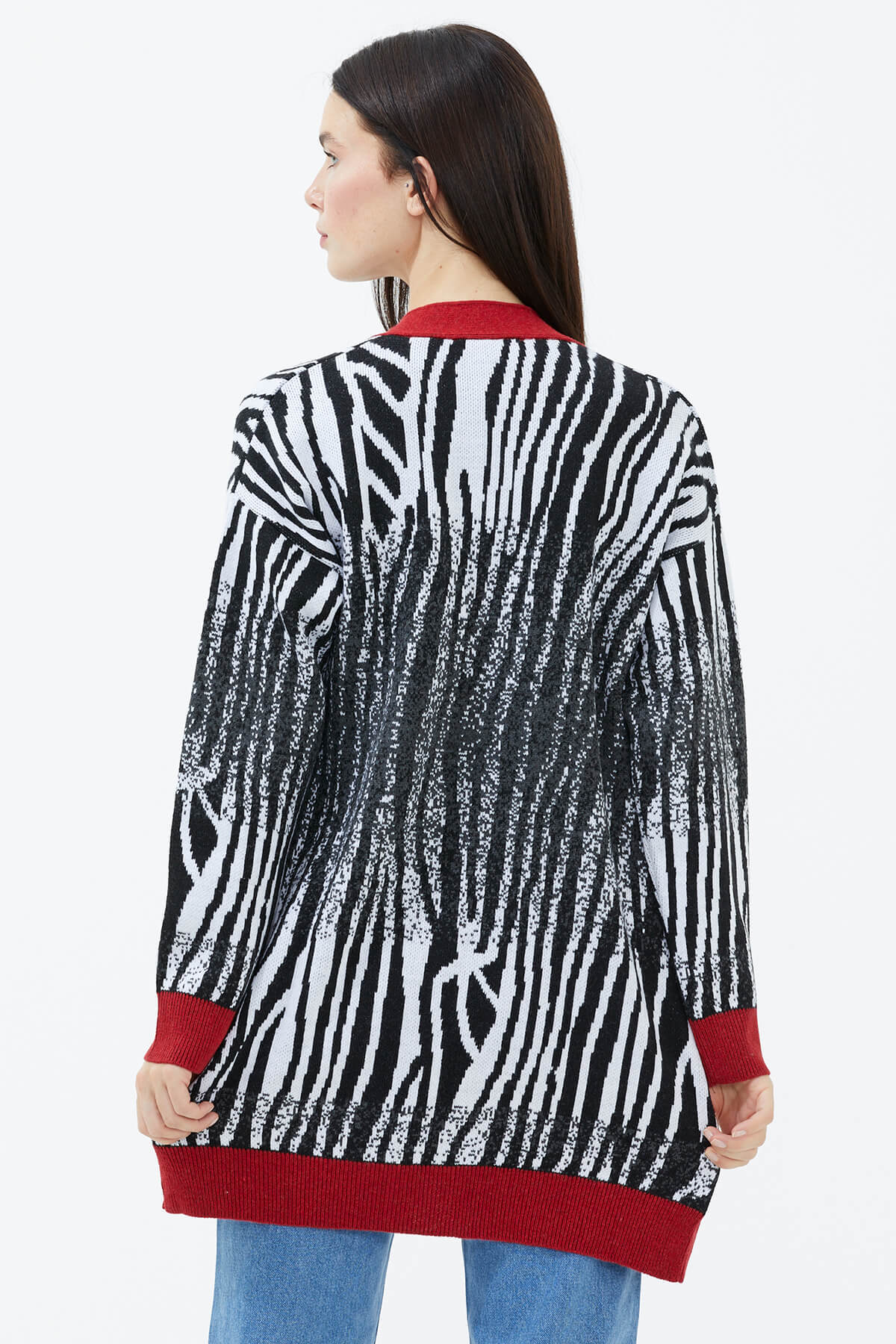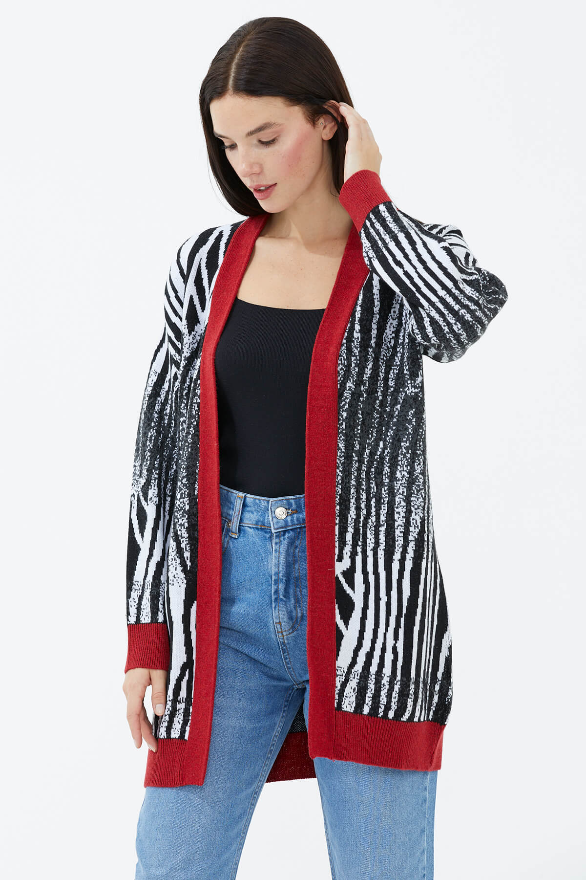 V yaka ve uzun kol detaylı triko hırka, desenli ritmi ile stilinizde yer buluyor. Tarzınızda yenilikçi bir kapı aralayan model, konforu zirvede hissetmenizi sağlıyor. Örme dokusu ile soğuk kış günlerinde sıcacık kalmanıza imkan tanıyan model, ister jean ister deri taytlarla uyum içinde oluyor.