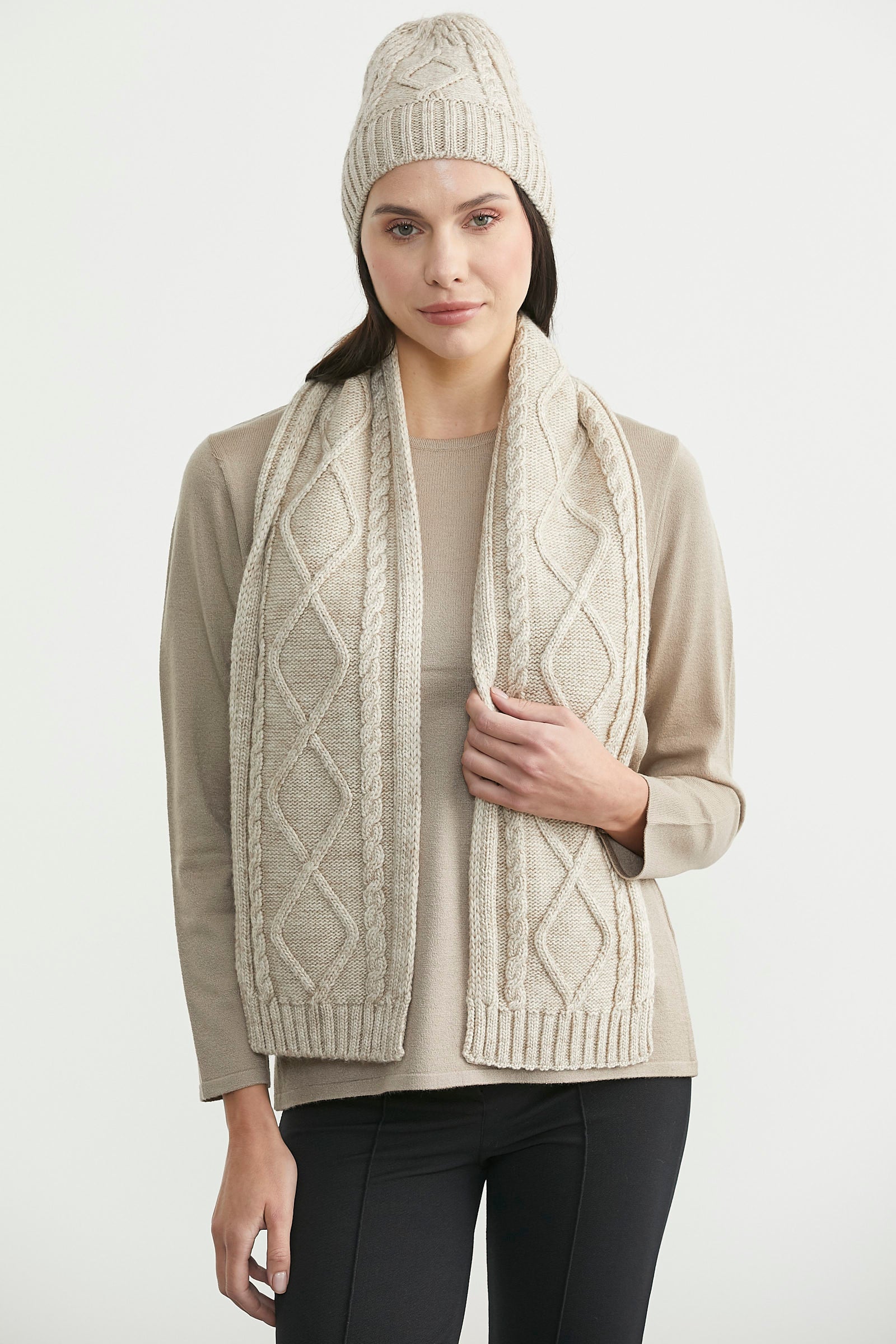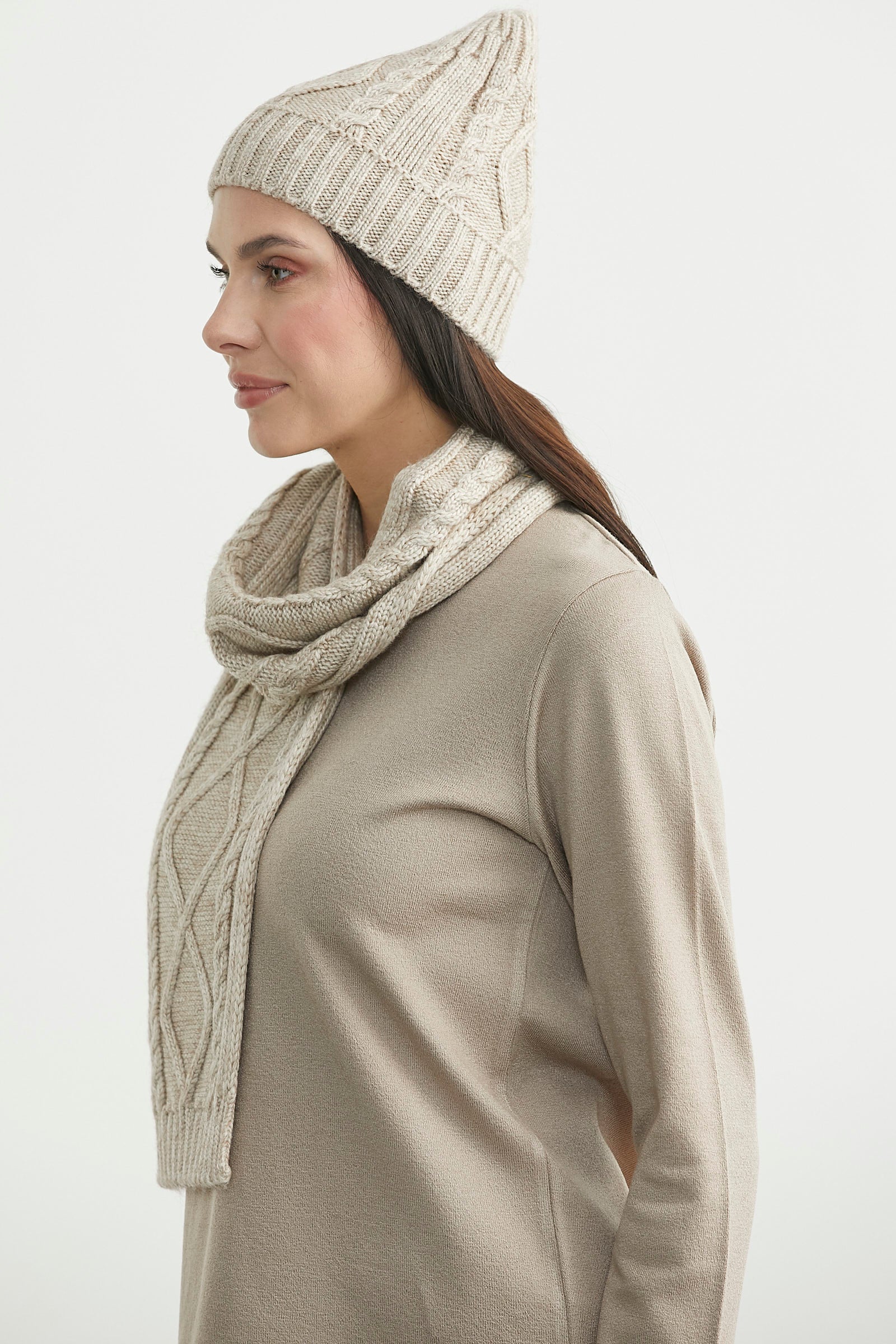 Yün karışımlı iplikten üretilen, kenarı geniş katlı, yumuşak dokulu triko bere.