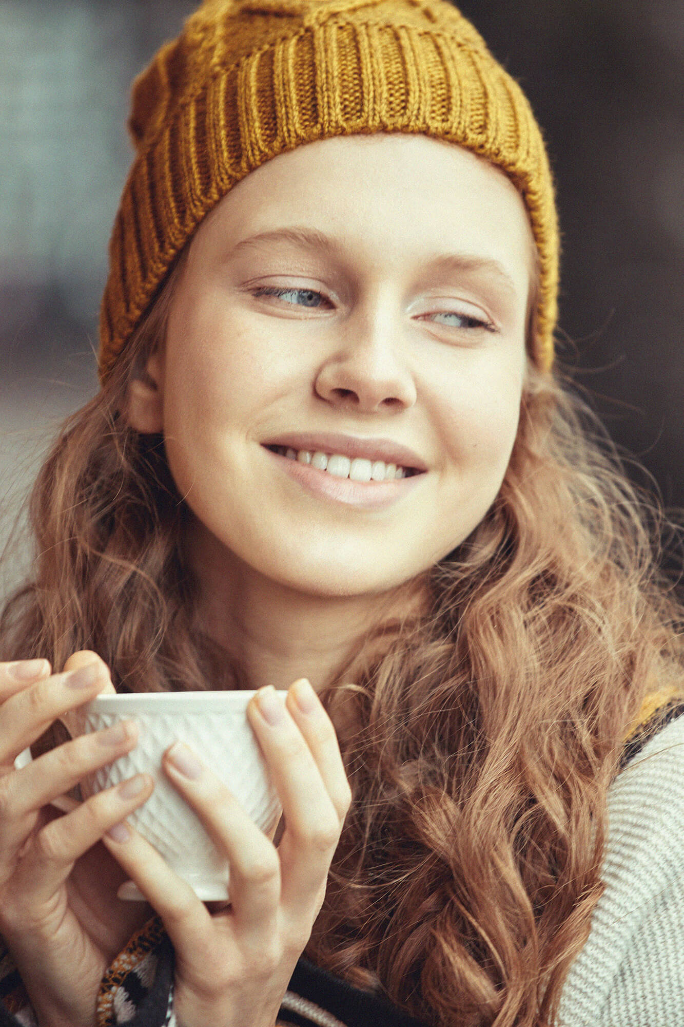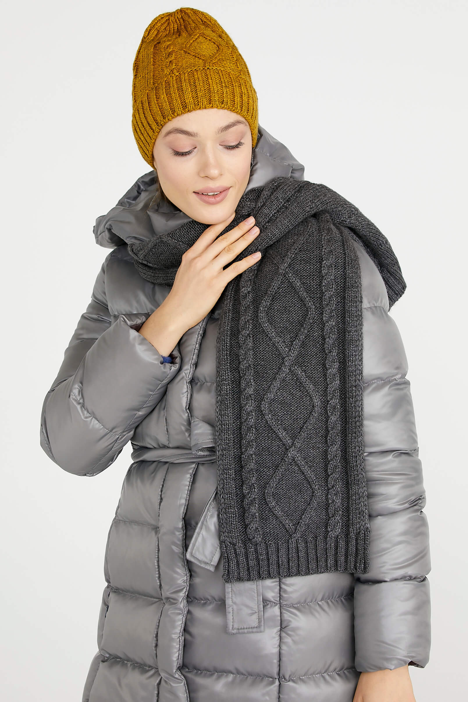 Yün karışımlı iplikten üretilen, kenarı geniş katlı, yumuşak dokulu triko bere.