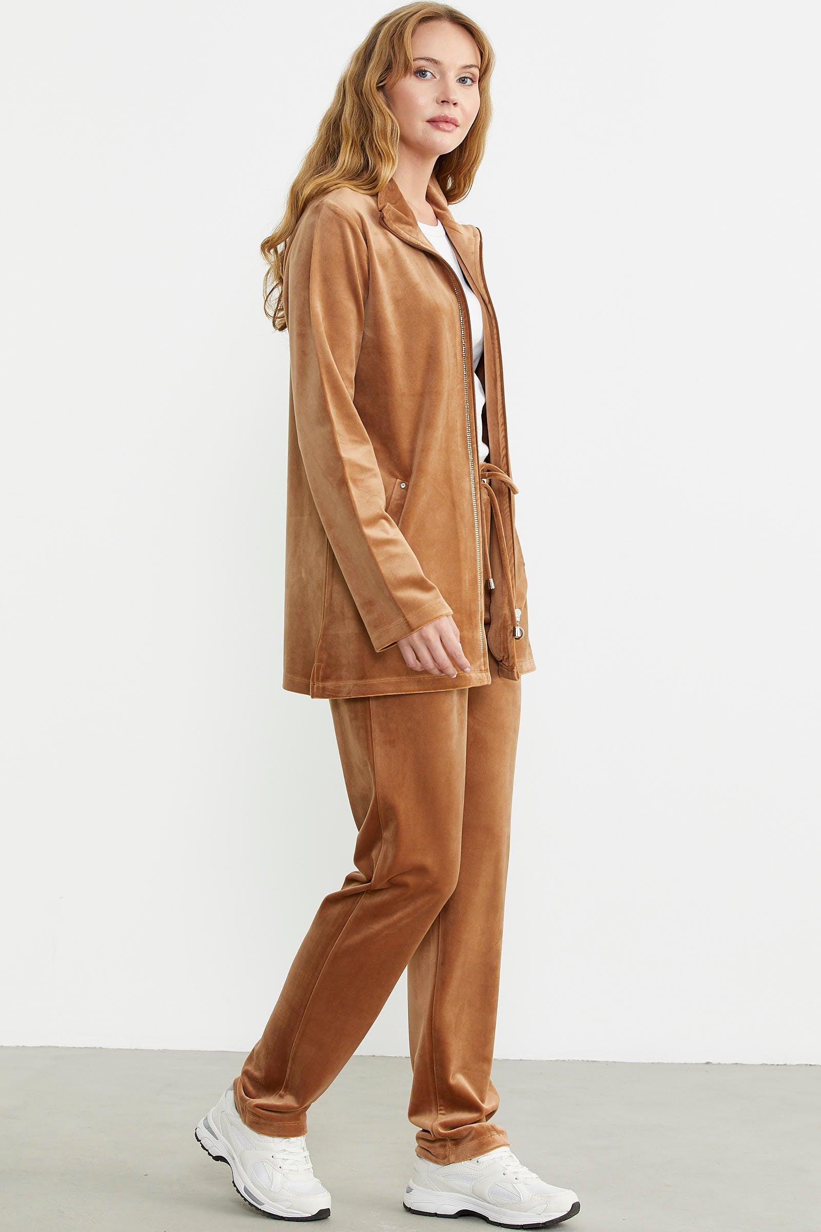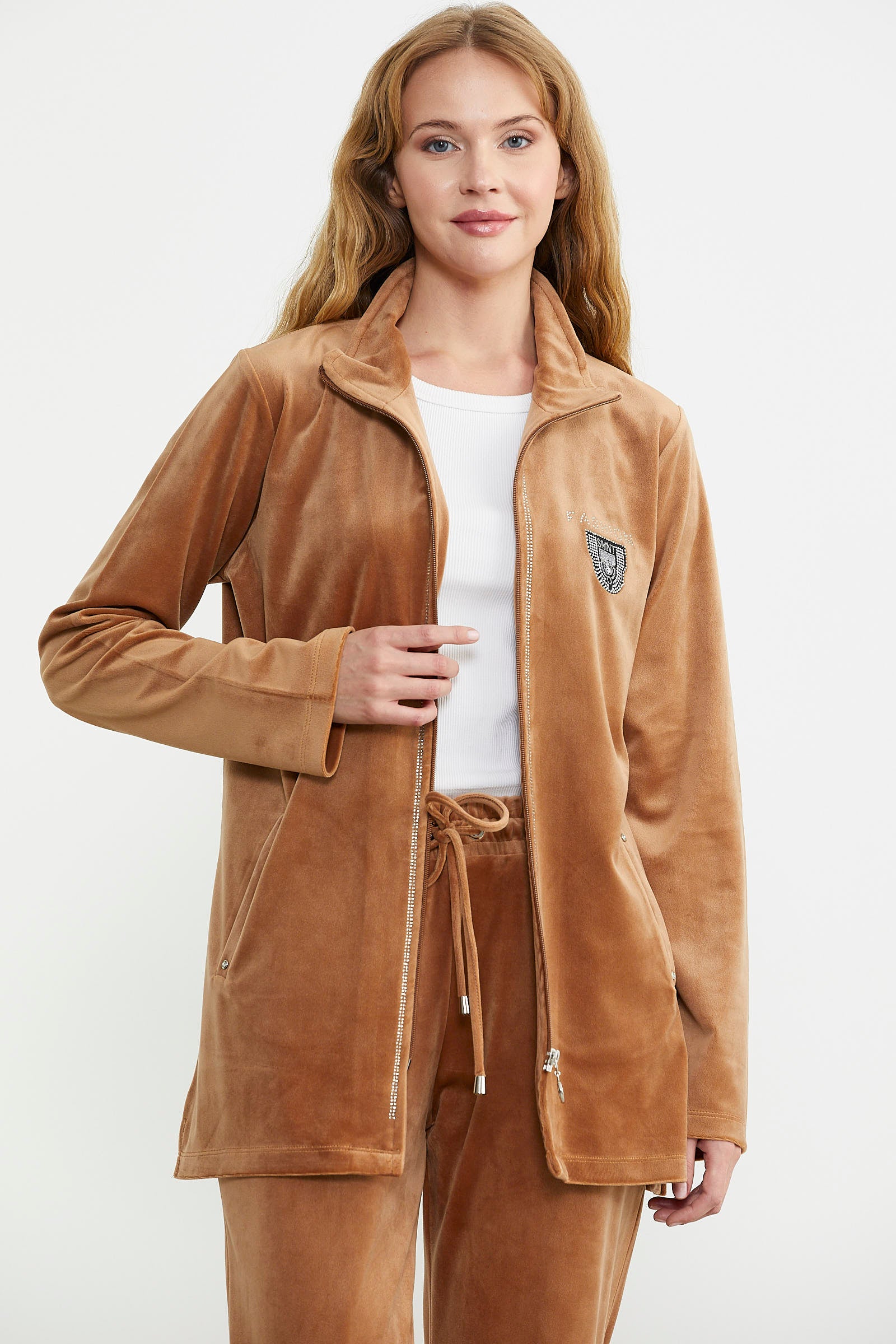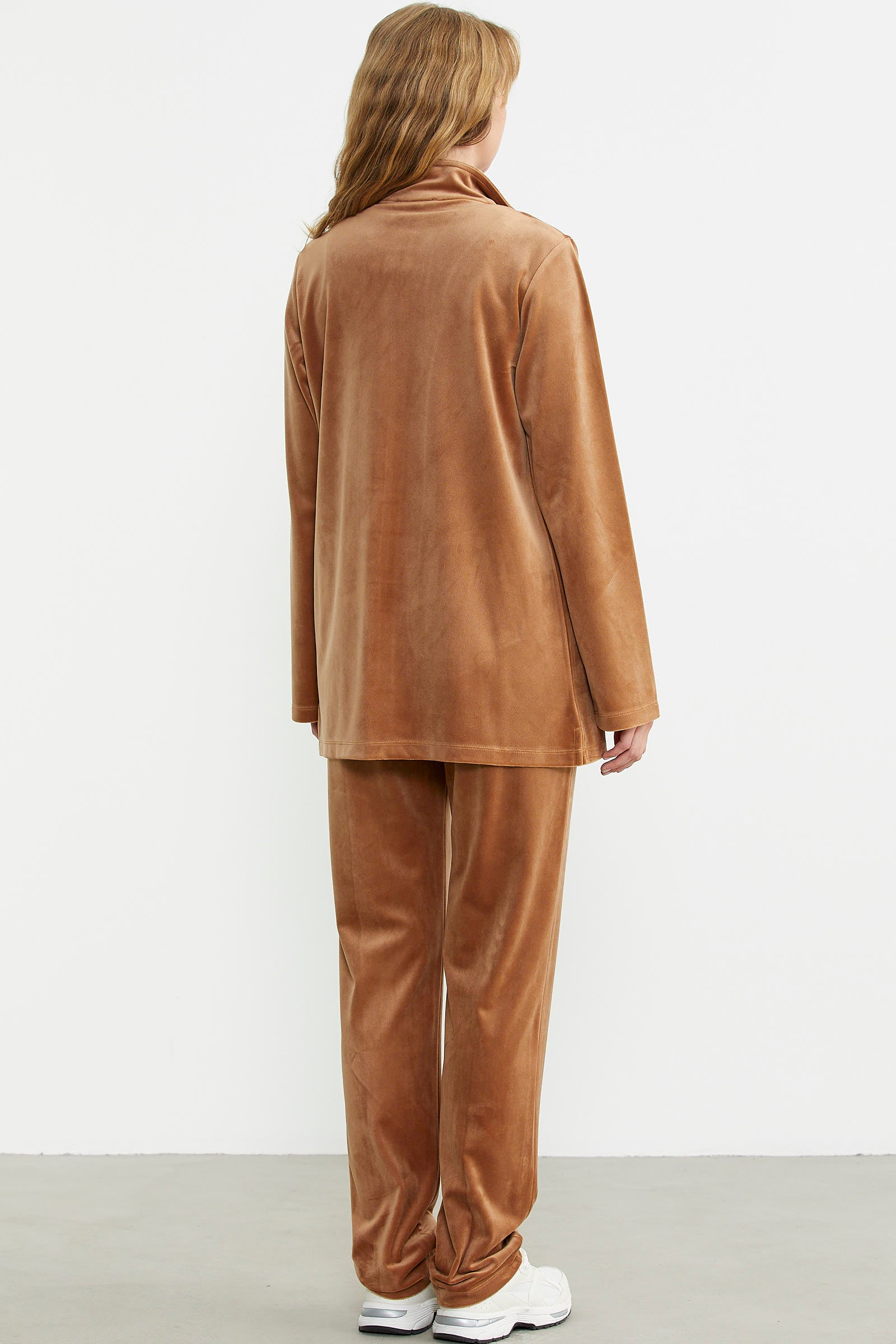 Parlak taş detaylarıyla zarif bir görünüm sunan kadife takım, fonksiyonel cepleri ile kullanım kolaylığı sağlıyor.
