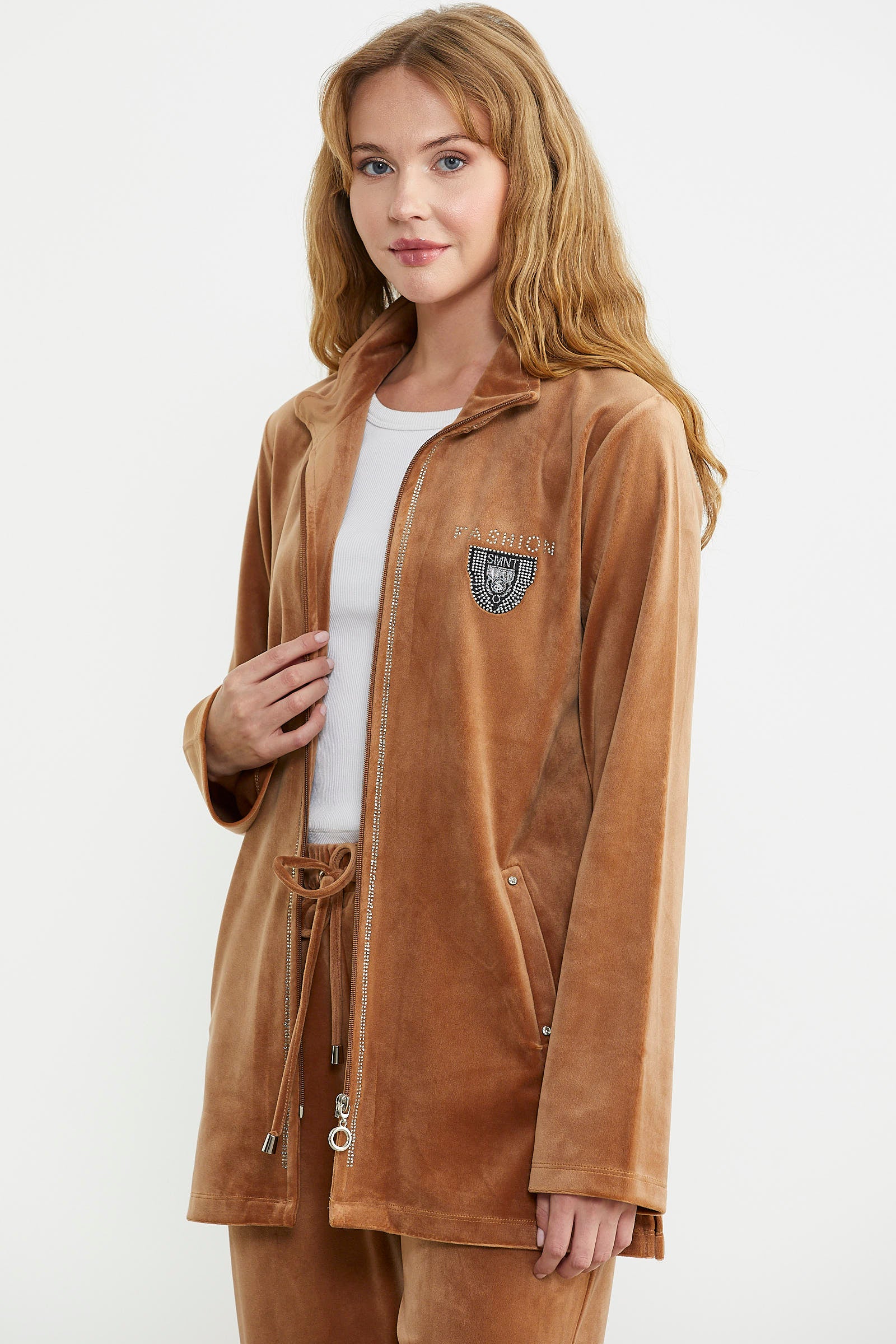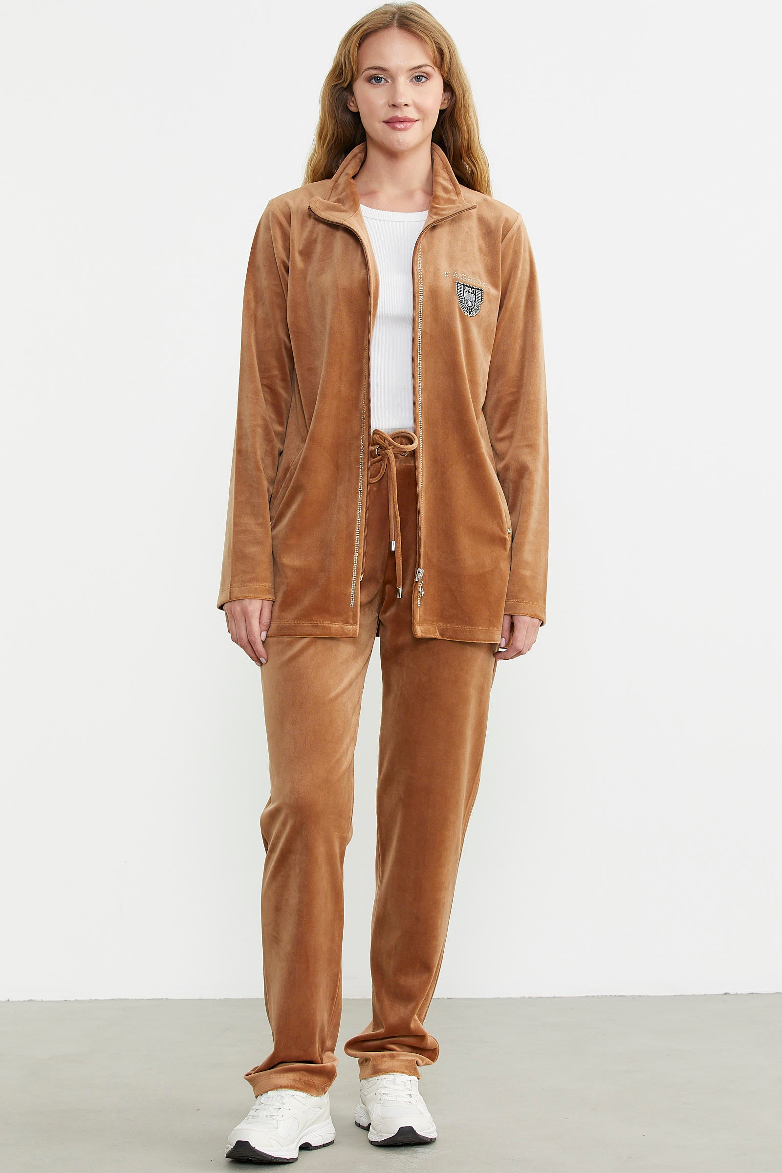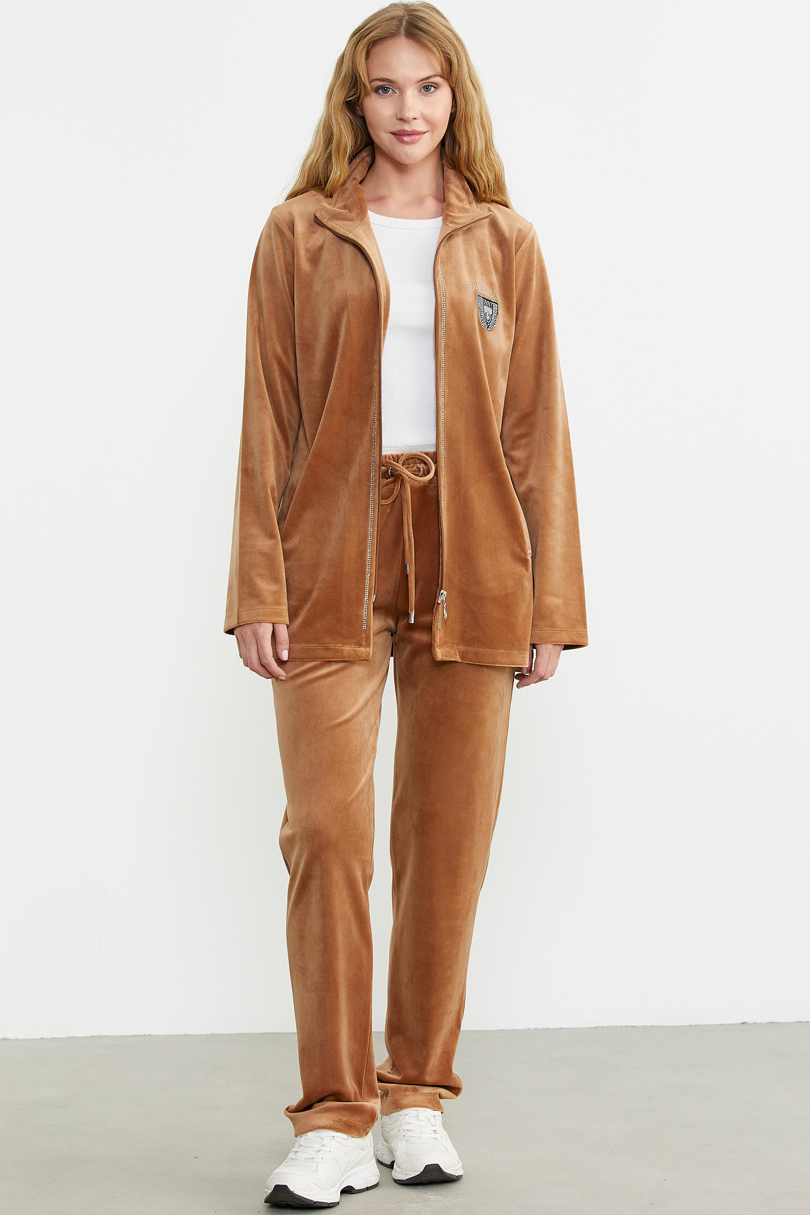 Parlak taş detaylarıyla zarif bir görünüm sunan kadife takım, fonksiyonel cepleri ile kullanım kolaylığı sağlıyor.