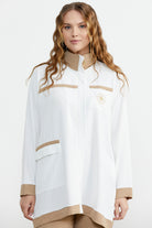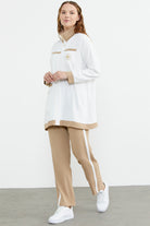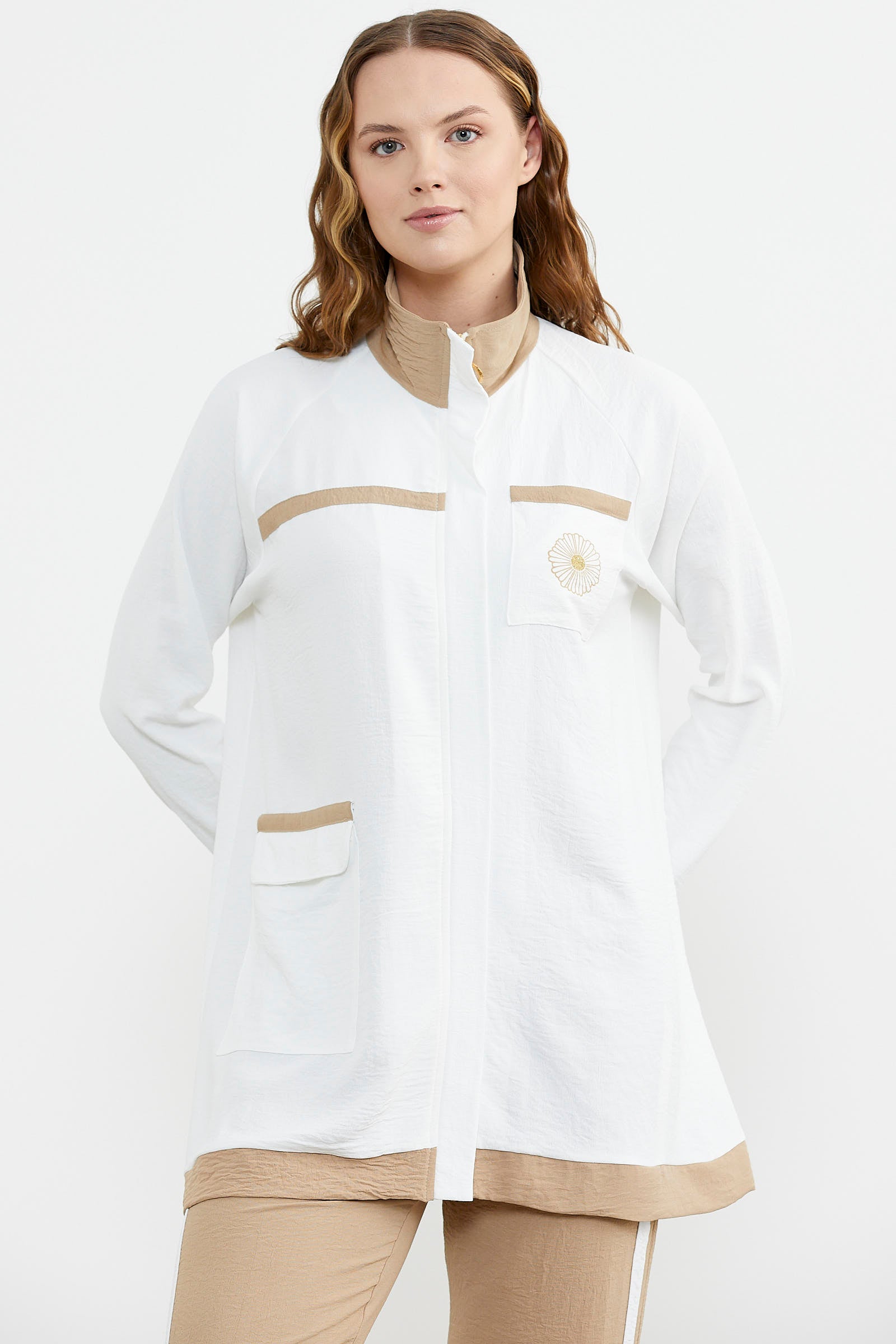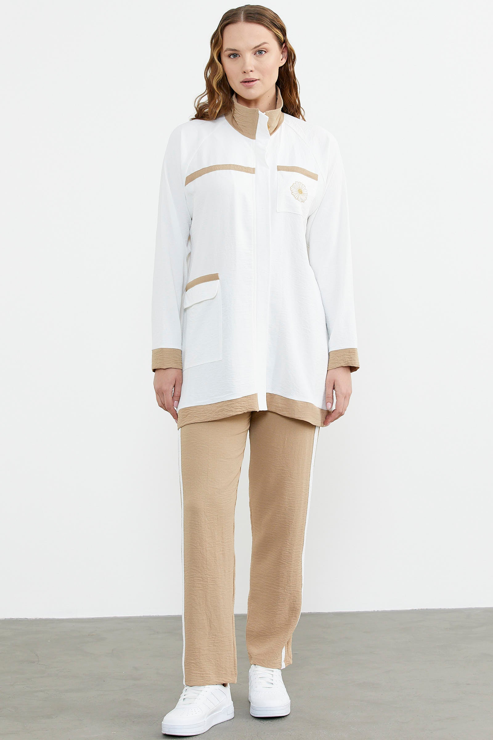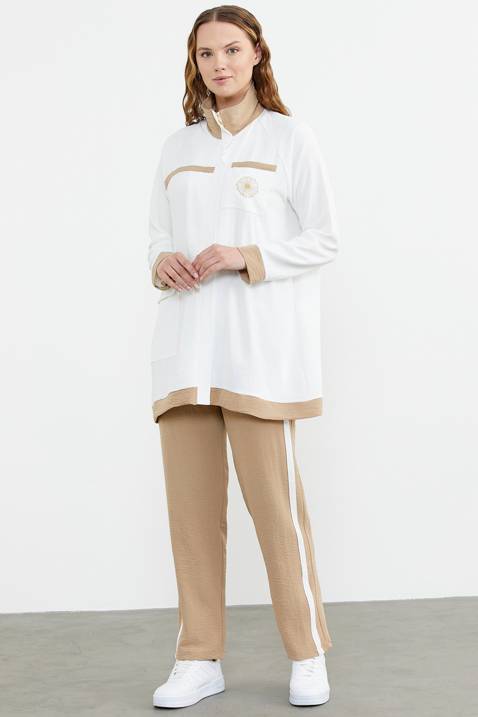 Dik yaka fermuar kapamalı geniş beden krep takım, pastel tonda tasarlanan pantolon ve onunla uyumlu üst beden kombiniyle şıklığın ve rahatlığın temsilcisi.