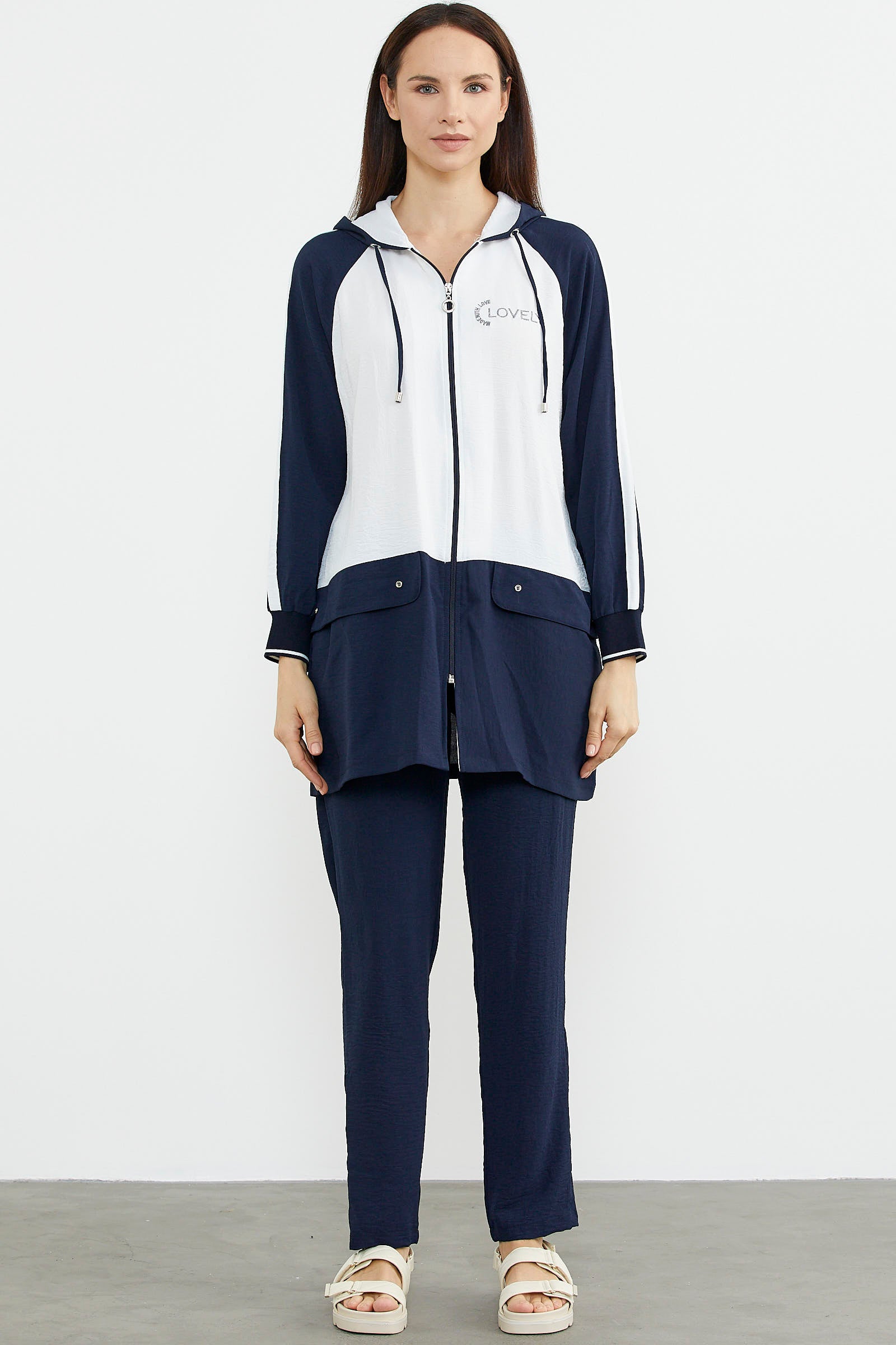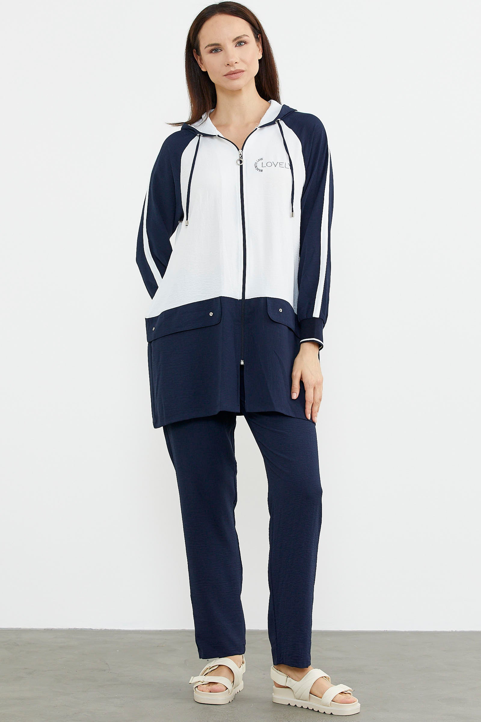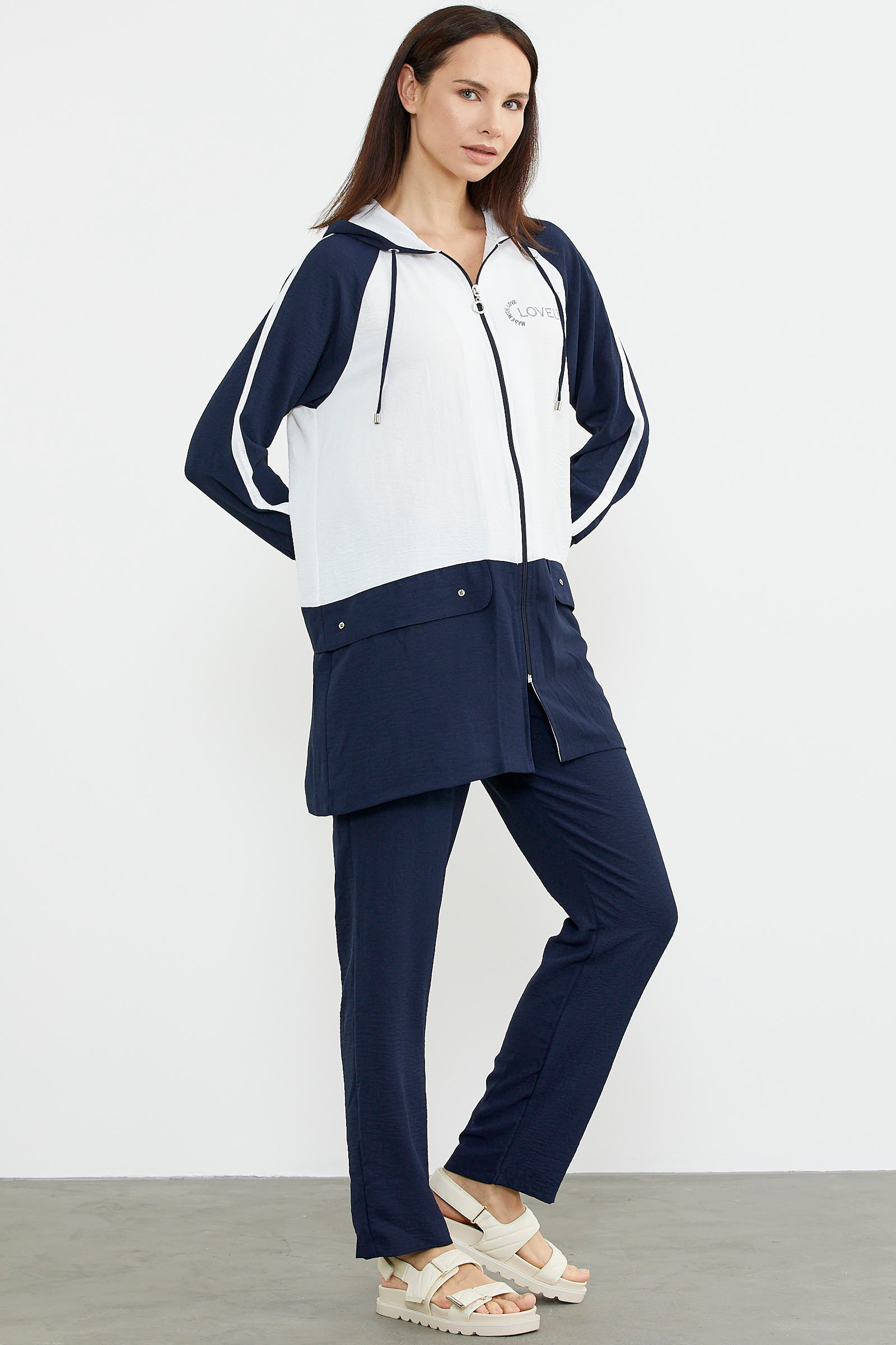 Kapüşonlu, uzun kollu, fermuar kapamasıyla kullanım kolaylığı sunan krep tunik takıma boru paça pantolon eşlik ediyor.