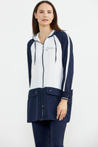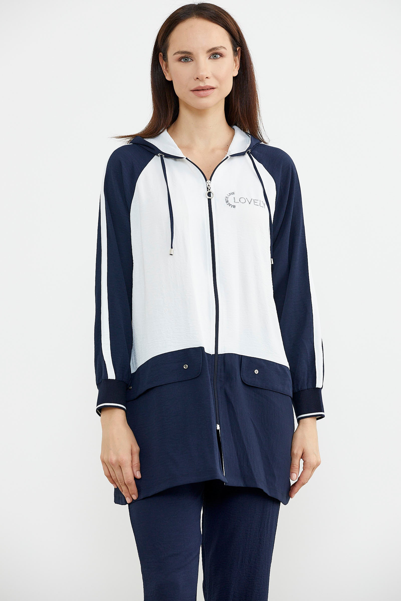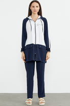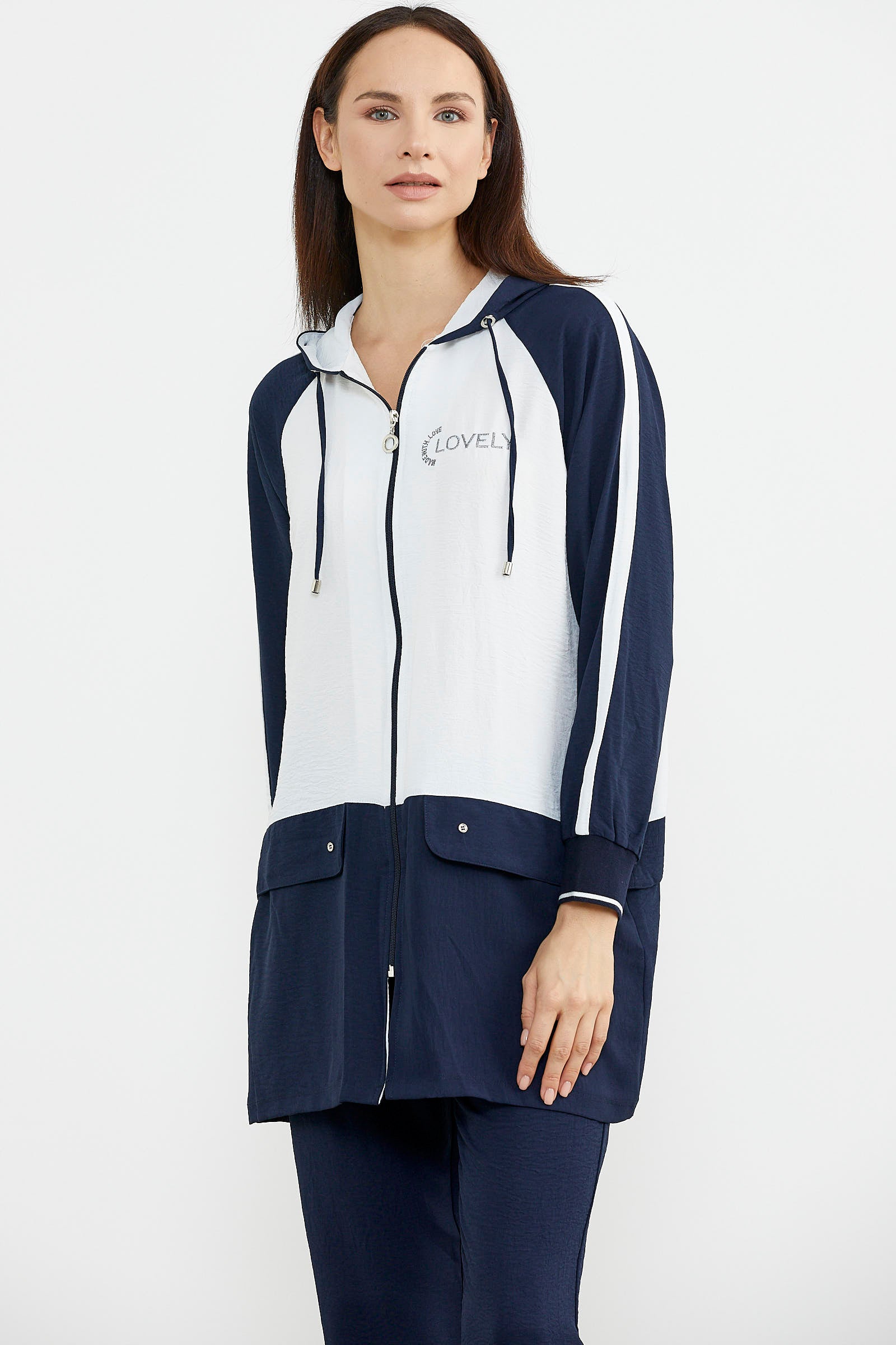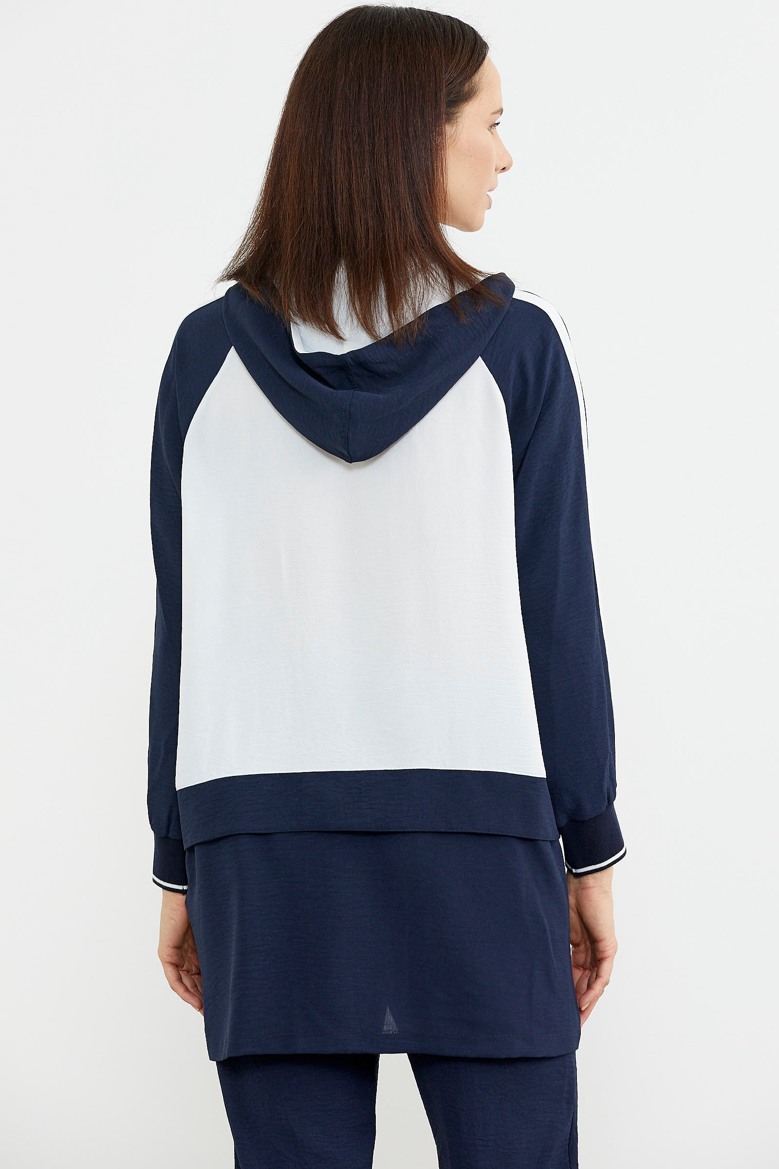 Kapüşonlu, uzun kollu, fermuar kapamasıyla kullanım kolaylığı sunan krep tunik takıma boru paça pantolon eşlik ediyor.