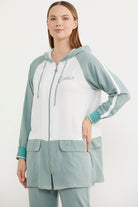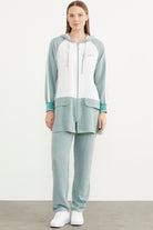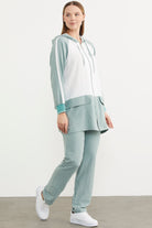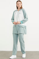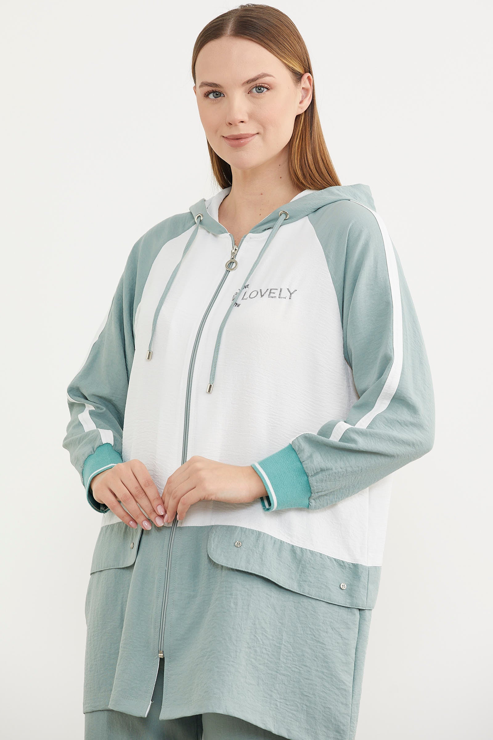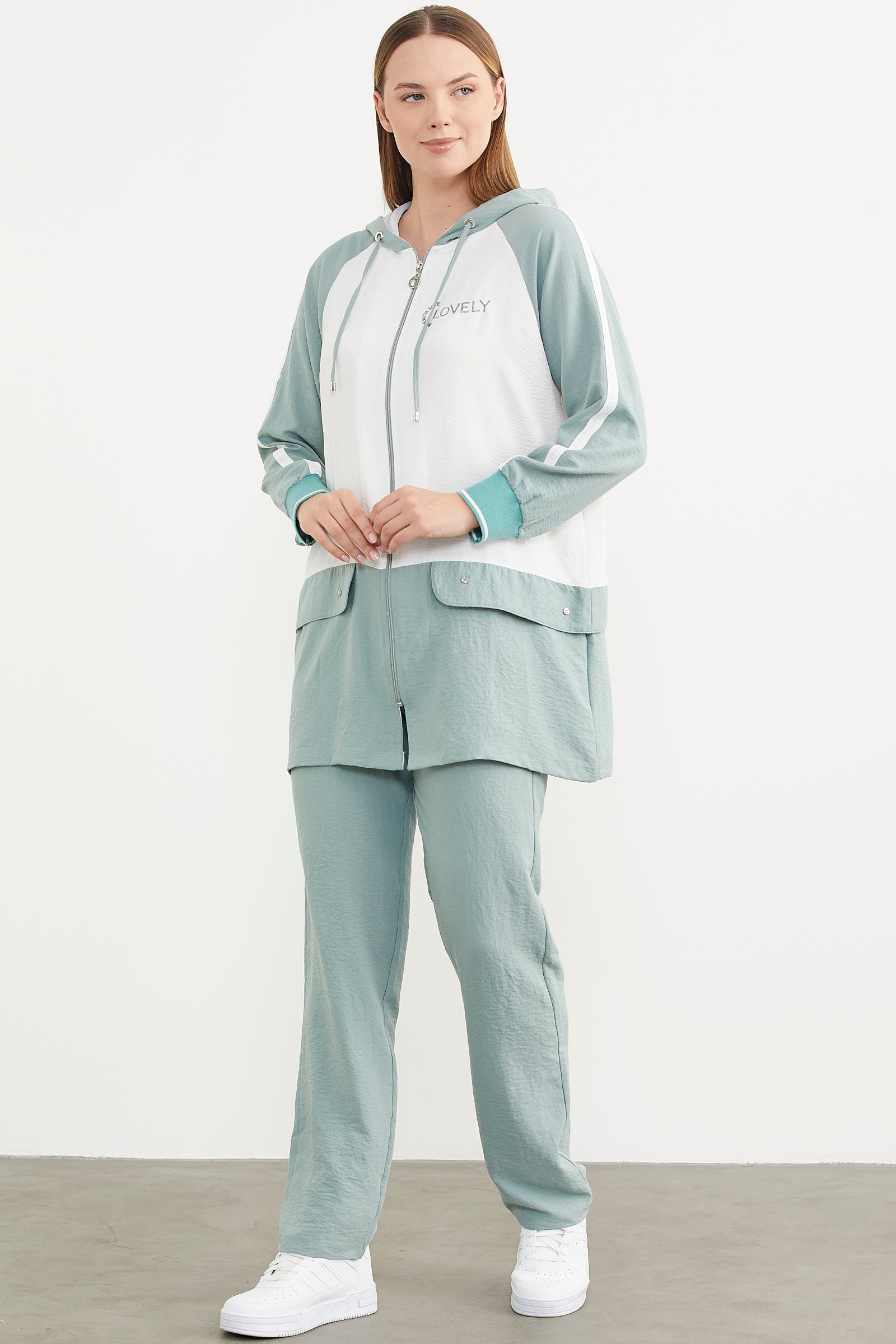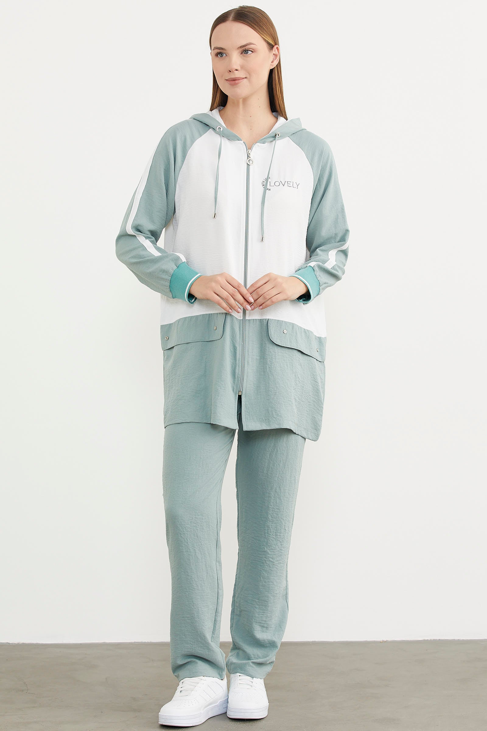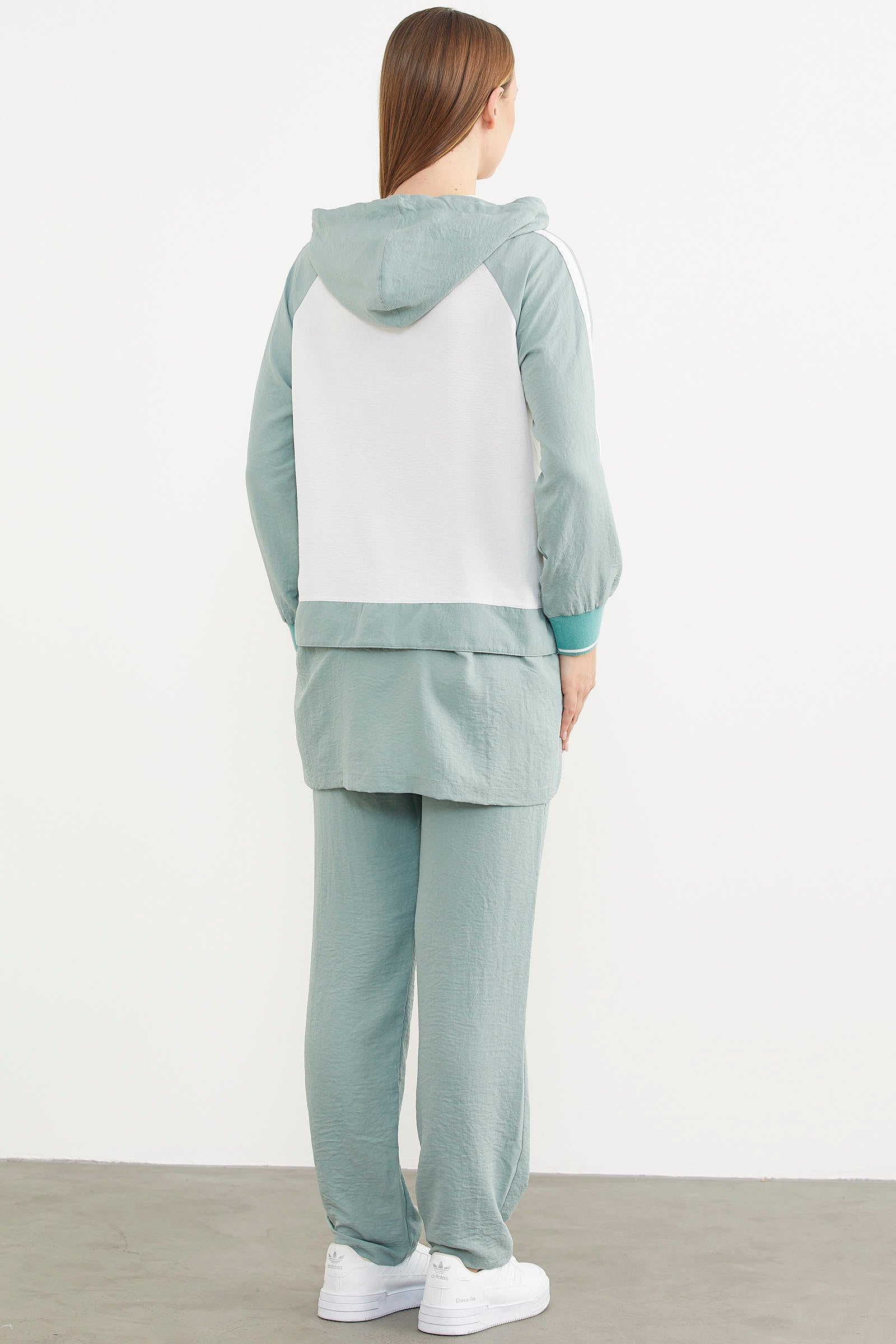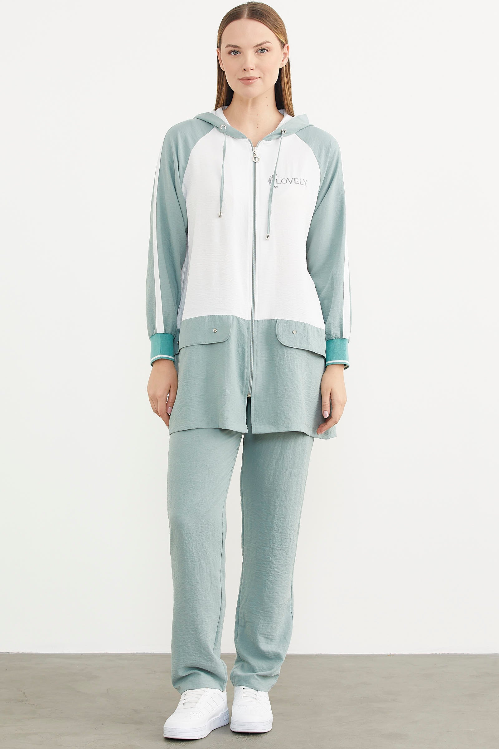 Kapüşonlu, uzun kollu, fermuar kapamasıyla kullanım kolaylığı sunan krep tunik takıma boru paça pantolon eşlik ediyor.