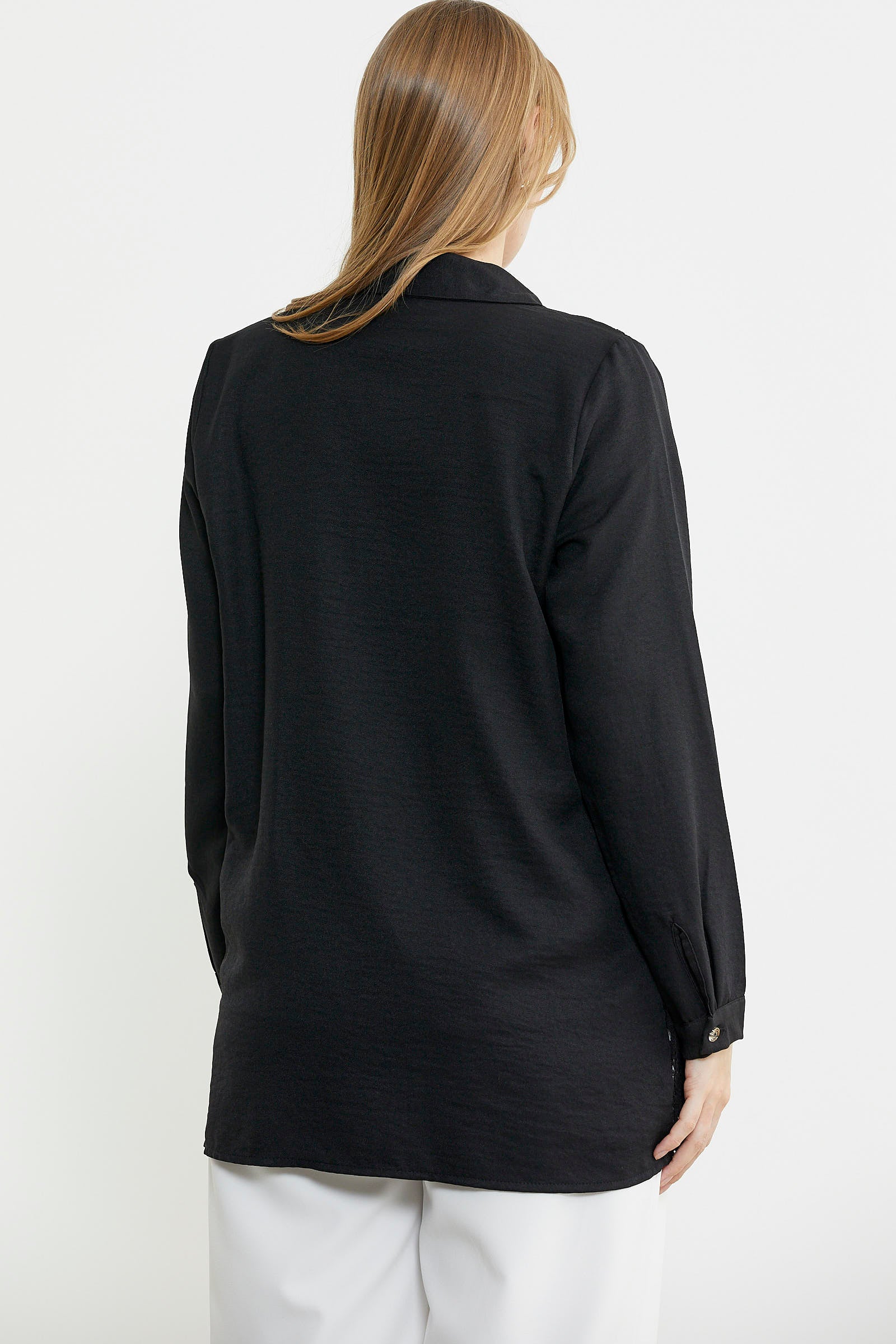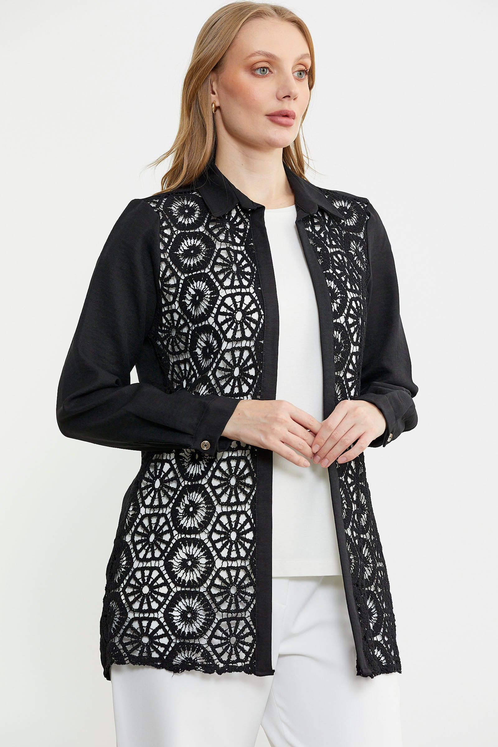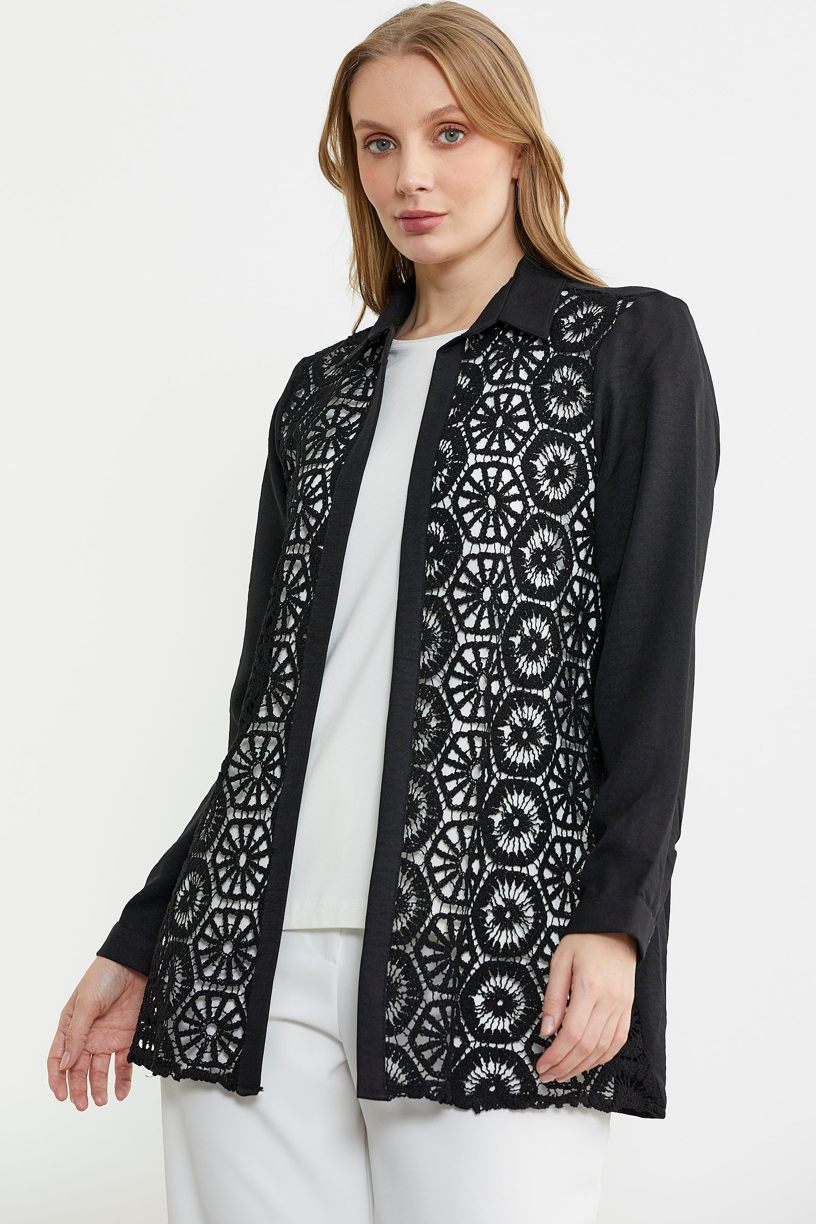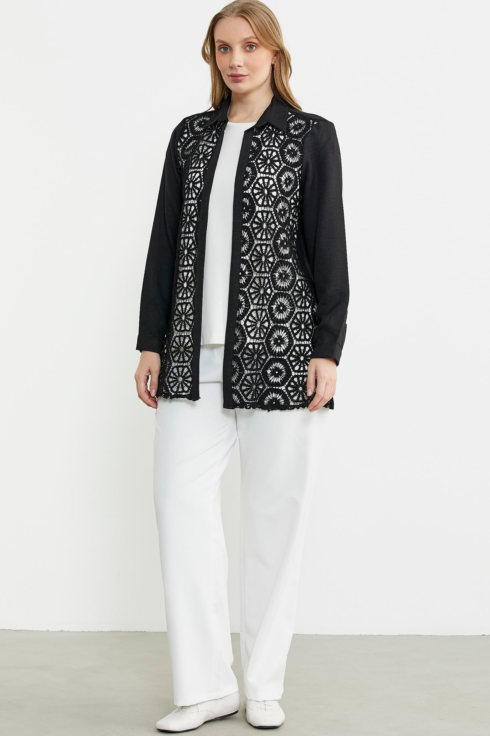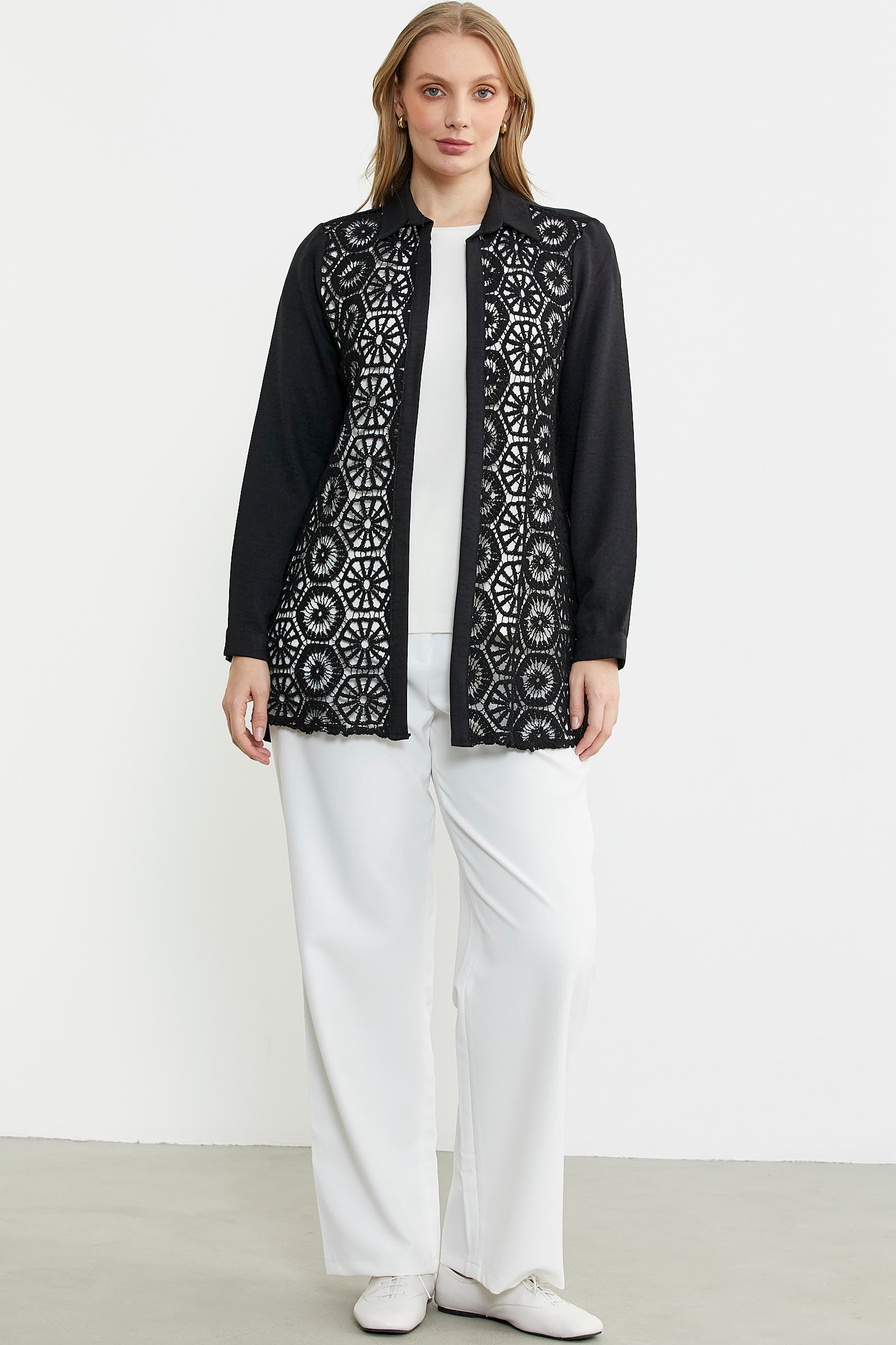 Sıfır yaka bluz ve ön bedeni dantel detaylı gömlekten oluşan ikili takım.Rahat kalıp olarak üretilmiştir.