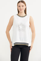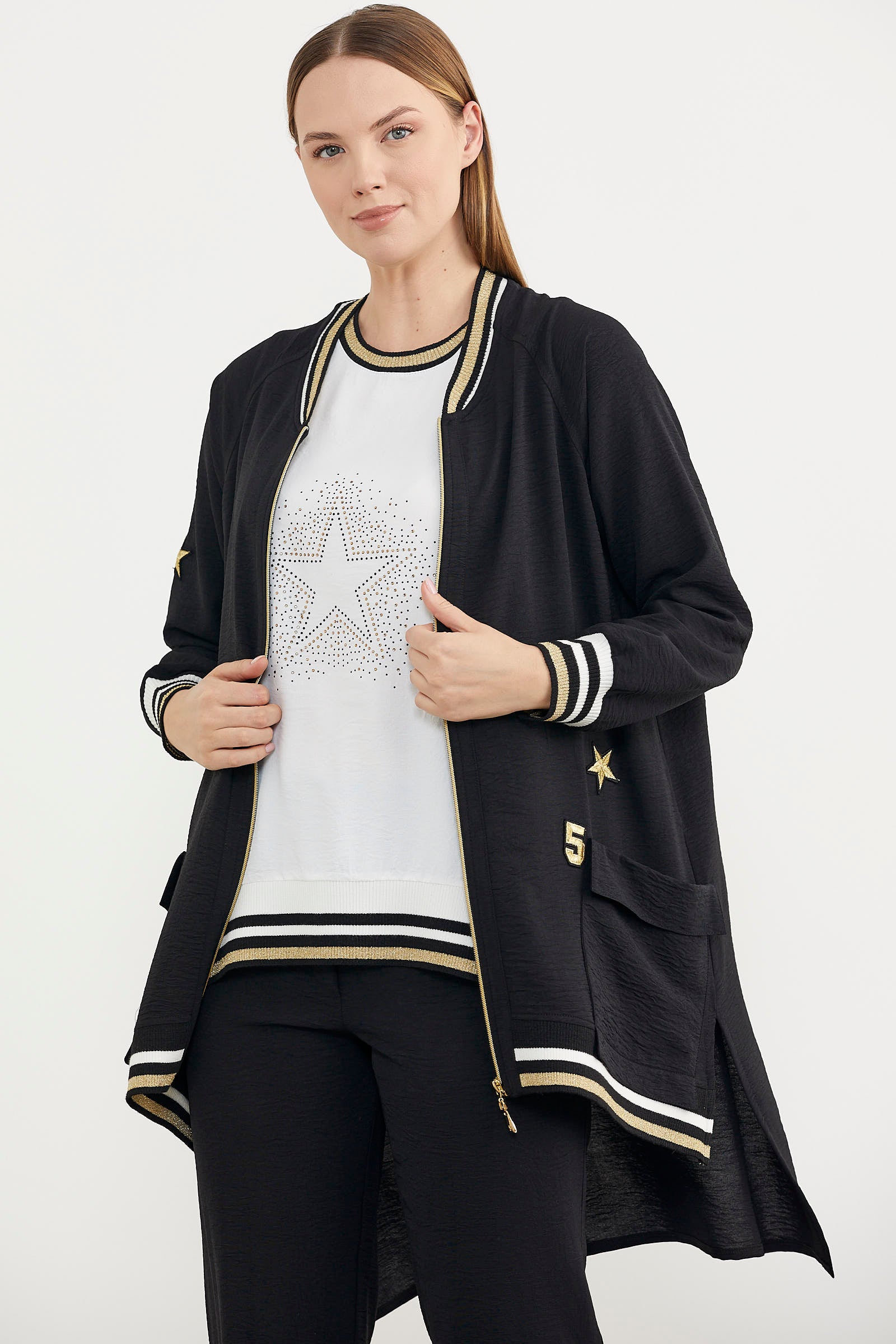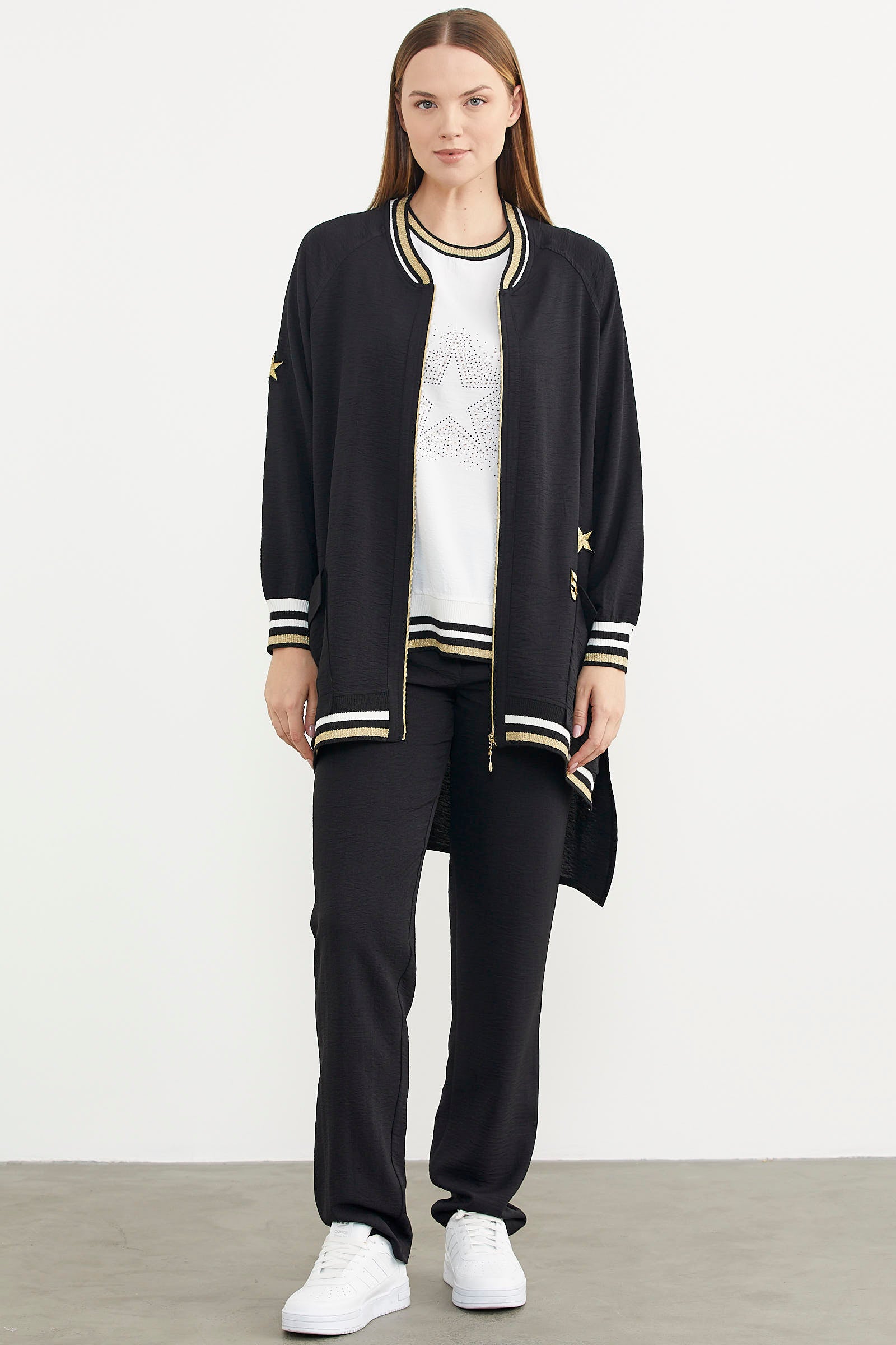 Uzun kollu, fermuar kapamasıyla kullanım kolaylığı sunan, taş detaylı tunik. kolsuz önü taş detaylı bluz ve beli lastikli, boru paça pantolondan oluşan takım ile siz de etkileyici görünümler yaratın.