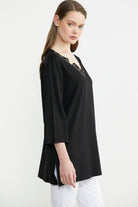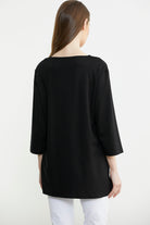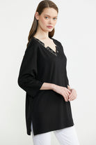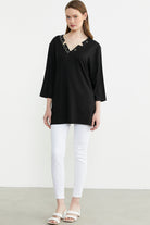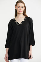 Büyük beden için özel olarak tasarlanmıştır. Yakadaki nakış ve asimetri tişörte modernlik ve şıklık katmaktadır. Truvakar kol, rahat kalıptır.