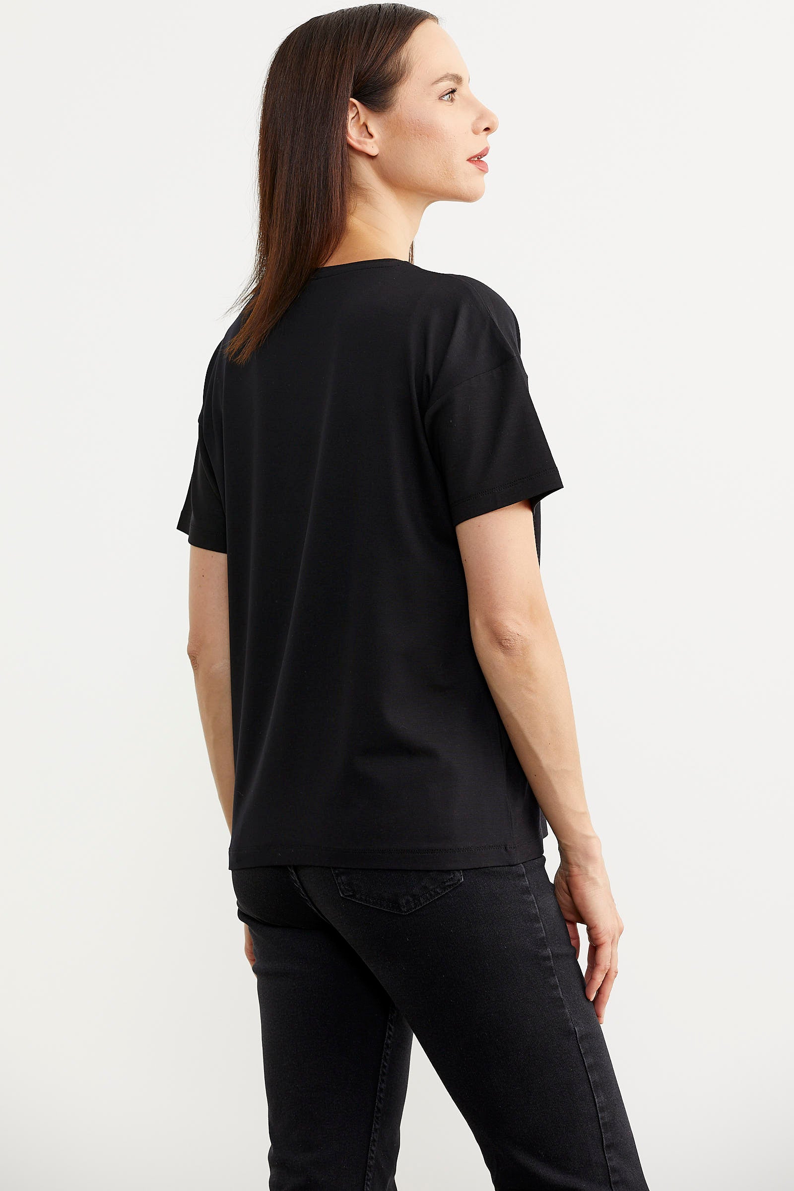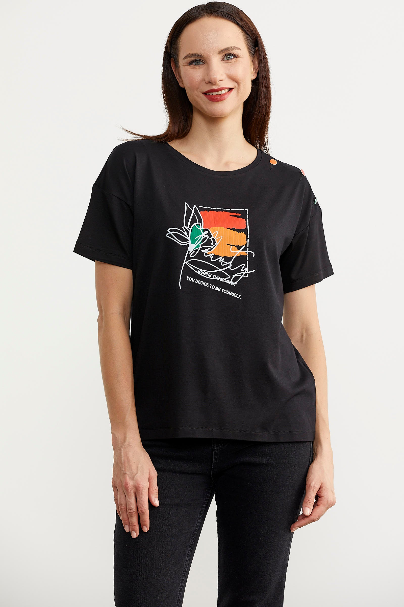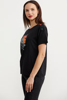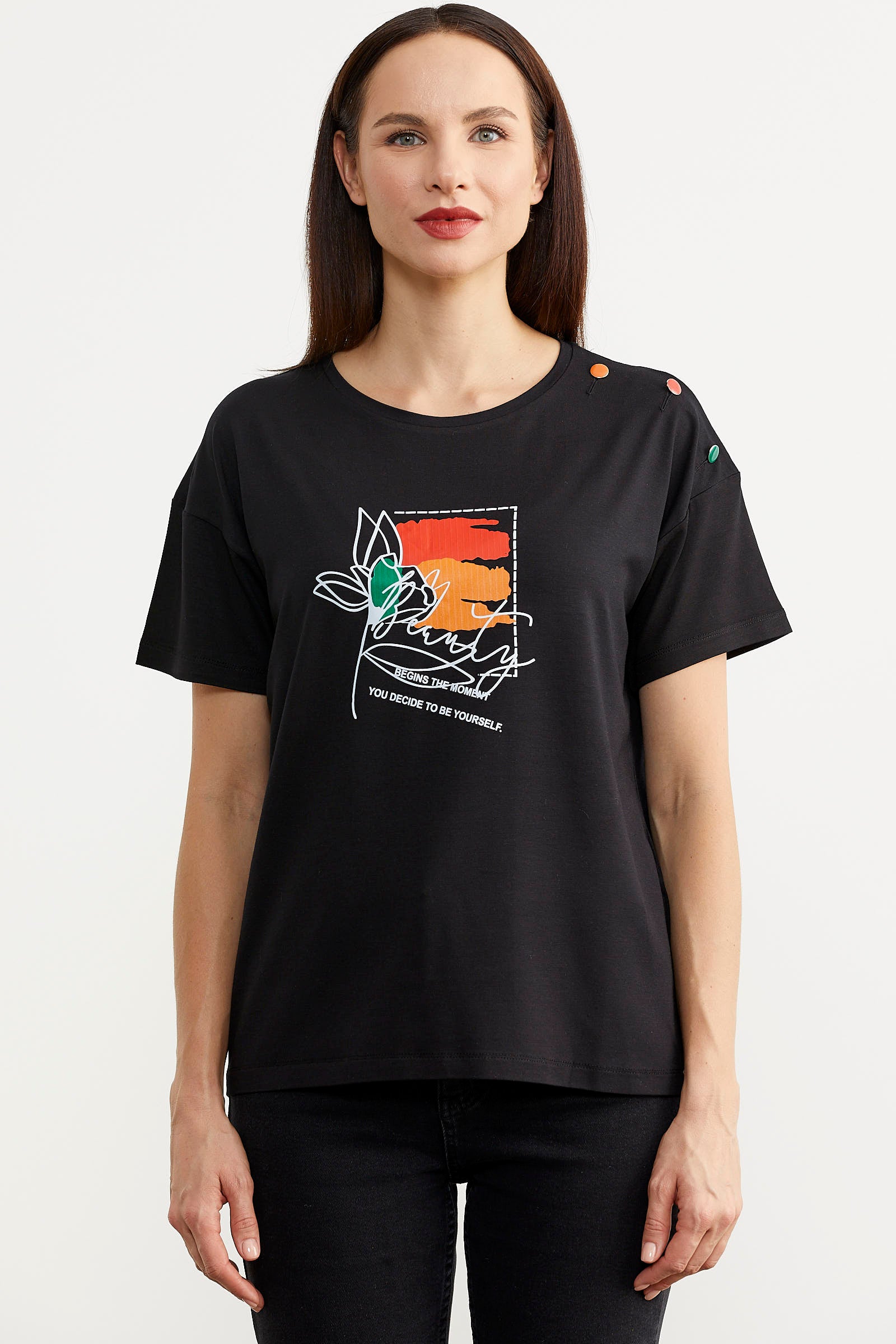 Omuz Düğme Detaylı Baskılı Tişört - Siyah