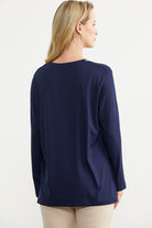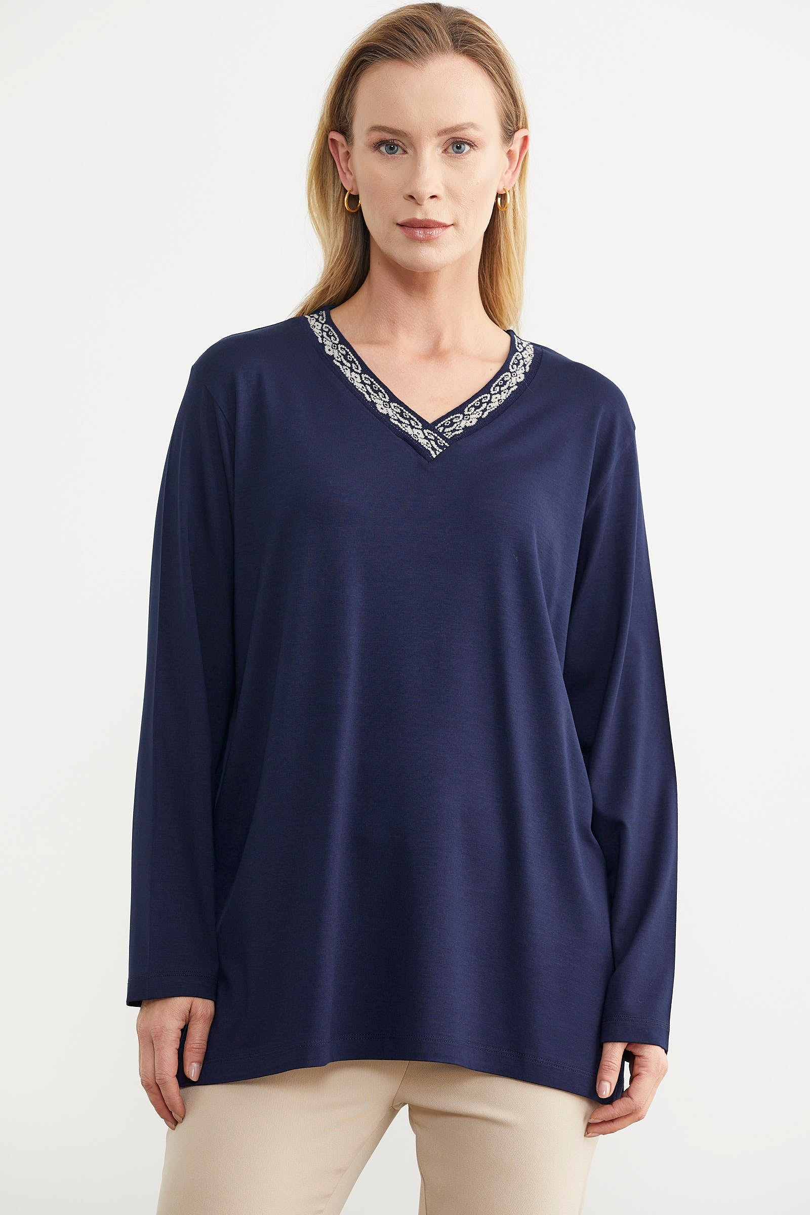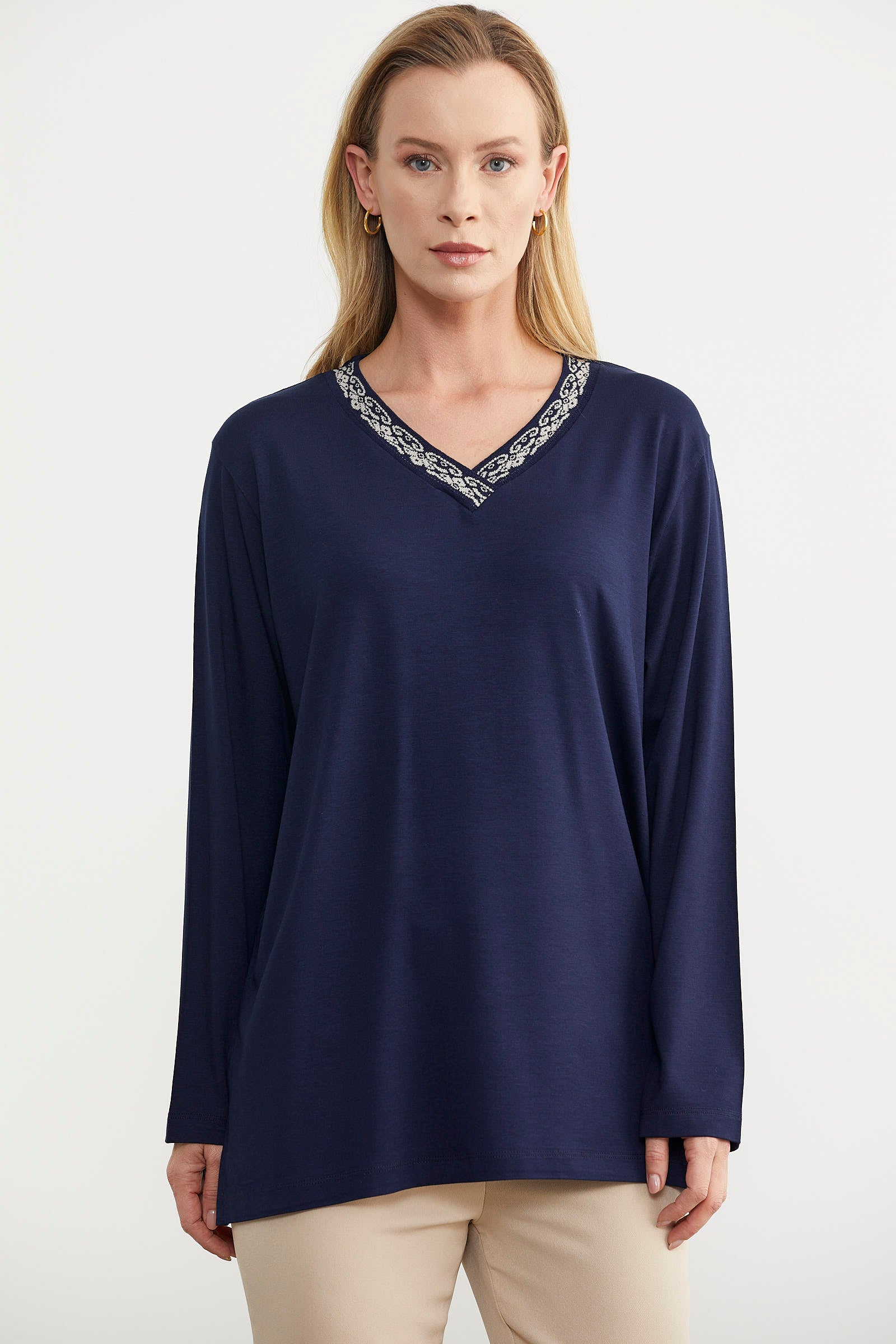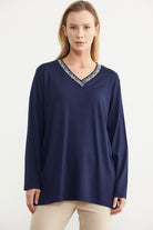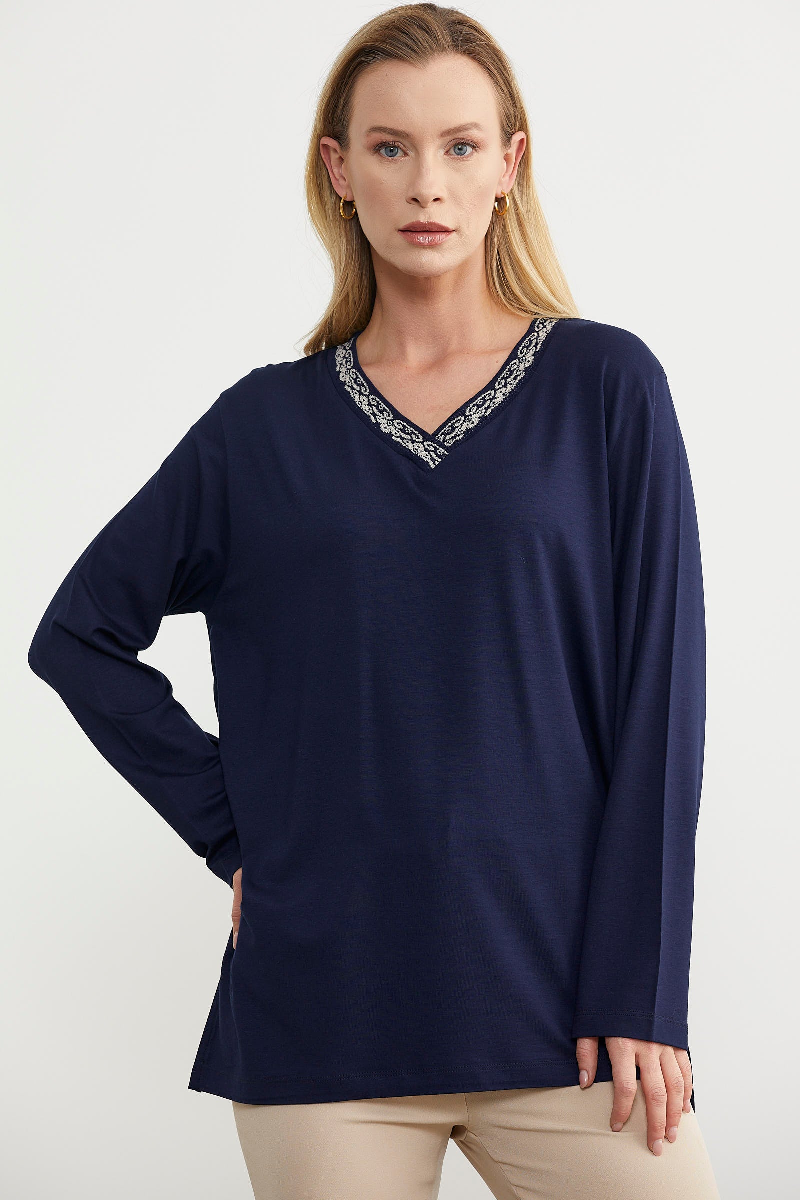 Yaka Detaylı Uzun Kol Tişört - Lacivert