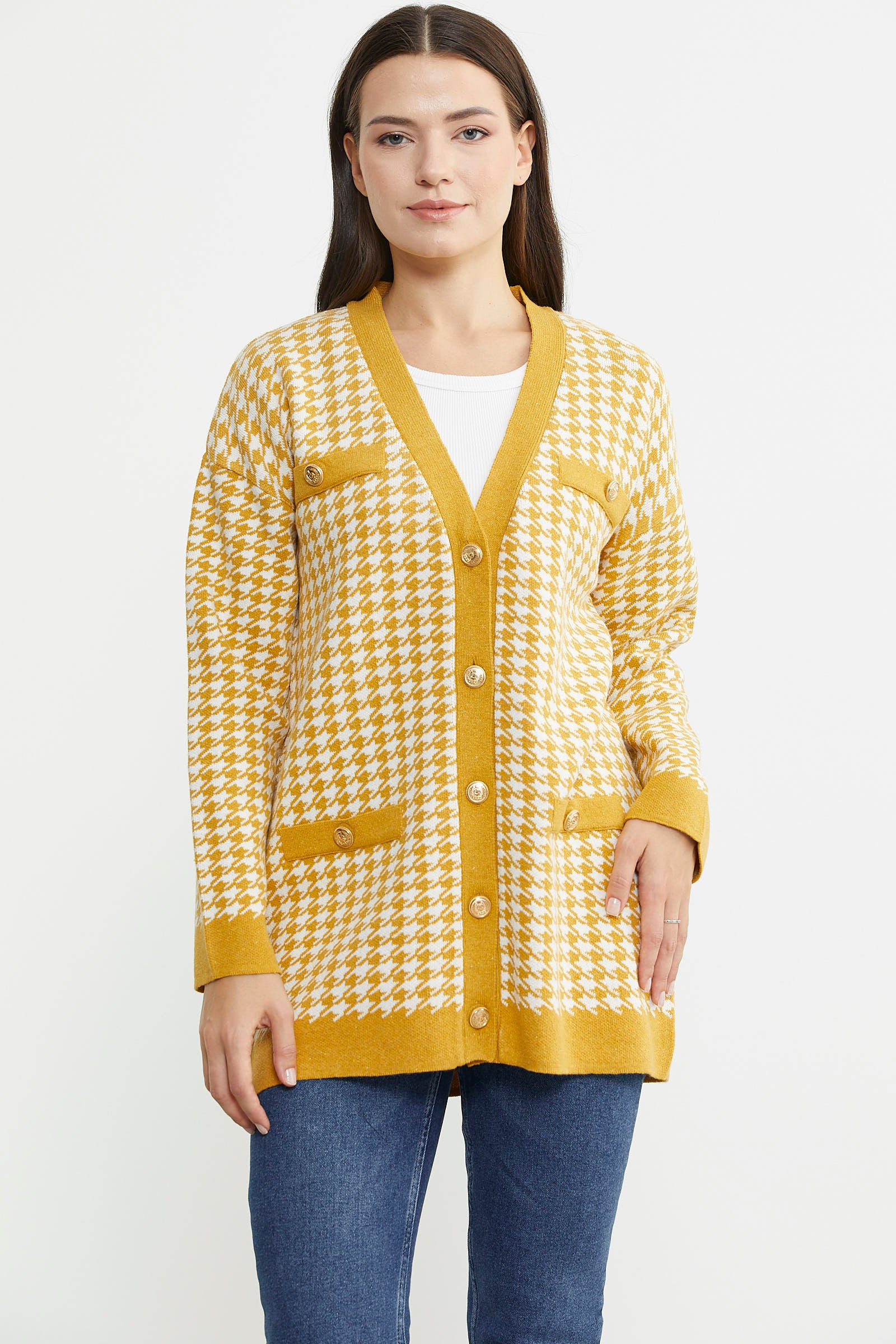 Büyük beden, kazayağı desenli, tunik boy triko ceket şıklığınızın tamamlayıcısı olmaya aday. Metal düğme detayı ile öne çıkmaktadır.