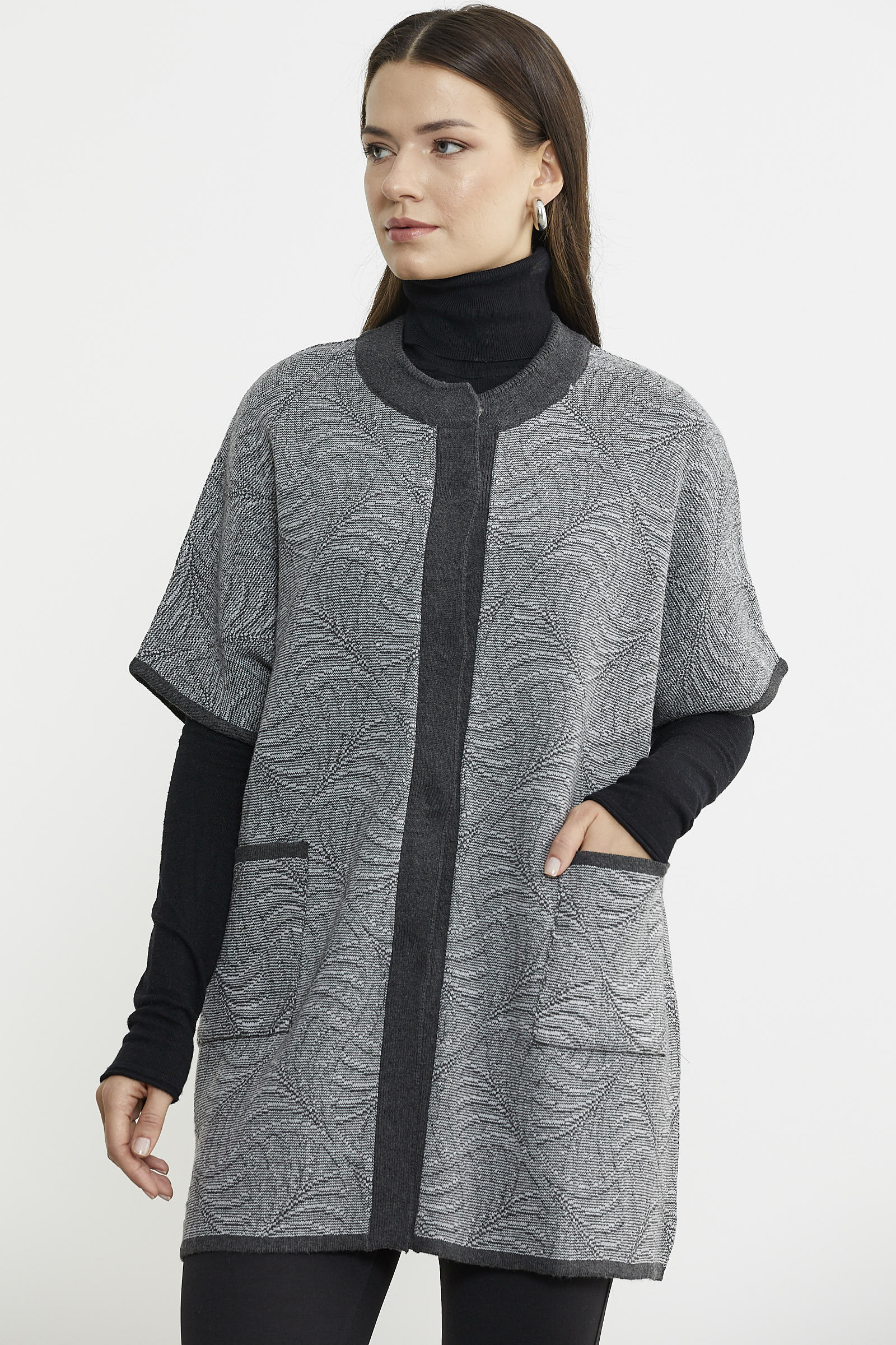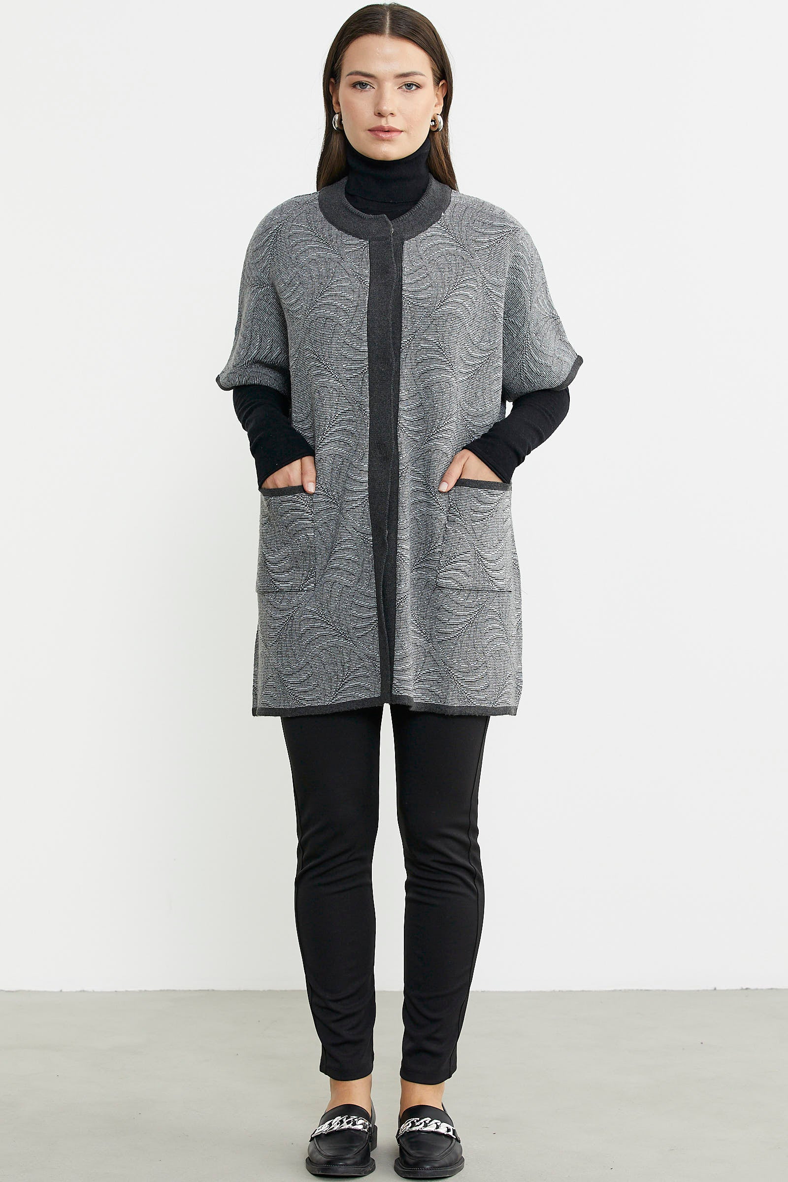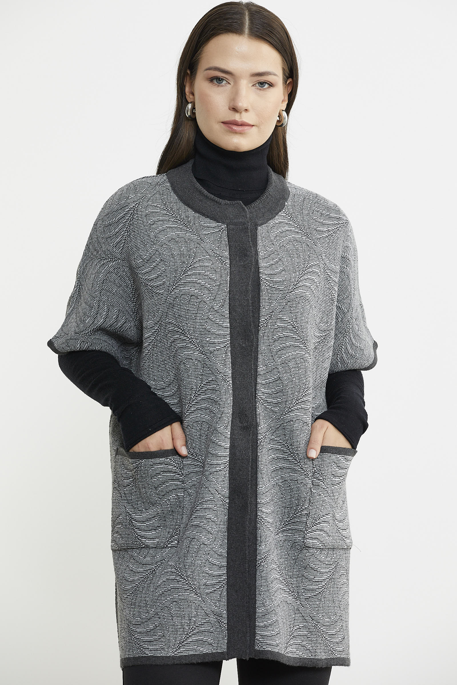 Jakarlı örgünün düz biyeyle birlikte kullanıldığı cepli triko hırka tunik boy üretilmiştir. Yüksek oranda yün içerir.