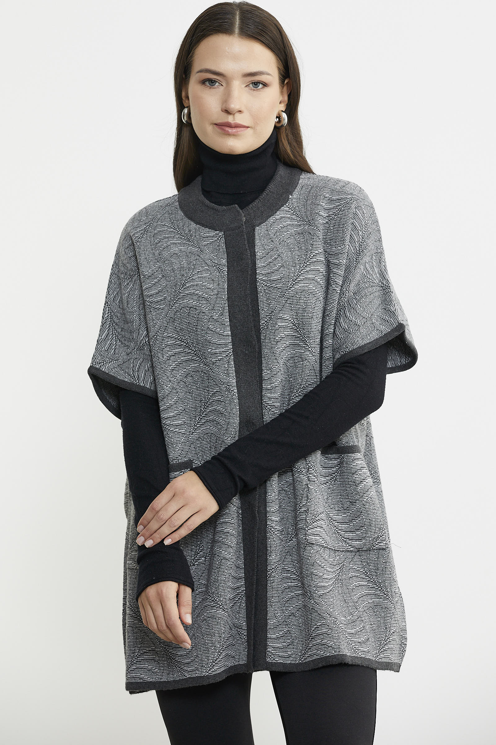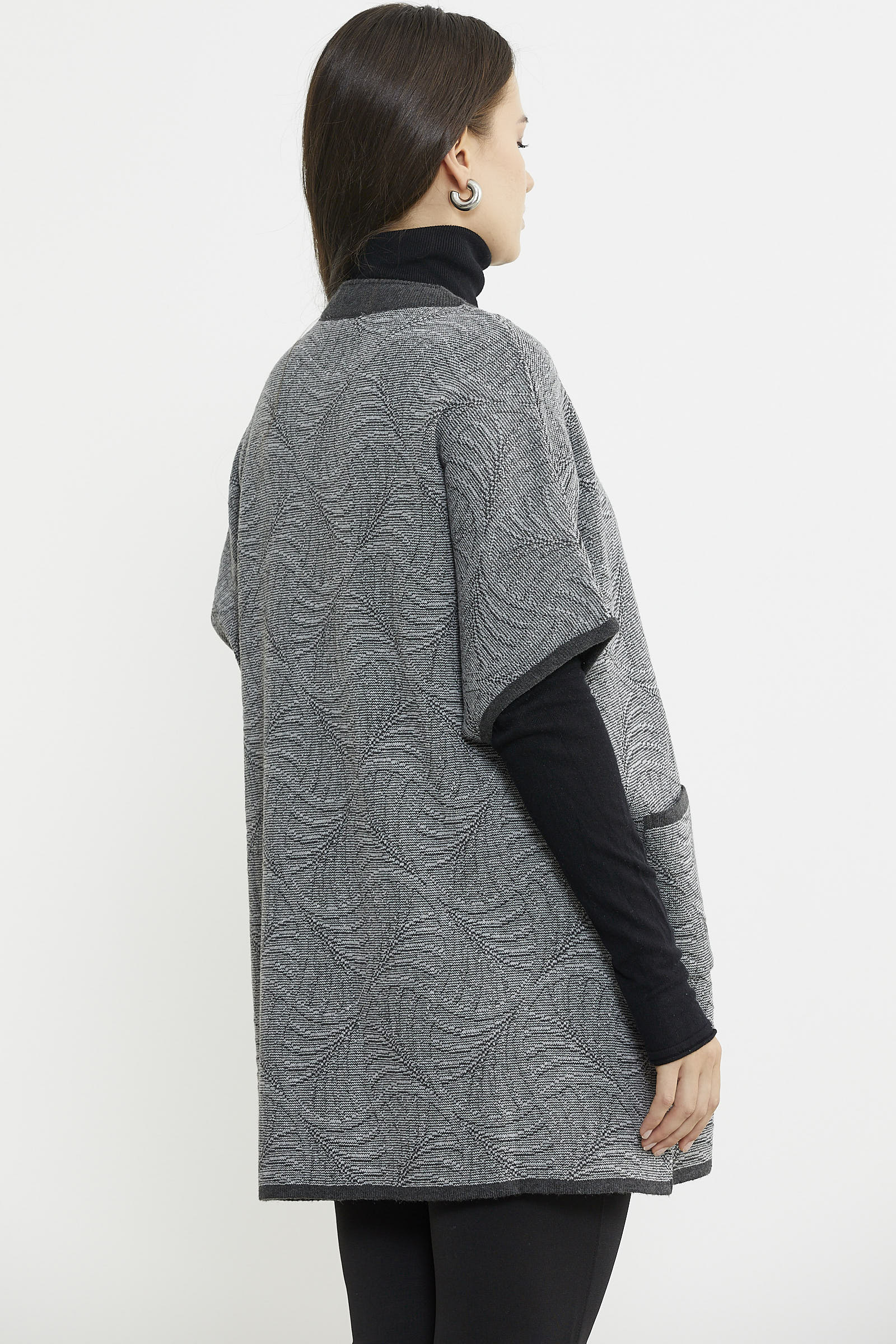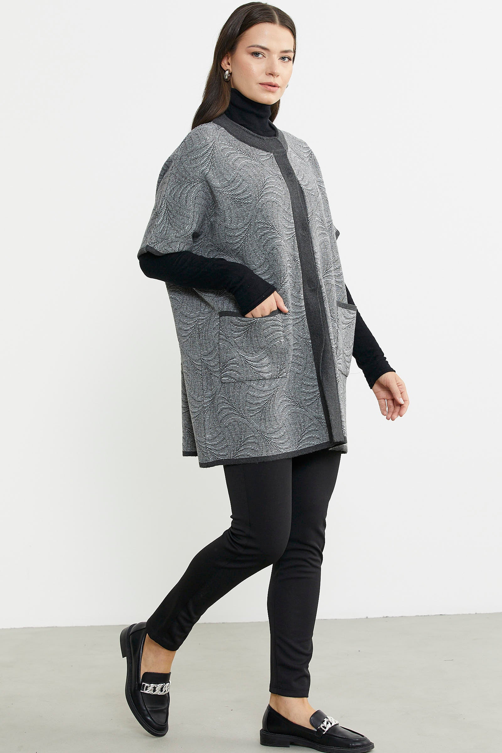 Jakarlı örgünün düz biyeyle birlikte kullanıldığı cepli triko hırka tunik boy üretilmiştir. Yüksek oranda yün içerir.