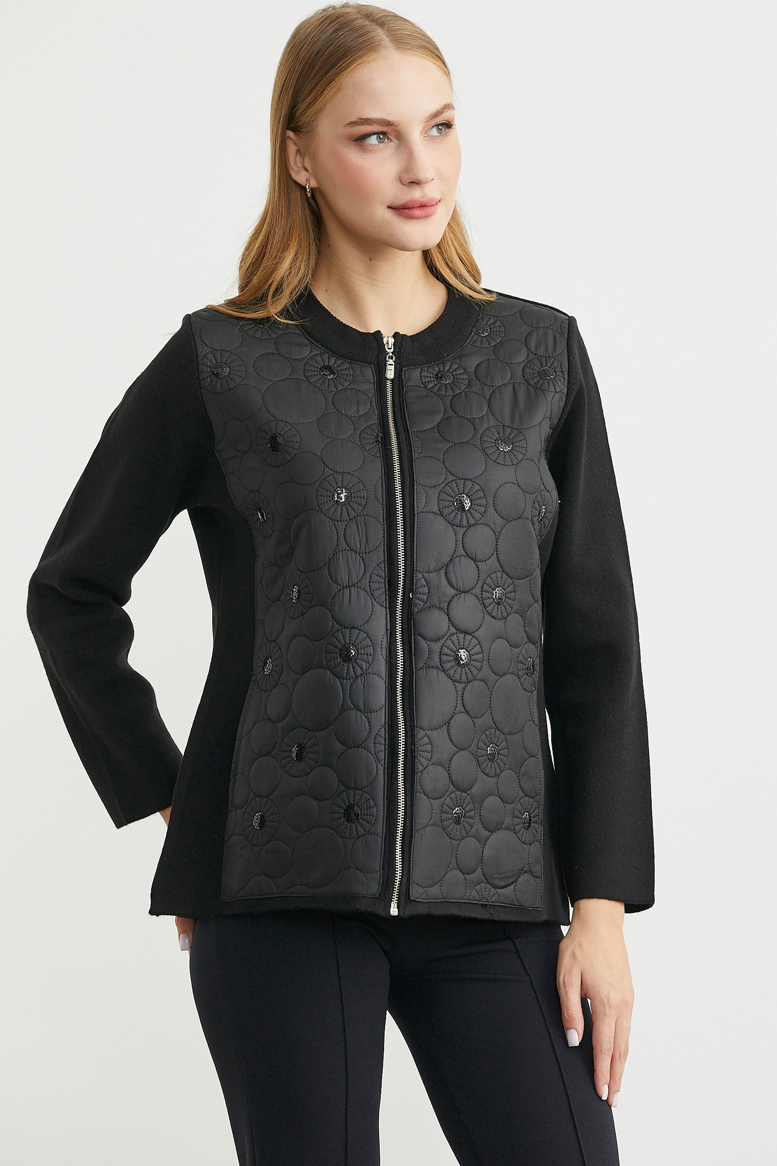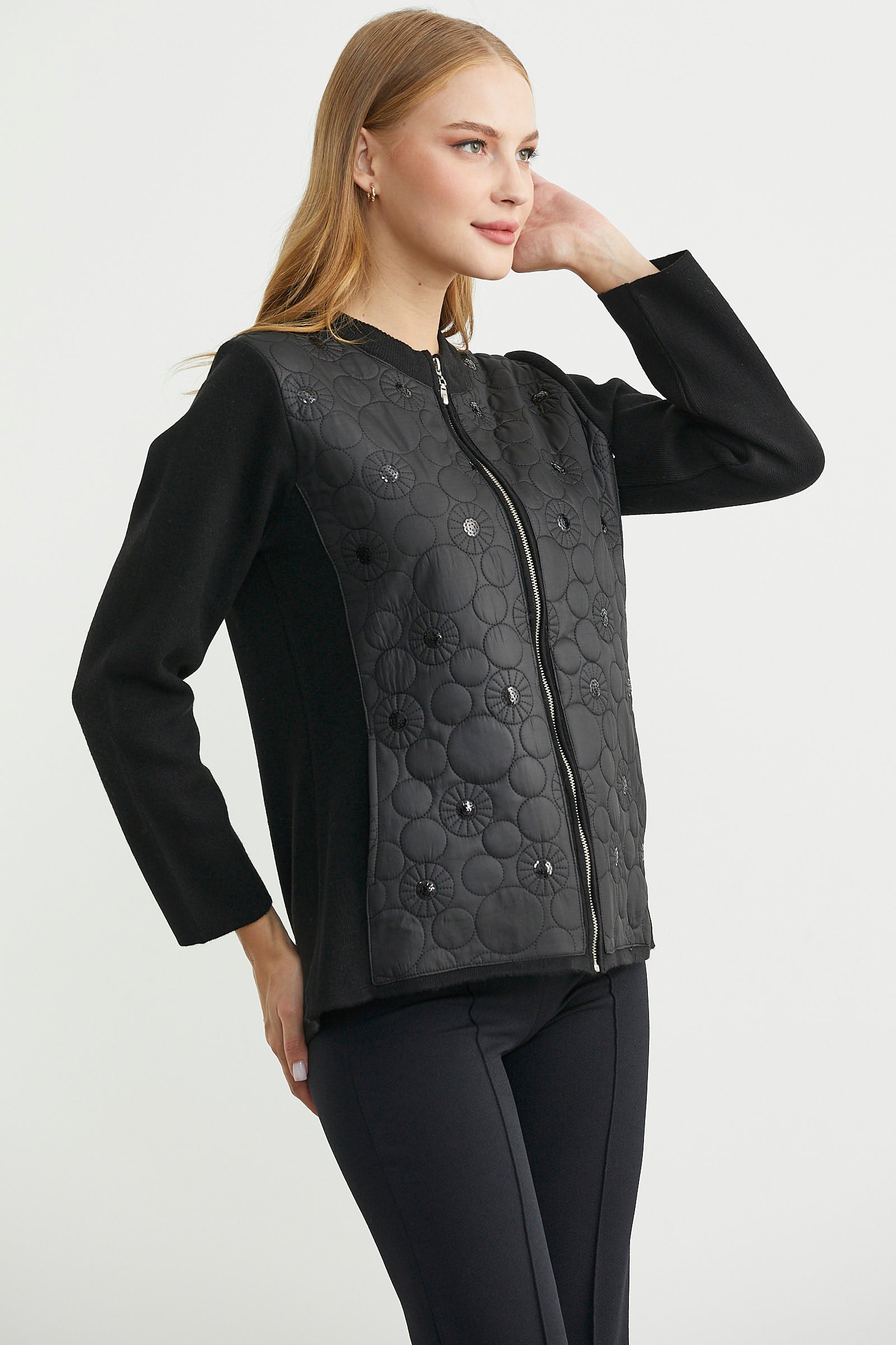 Ön bedene kapitone detayı hakim, yünlü triko ceket. Fermuar kapamalıdır. Ara boy, rahat kalıptır.