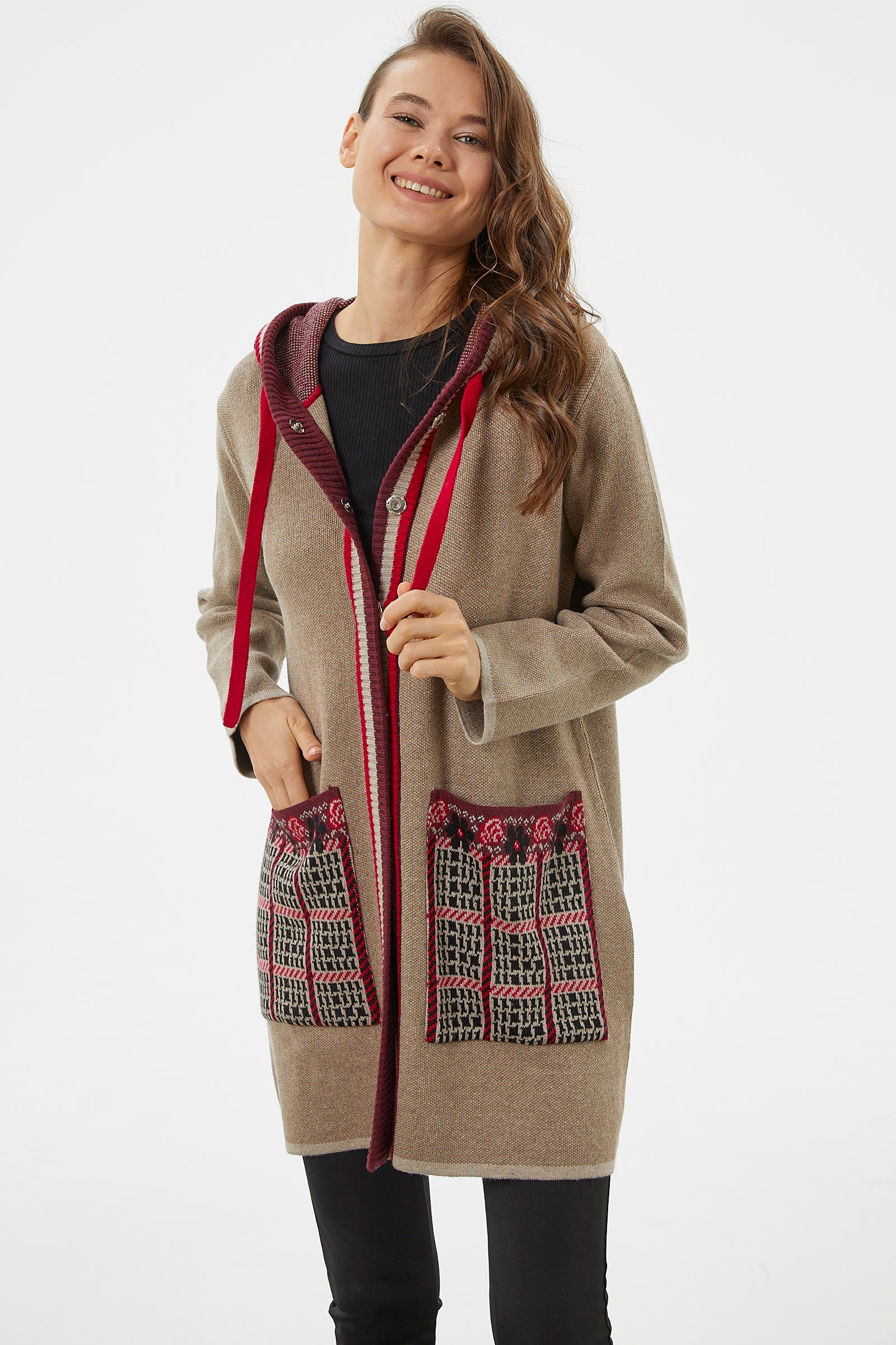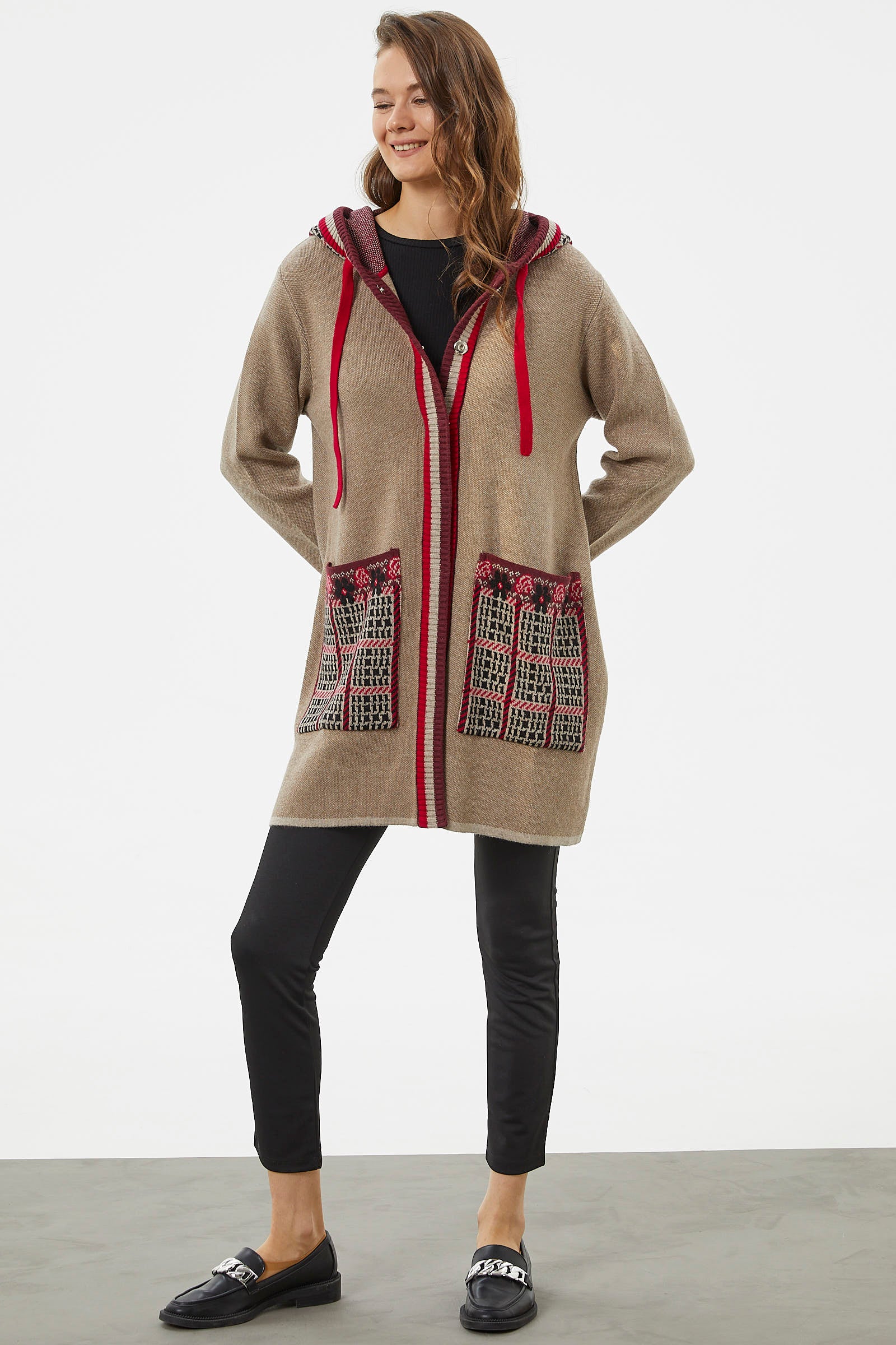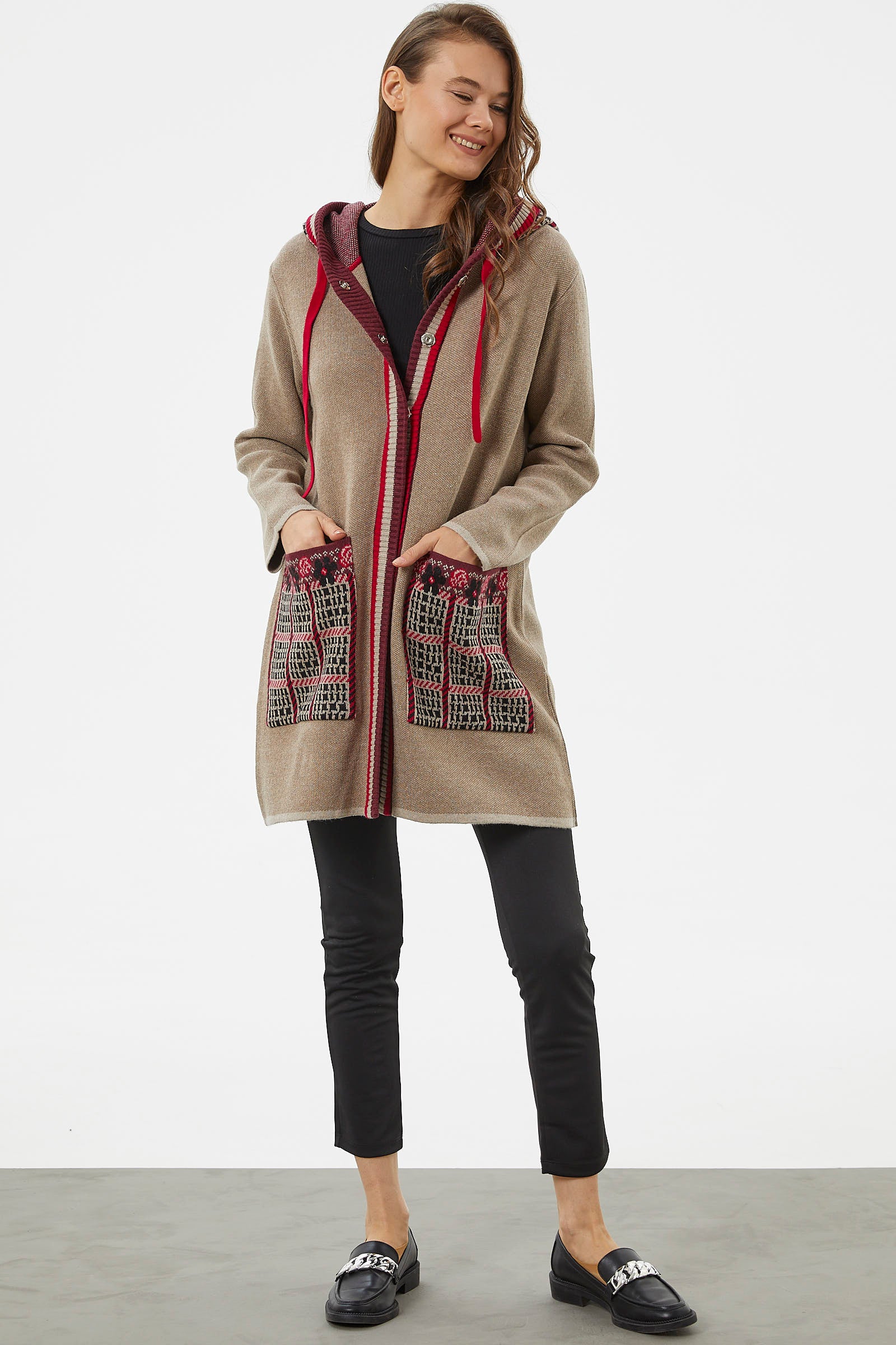 Kararsız günlerinizde kombininizi rahatlıkla tamamlayabileceğiniz iki cepli, ayarlanabilir kapüşonlu triko uzun ceket renkli desenleriyle canlı bir görünüm yaratmanızı sağlayacaktır.