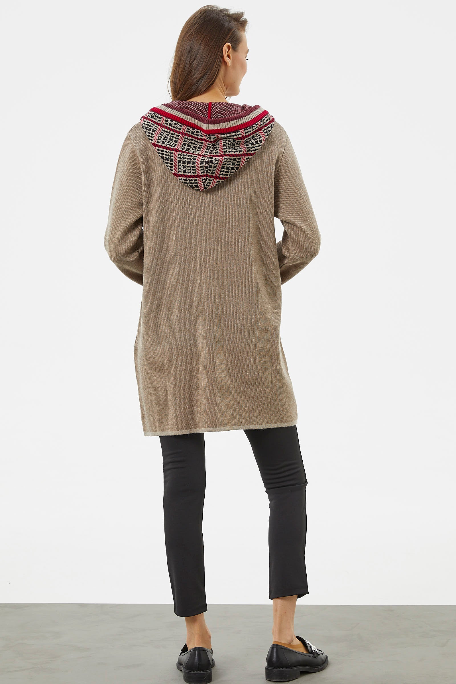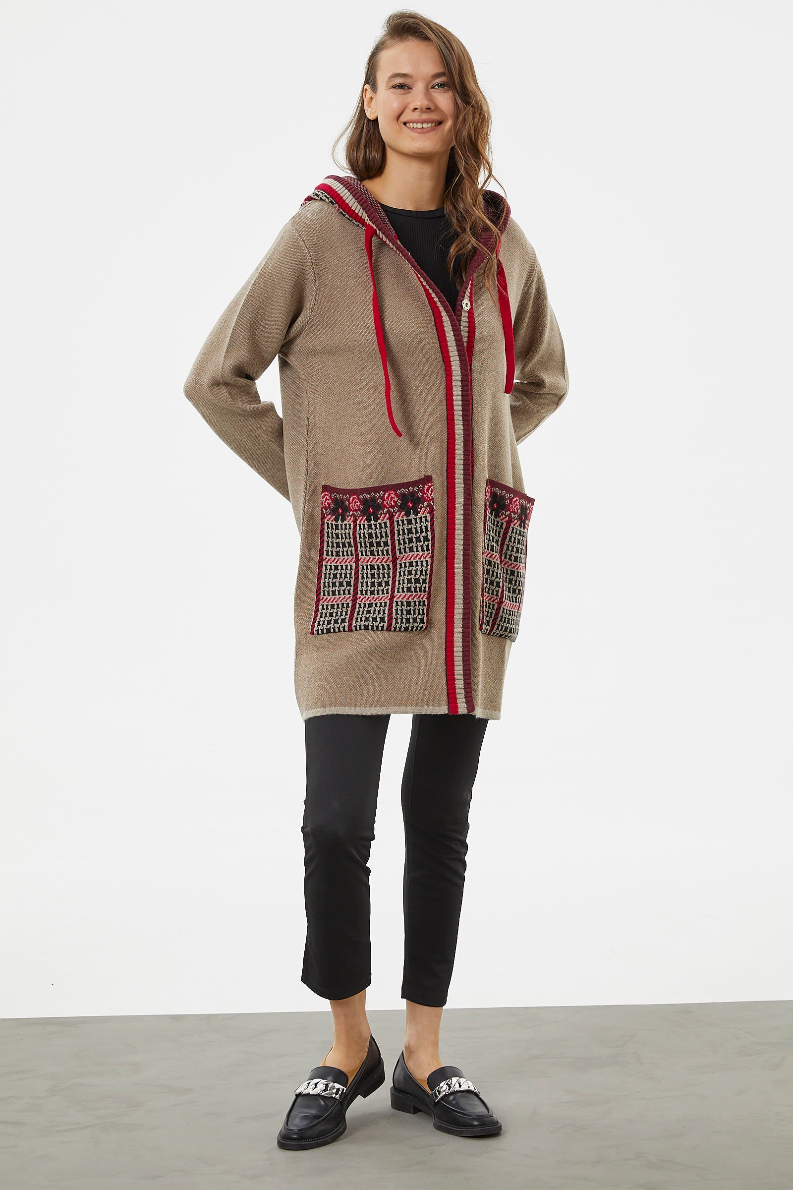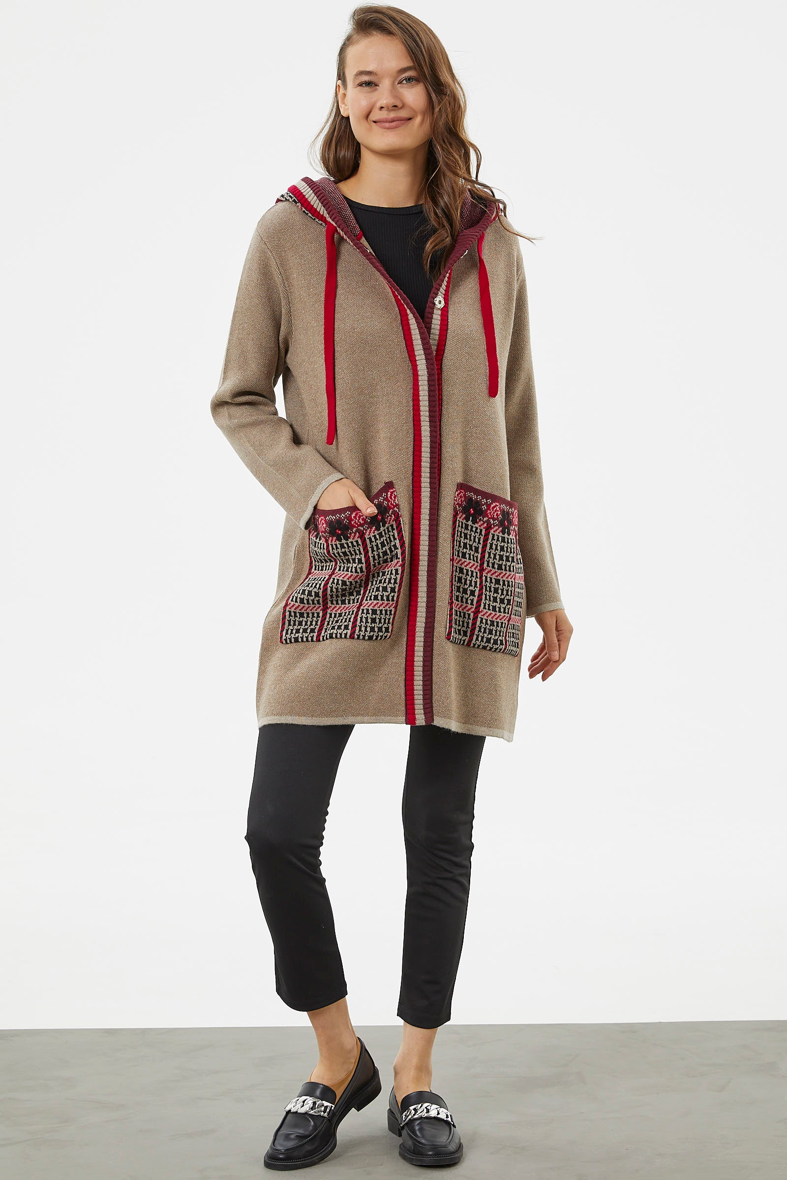 Kararsız günlerinizde kombininizi rahatlıkla tamamlayabileceğiniz iki cepli, ayarlanabilir kapüşonlu triko uzun ceket renkli desenleriyle canlı bir görünüm yaratmanızı sağlayacaktır.