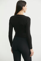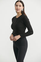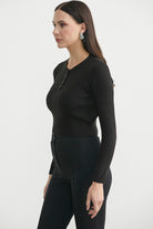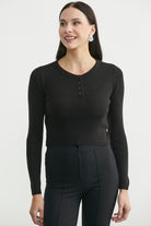 Lastik örgü, vücudu saran, yuvarlak yaka, düğmeli kısa triko kazak.