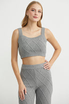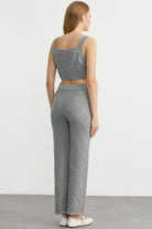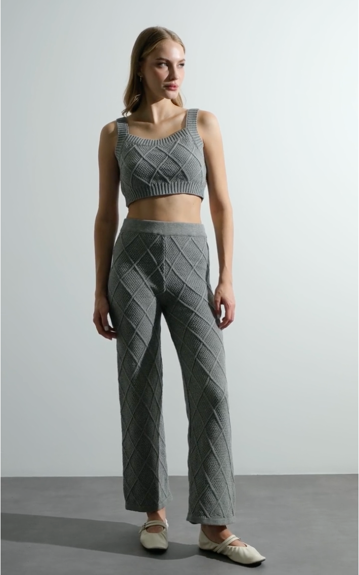 Motifli triko takım, crop ve pantolondan oluşmaktadır. Beli lastiklidir. Düz paçalı ve yumuşak dokuludur.