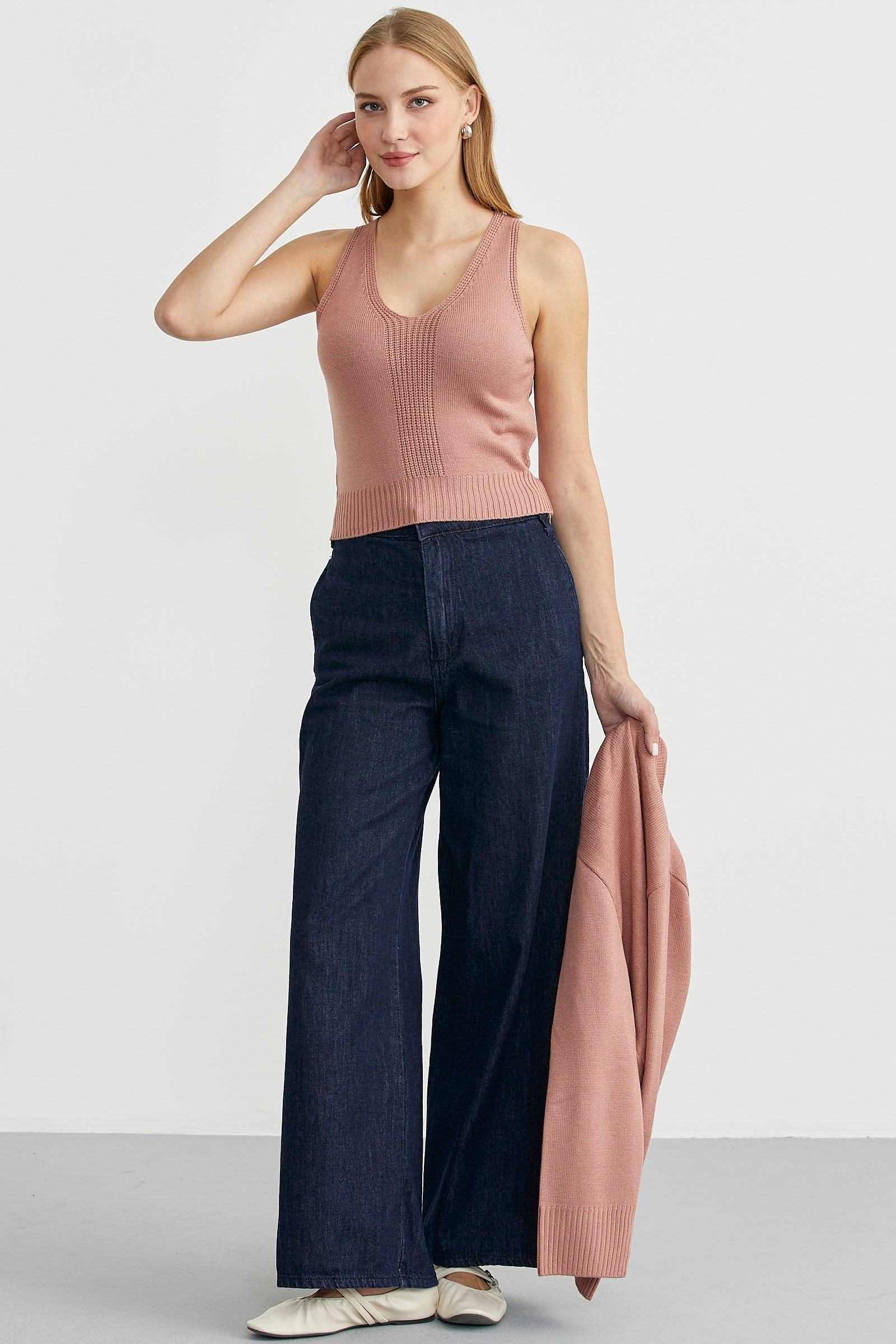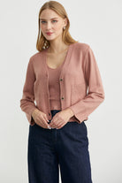 Triko ikili set. Kolsuz askılı triko crop ve triko hırkadan oluşmaktadır. Cepli, düğme kapamalı.
